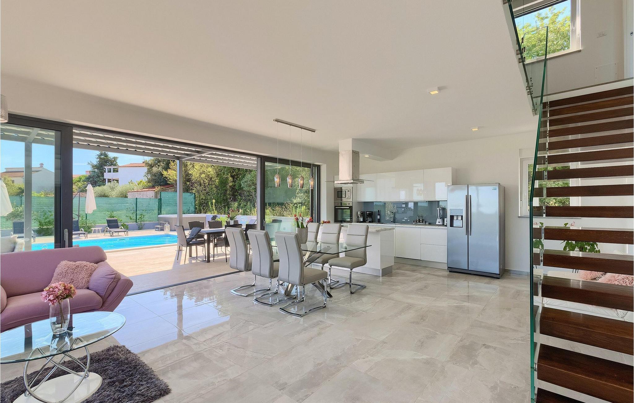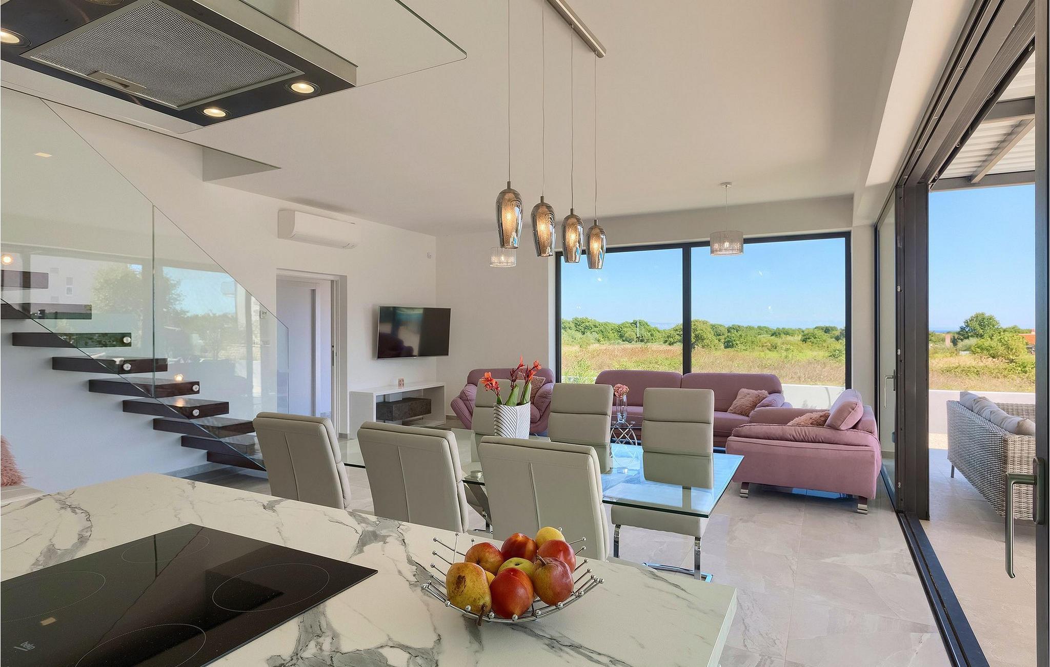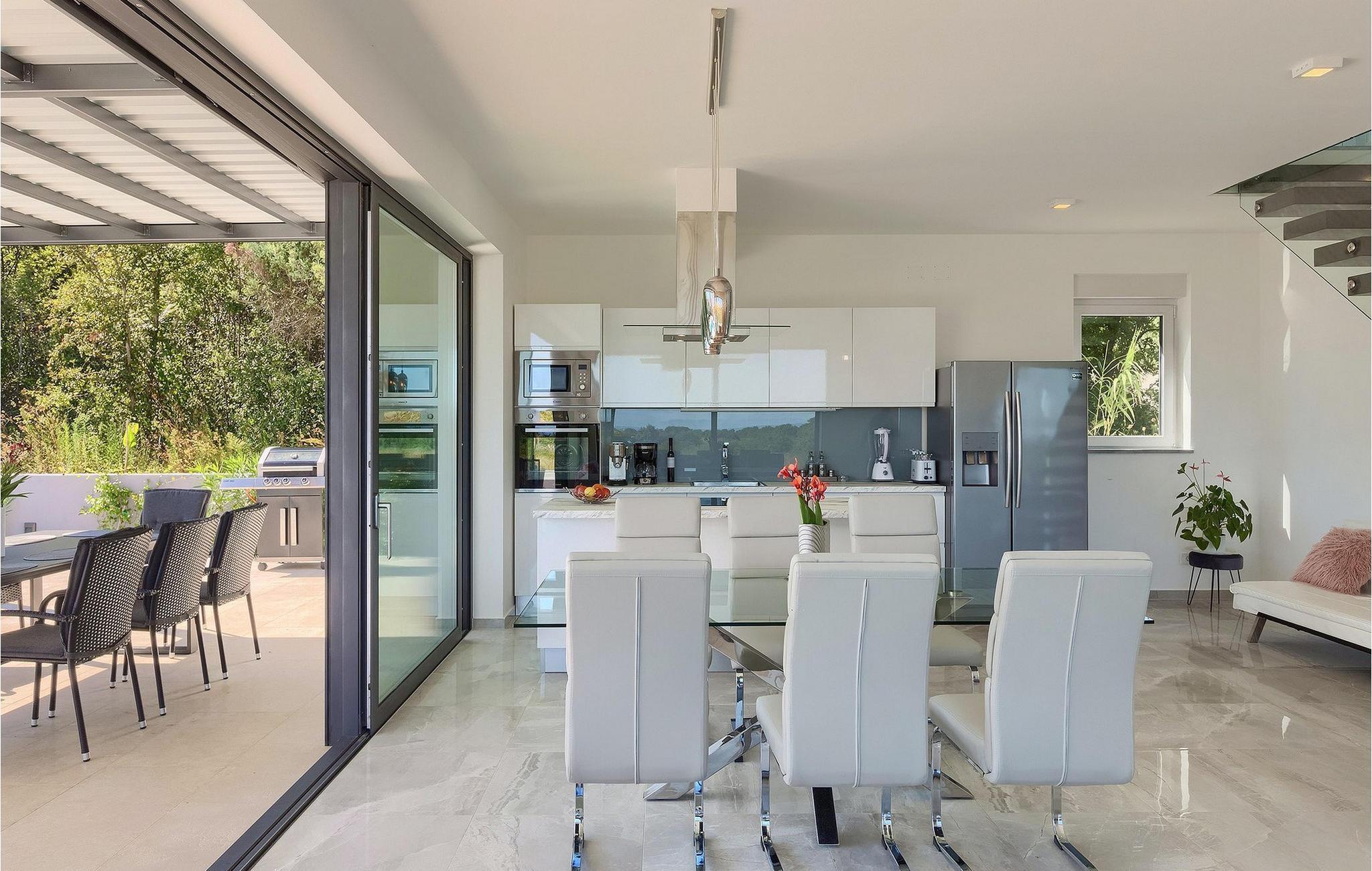 Et moderne åbent opholdsområde med et fuldt udstyret køkken og elegant spiseplads er placeret i stueetagen og giver direkte adgang til udendørsområdet, hvor et spisebord og grill også er til rådighed.