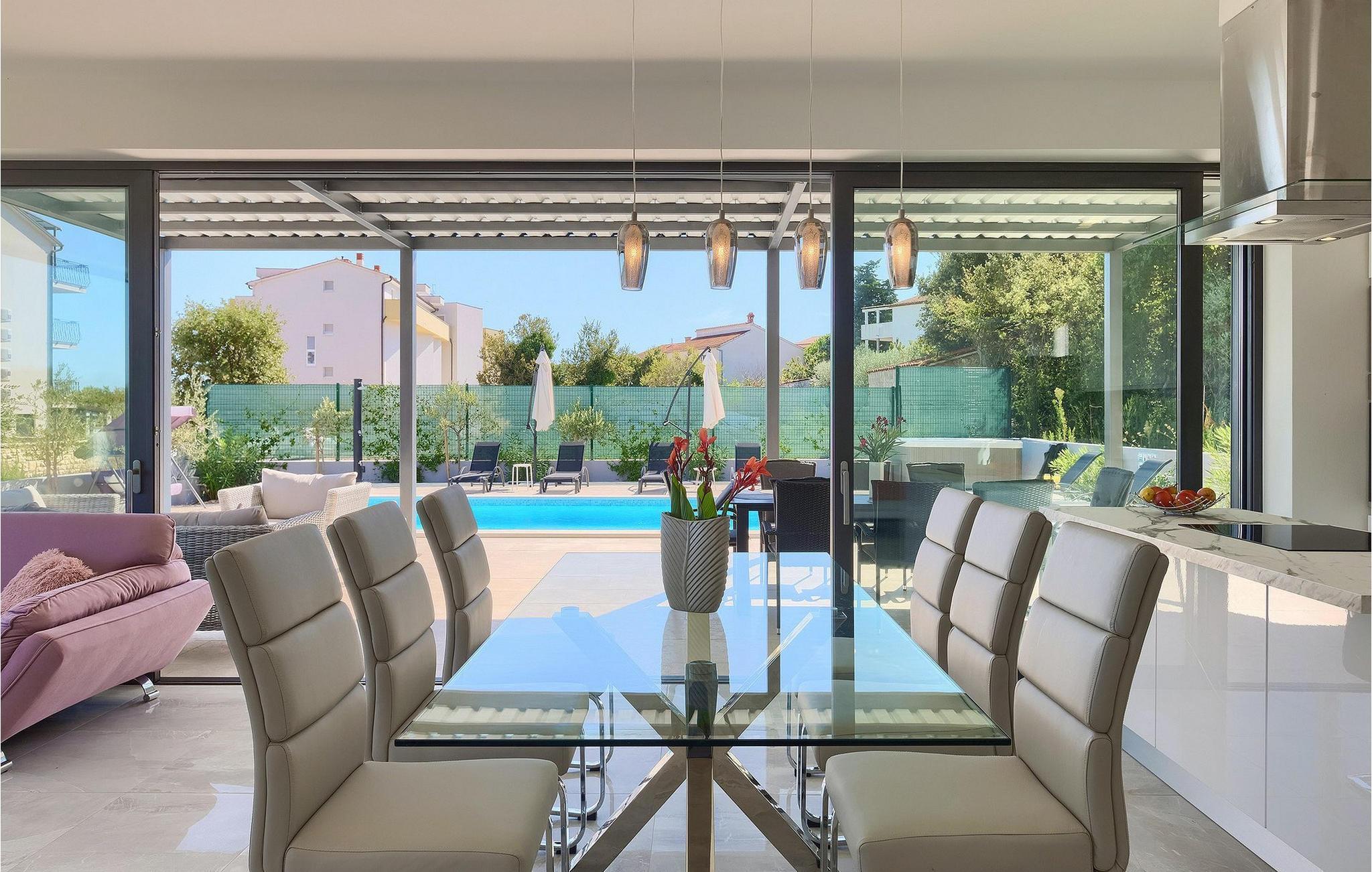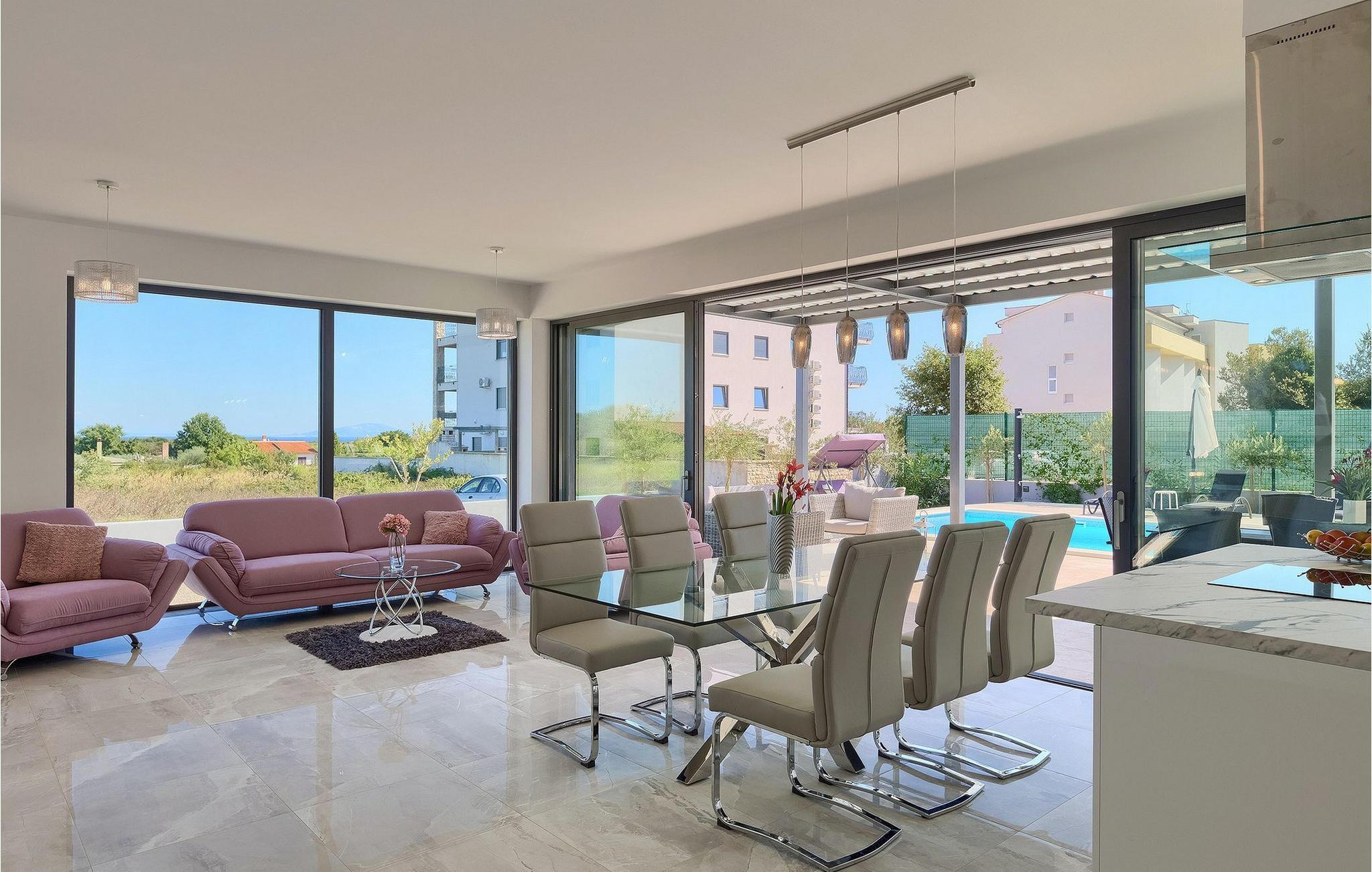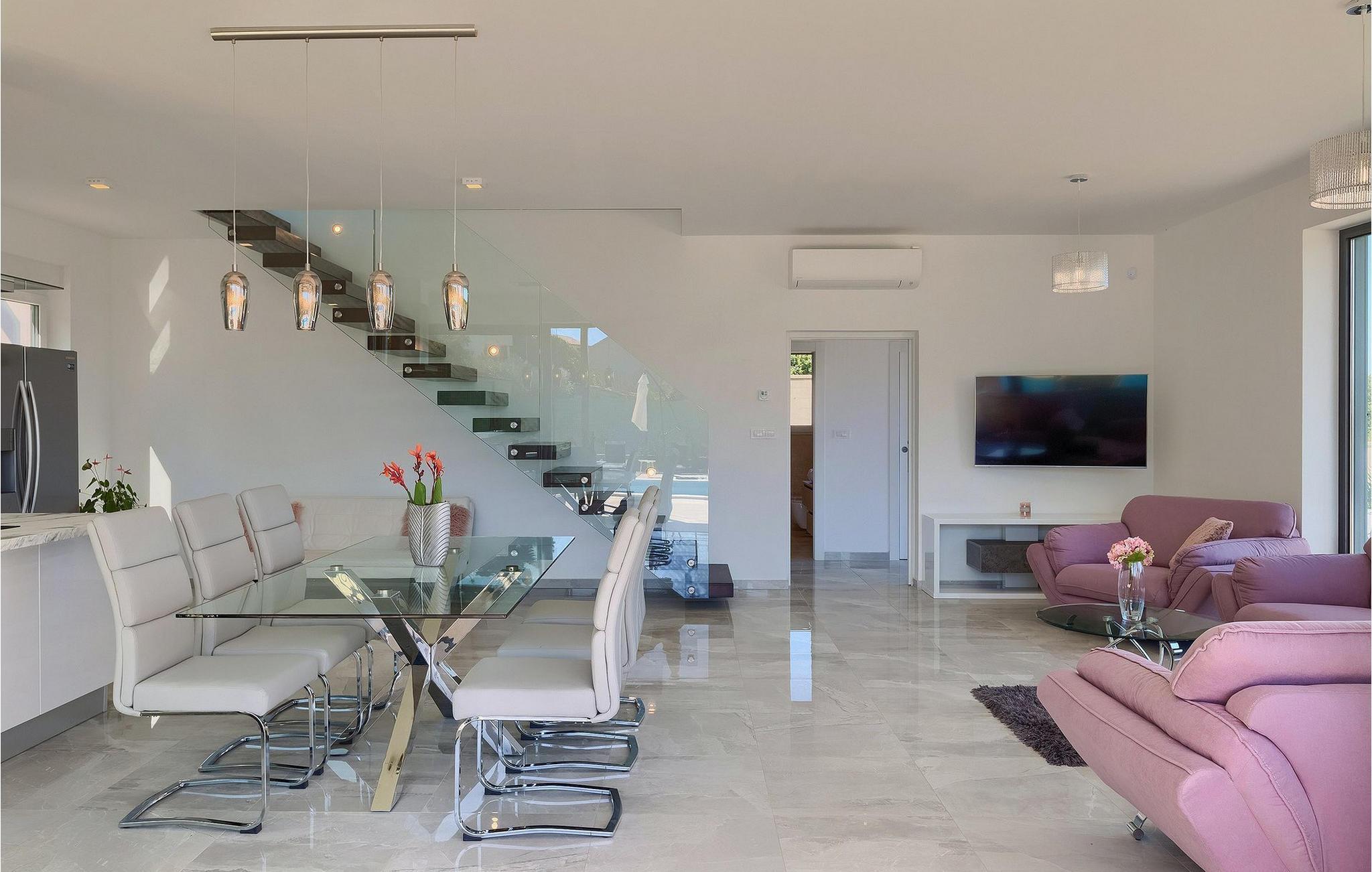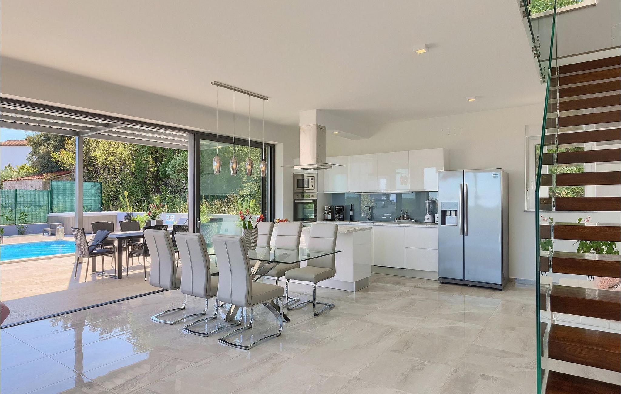 Et moderne åbent opholdsområde med et fuldt udstyret køkken og elegant spiseplads er placeret i stueetagen og giver direkte adgang til udendørsområdet, hvor et spisebord og grill også er til rådighed.