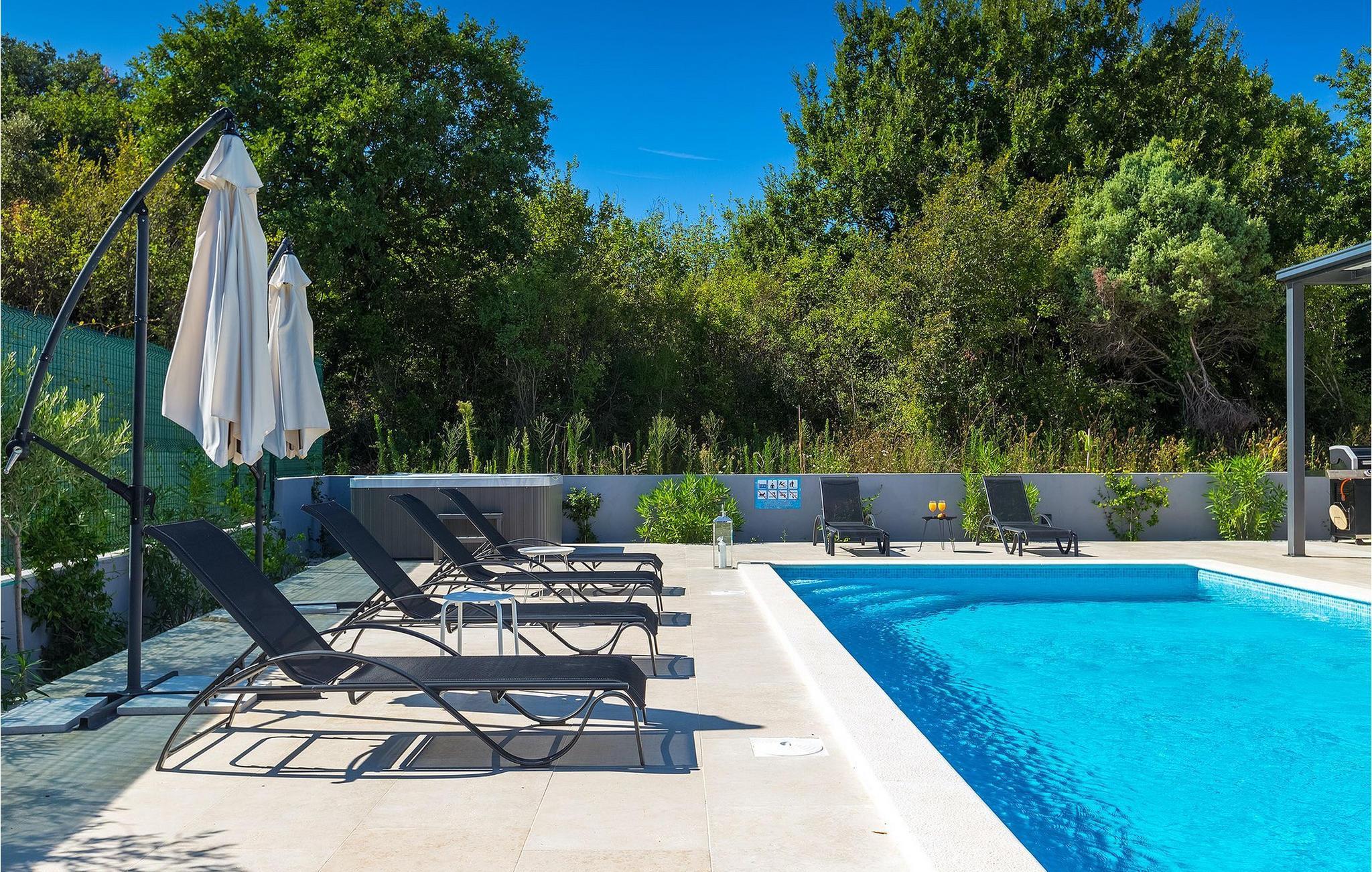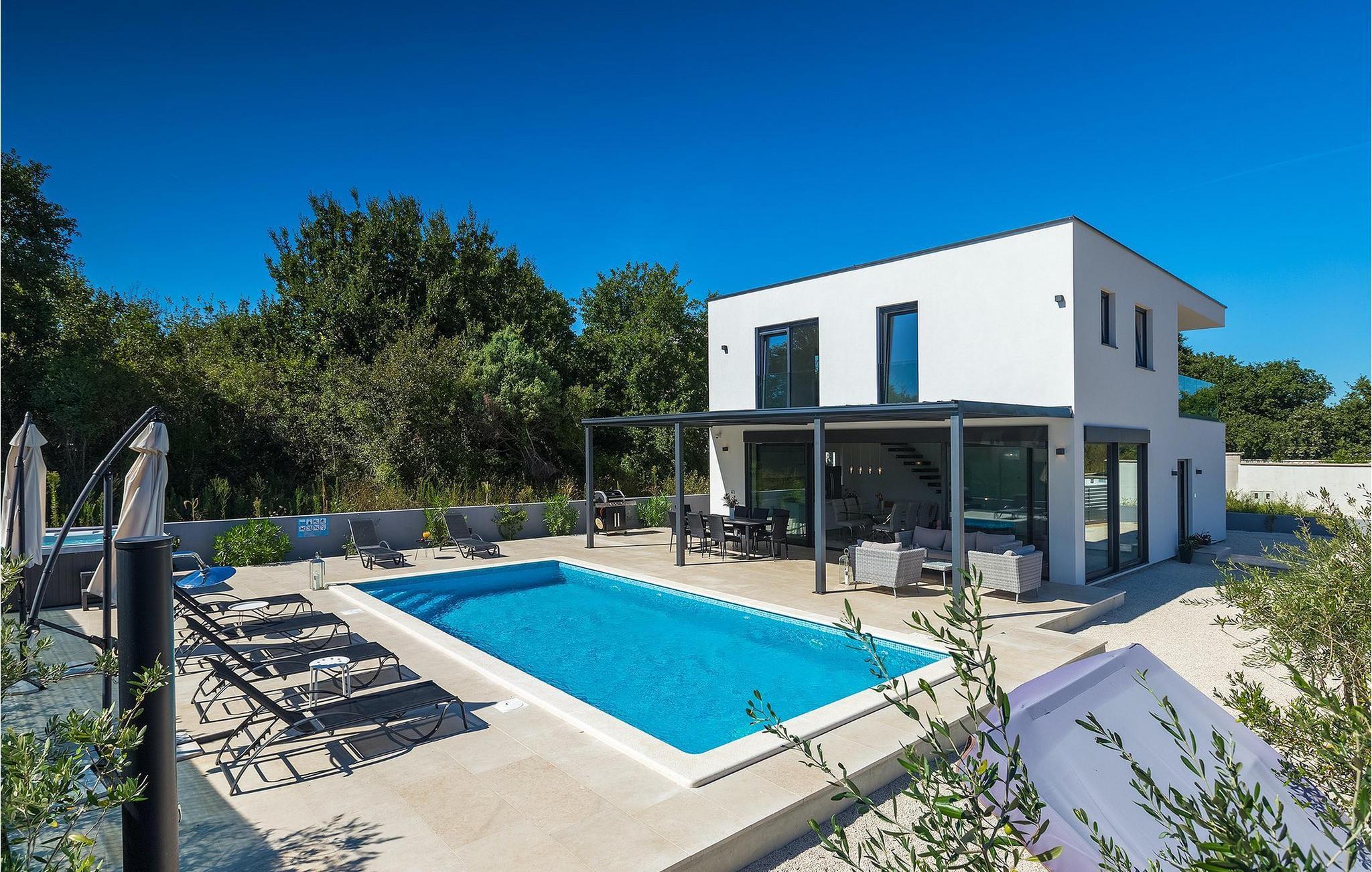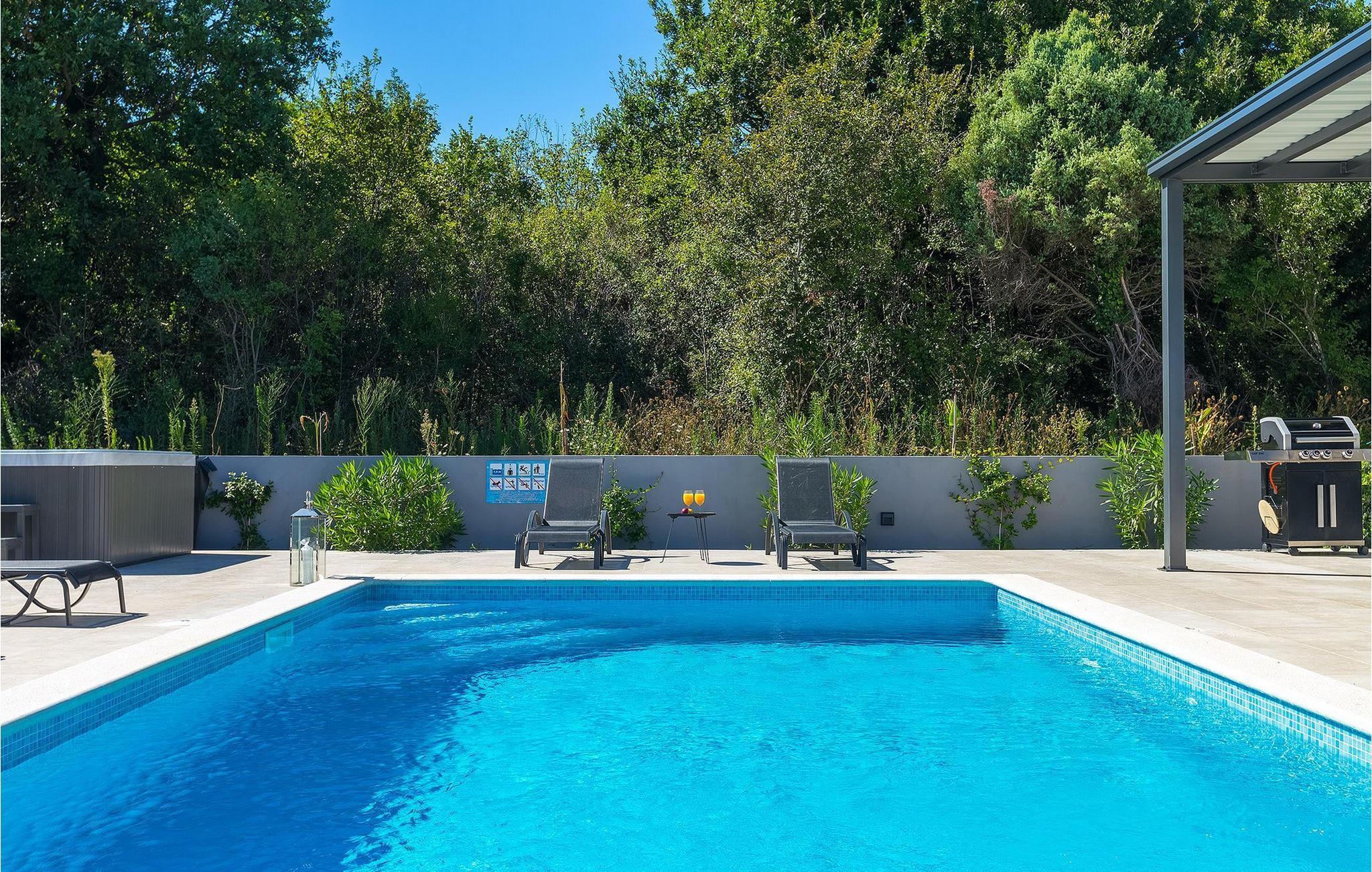 Den private pool giver tiltrængt forfriskning på varme sommerdage, mens villaen også er udstyret med et udendørs spabad og en finsk sauna, perfekt egnet til koldere aftener.