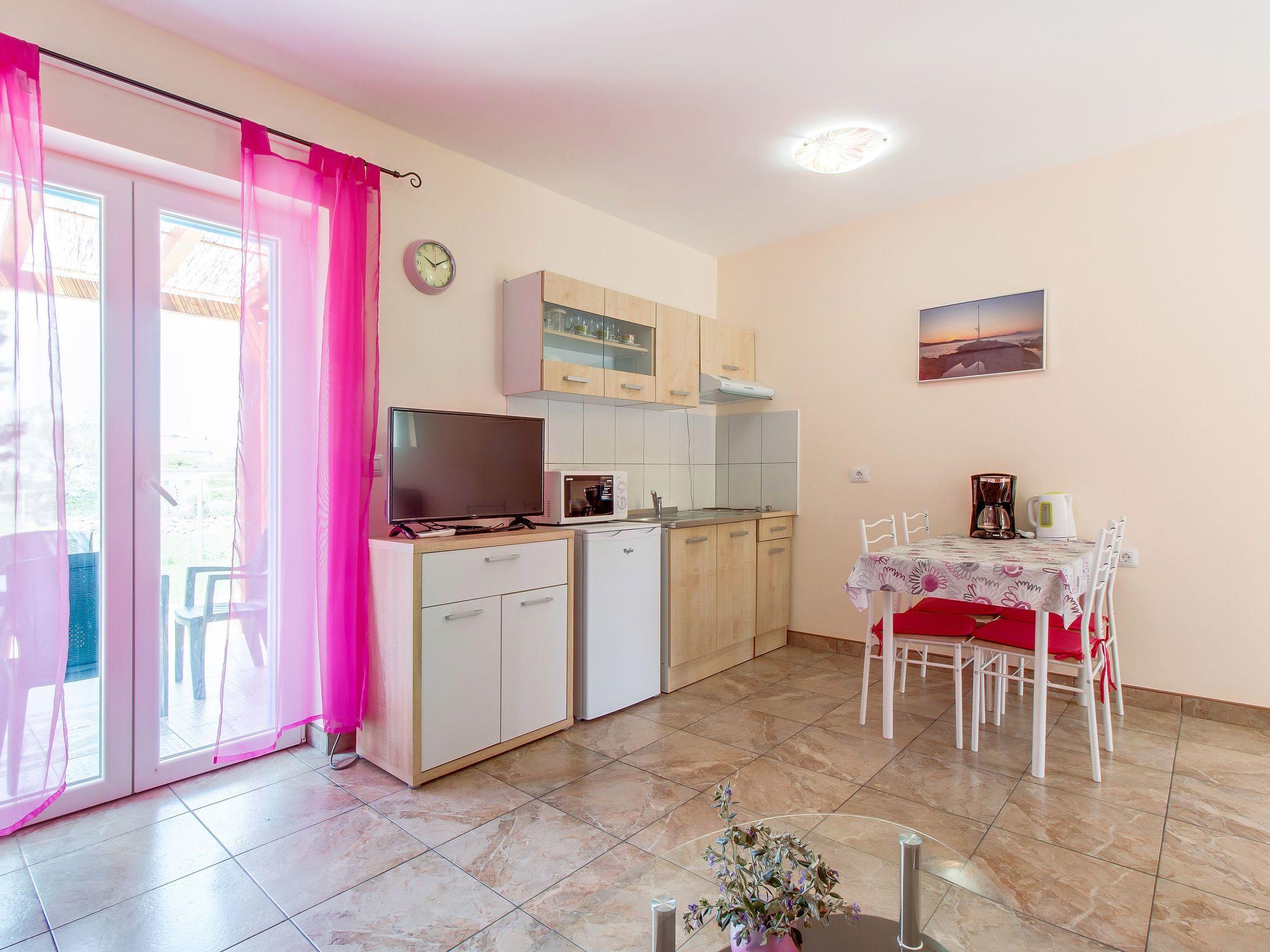Apartment *** consists of fully equipped kitchen with dining area and a living room, one bedroom with double bed dimension 160x200 cm , bathroom (toilet / shower / hair dryer) and terrace in front of the apartment with garden furniture. In the living room there is a sofa that can serve as an extra bed for one person.The apartment has air condition, satellite TV, WiFi Internet .The kitchen is equipped with an Electric stove for cooking, kitchenett and fridge. Also available is a coffe maker, microwave, ketlle and toaster.