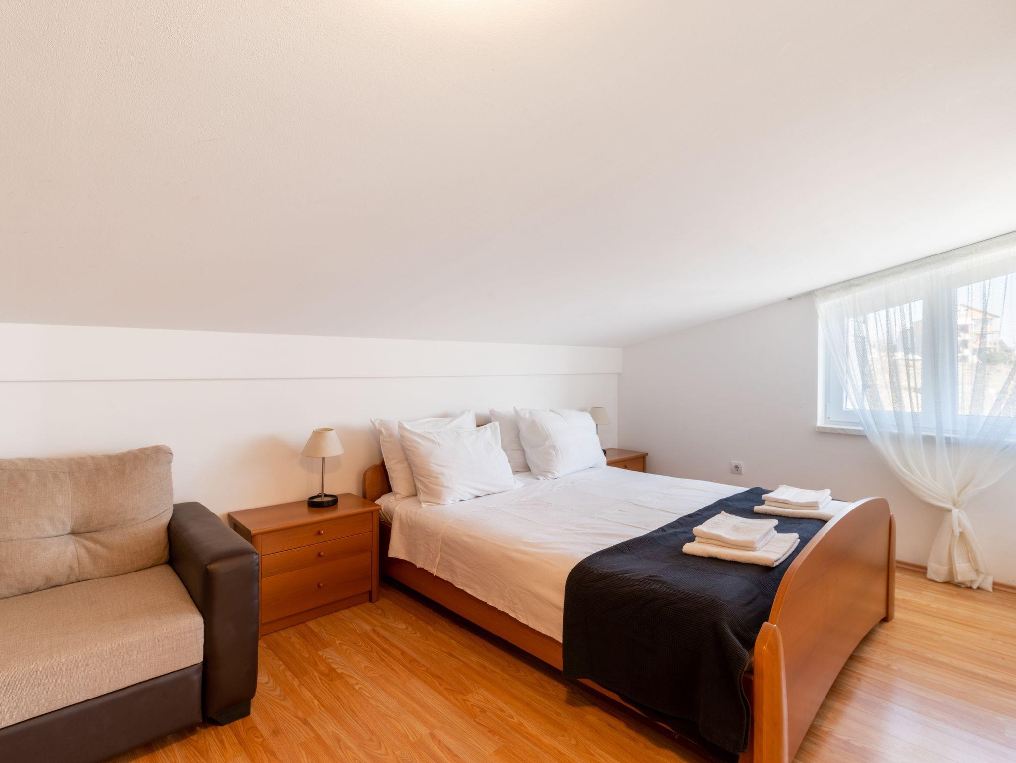 Ferienwohnung bietet Platz für 6 Gäste. Die Betten sind in Schlafzimmern, die es 3 gibt, innerhalb einer Gesamtfläche von 74m2, angeordnet. Die Gäste haben einen eigenen Balkon zur Verfügung, auf der sie in warmen Sommernächten genießen können. Das Apartment bietet Meerblick. Es ist erlaubt, Speisen auf dem Gemeinschafts-Grill vorzubereiten. In der Unterkunftseinheit besteht die Möglichkeit des Mitbringens von Haustieren gegen Aufpreis. Die reservierte Unterkunftseinheit verfügt über einen gemeinsame Terrasse. IM PREIS INBEGRIFFEN: Kurtaxe, Endreinigung, Klimatisierung, Parkplatz, Internet, Bügeleisen, Bügelbrett, Föhn. VERBINDLICHE ZUSÄTZLICHE KOSTEN: Aufzahlung für Kurzaufenthalte (prozentualer Zuschlag pro Nächtigungsanzahl: 30% - 1, 20% - 2, 10% - 3). UNVERBINDLICHE ZUSÄTZLICHE KOSTEN: Haustiere (20,00 € pro Nacht), Zusatzbett (10,00 € pro Nacht). Die Verfügbarkeit zusätzlicher Dienstleistungen in Ihrem reservierten Termin und die Preise derselben (falls nicht aufgeführt) müssen im Voraus überprüft werden. Zusätzliche Dienstleistungen die in der Zahlungsaufforderung nicht aufgeführt sind werden direkt beim Vermieter bezahlt, angenommen der Gast nutzt auch diese. Ermäßigung auf den Grundpreis: Gratistag 14=13 (bei einem Aufenthalt von 14 Tagen oder mehr erhalten Sie einen Gratistag für den Aufenthalt bis 31.12.26).