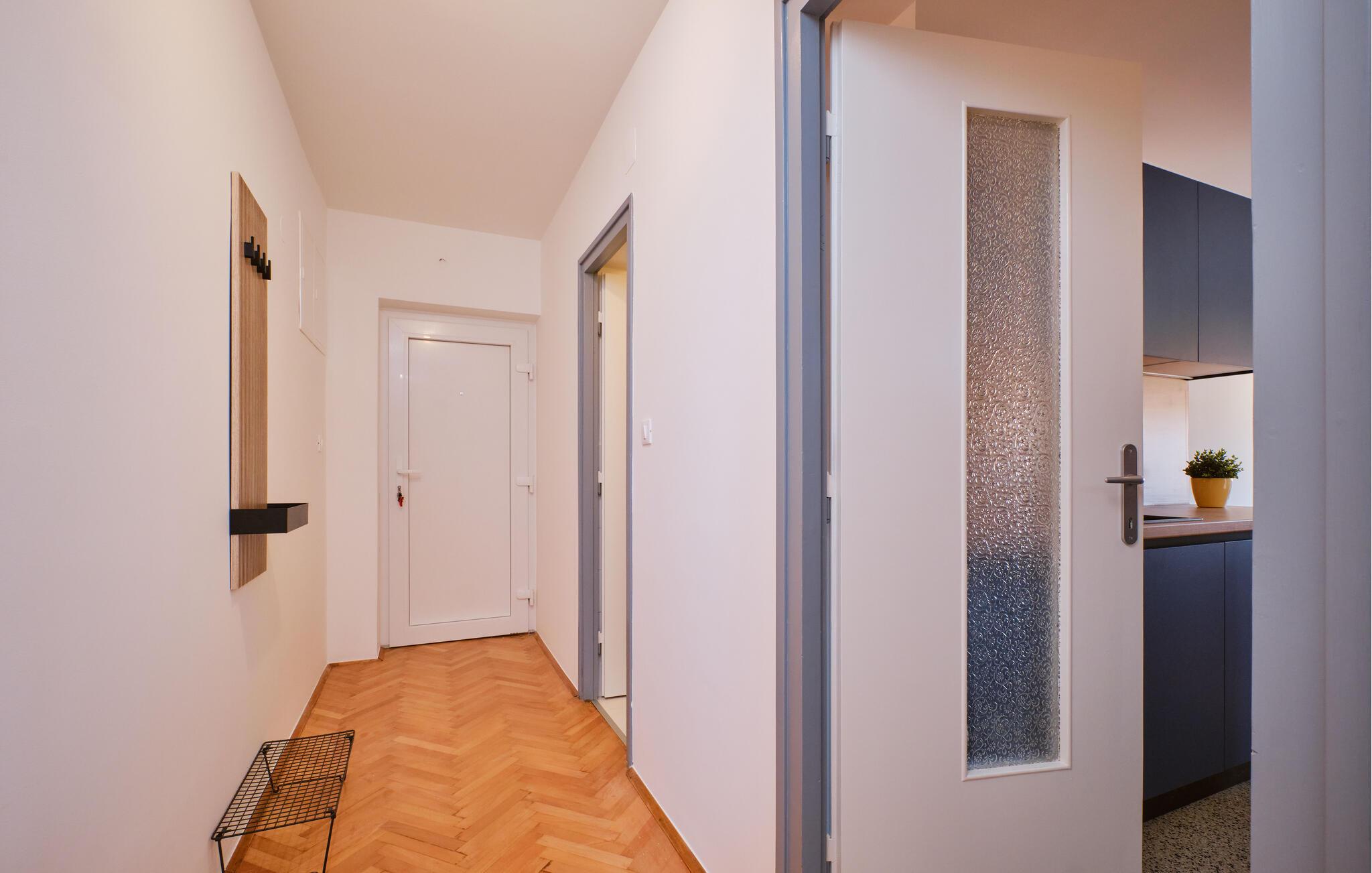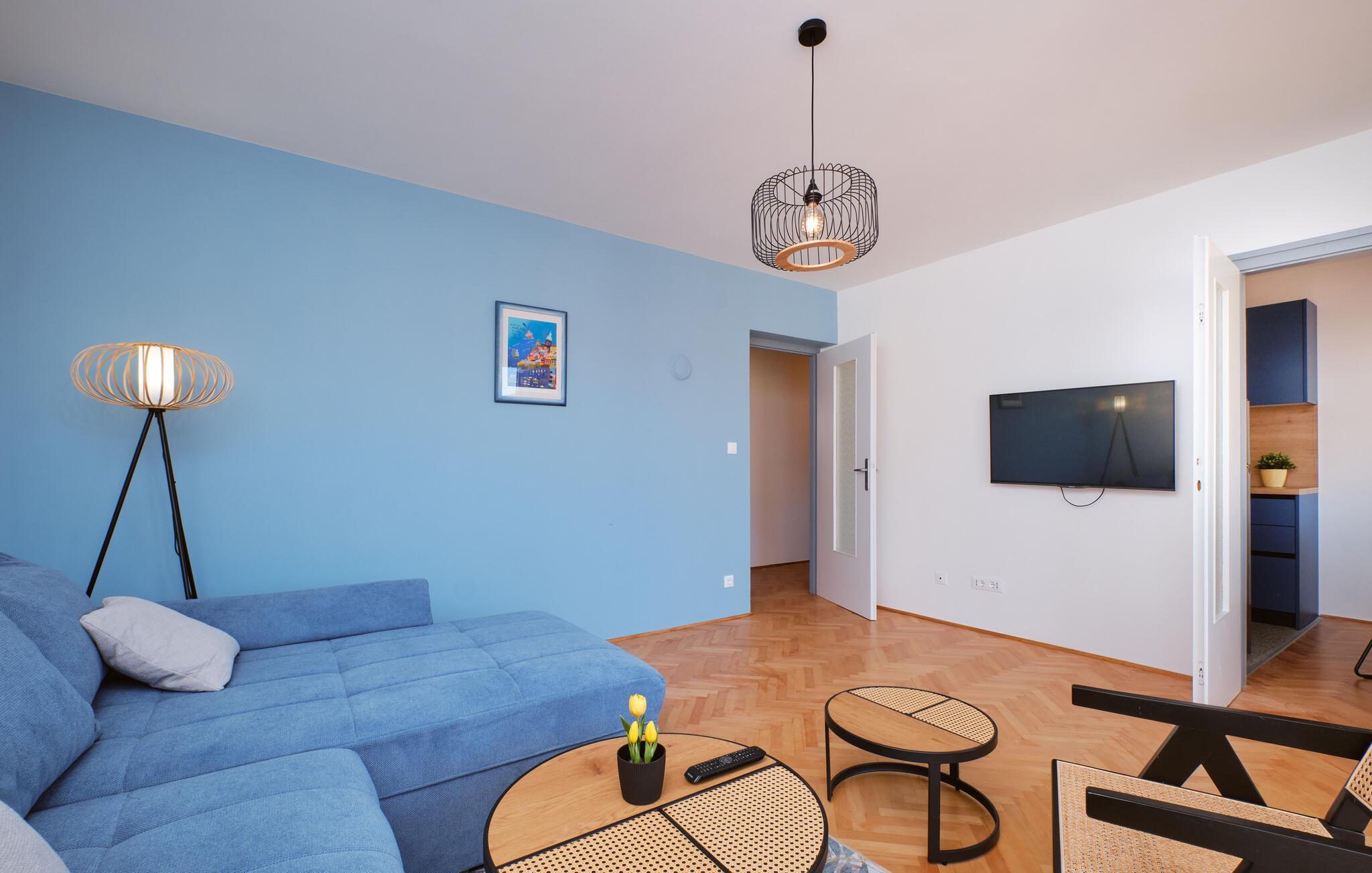 Denne moderne lejlighed kombinerer elegance og komfort på harmonisk vis. Gulv-til-loft-vinduer lader masser af varmt naturligt lys komme ind, mens I nyder en smuk udsigt over byen og havet. Middelhavsfarver, et varmt trælook og et komfortabelt sofaområde sikrer et afslappende ophold. Uanset om I lytter til god musik eller laver mad sammen, sætter I her tempoet for dagen.