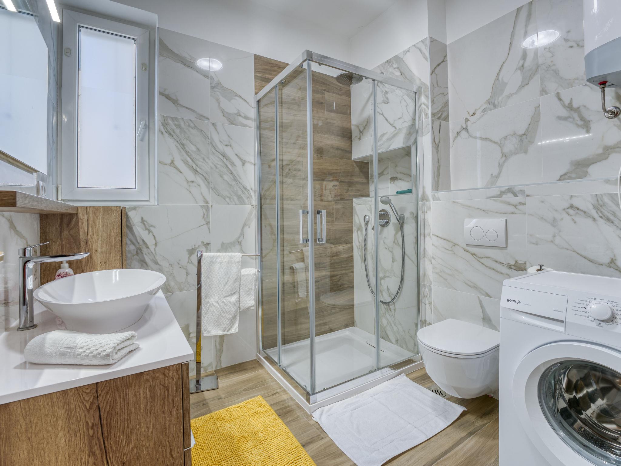 2-room apartment 60 m2, on the ground floor. Living/dining room with 1 double sofabed (155 cm, length 200 cm), cable TV (flat screen), air conditioning. Exit to the terrace. 1 room with 1 french bed (160 cm, length 200 cm). Open kitchen (1 hot plate, oven, 3 gas rings, toaster, kettle, microwave, freezer, electric coffee machine). Shower/WC. No heating option. Terrace 15 m2. Terrace furniture. Beautiful panoramic view of the sea. Facilities: washing machine. Internet (WiFi, free). Garage (1 car). Please note: non-smoking house. Private entrance.