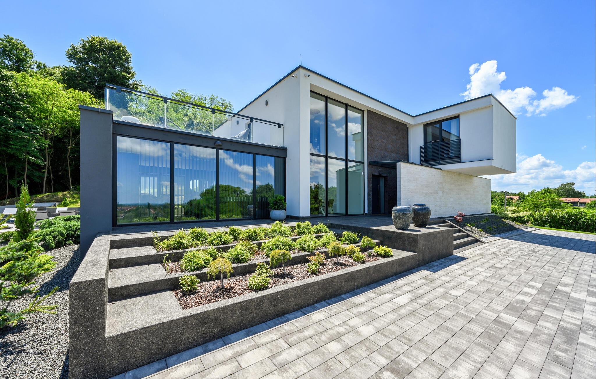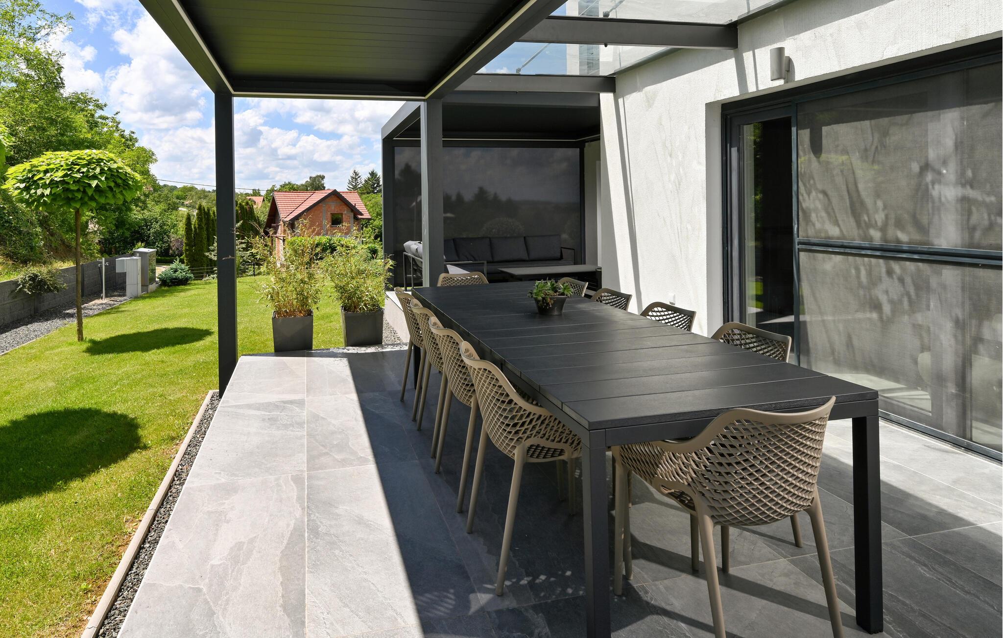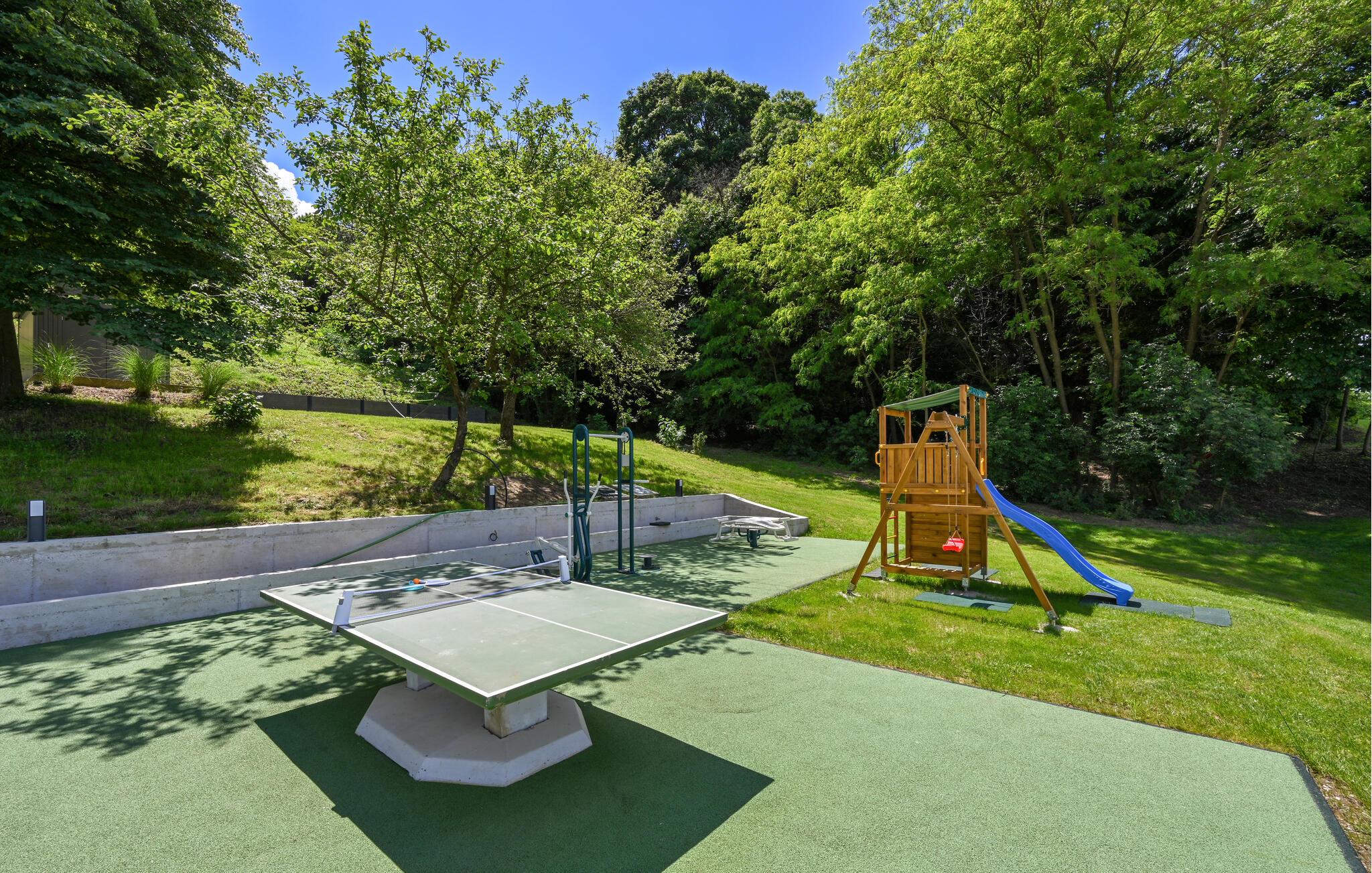 Udeområdet er tilsvarende lækkert. Her kan I nyde solen på tagterrassen og finde skygge på den overdækkede terrasse med grill og udekøkken, hvor I kan kræse om livretterne i det gode vejr. I løbet af dagen kan I få pulsen op på tennisbanen, snuppe et slag minigolf, lade børnene lege på deres helt egen legeplads og køle jer af i poolen, når varmen er ved at få jer.