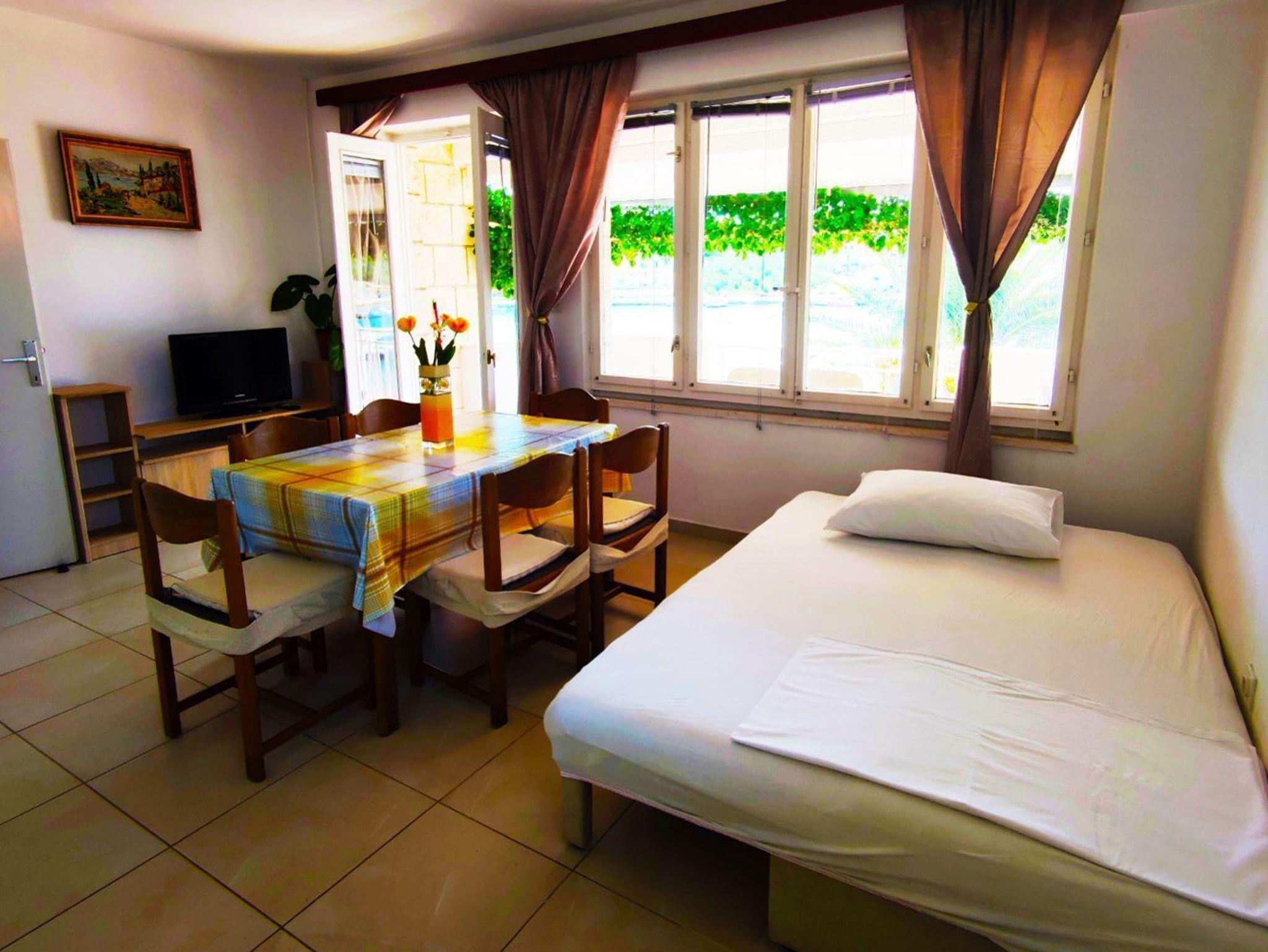 Ferienwohnung bietet Platz für 4 Gäste. Die Betten sind in Schlafzimmern, die es 1 gibt, und in Esszimmer, innerhalb einer Gesamtfläche von 41m2, angeordnet. Die Gäste haben eine eigene Terrasse zur Verfügung, auf der sie in warmen Sommernächten genießen können. Das Apartment bietet Meerblick. Es ist erlaubt, Speisen auf dem Gemeinschafts-Grill vorzubereiten. IM PREIS INBEGRIFFEN: Kurtaxe, Endreinigung, Parkplatz, Internet, Bootsanlegeplatz, Kinderbett, Bügeleisen, Föhn, tragbarer Grill. VERBINDLICHE ZUSÄTZLICHE KOSTEN: Aufzahlung für Kurzaufenthalte (prozentualer Zuschlag pro Nächtigungsanzahl: 30% - 1, 20% - 2, 10% - 3). UNVERBINDLICHE ZUSÄTZLICHE KOSTEN: Klimatisierung (5,00 € pro Nacht), Wäschewaschen (6,00 € Waschen). Die Verfügbarkeit zusätzlicher Dienstleistungen in Ihrem reservierten Termin und die Preise derselben (falls nicht aufgeführt) müssen im Voraus überprüft werden. Zusätzliche Dienstleistungen die in der Zahlungsaufforderung nicht aufgeführt sind werden direkt beim Vermieter bezahlt, angenommen der Gast nutzt auch diese.