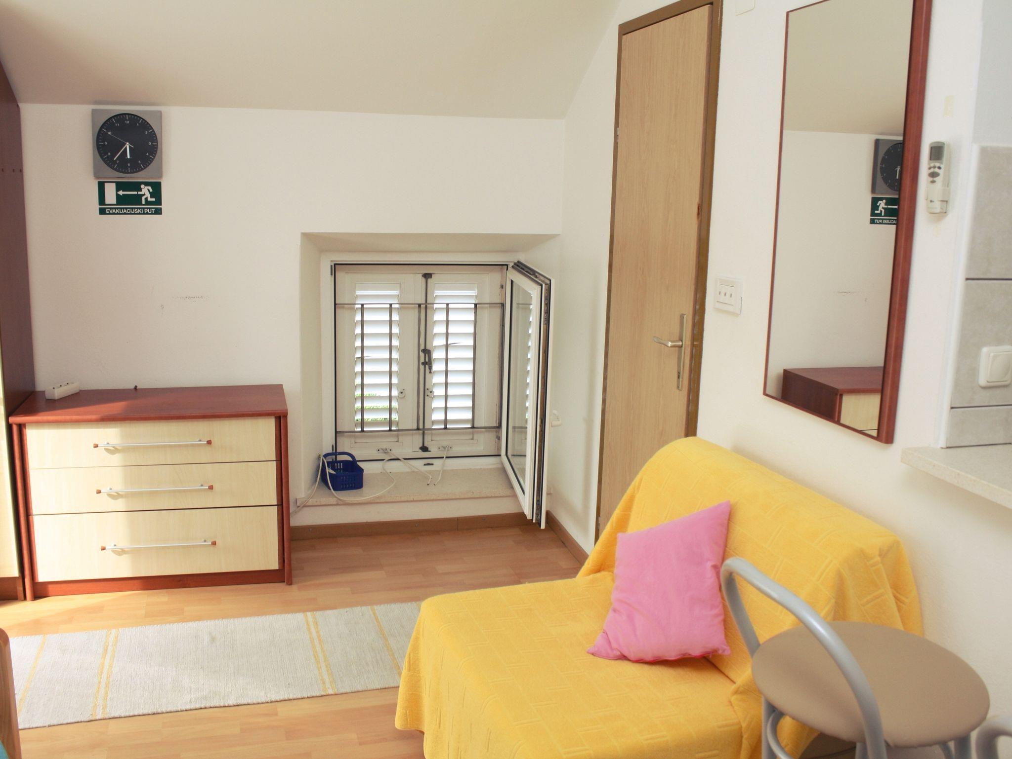 Studio bietet Platz für 2 Gäste. Die Betten sind in Schlafzimmern, die es 1 gibt, innerhalb einer Gesamtfläche von 26m2, angeordnet. Die Gäste haben einen eigenen Balkon zur Verfügung, auf der sie in warmen Sommernächten genießen können. Das Studio-Apartment bietet Meerblick. Es ist erlaubt, Speisen auf dem Gemeinschafts-Grill vorzubereiten. In der Unterkunftseinheit besteht die Möglichkeit des Mitbringens von Haustieren, und die Dienstleistung ist im Preis der Unterkunft enthalten. IM PREIS INBEGRIFFEN: Kurtaxe, Endreinigung, Klimatisierung, Parkplatz, Internet, Haustiere, Bügeleisen. VERBINDLICHE ZUSÄTZLICHE KOSTEN: Aufzahlung für Kurzaufenthalte (prozentualer Zuschlag pro Nächtigungsanzahl: 30% - 1, 20% - 2, 10% - 3). Die Verfügbarkeit zusätzlicher Dienstleistungen in Ihrem reservierten Termin und die Preise derselben (falls nicht aufgeführt) müssen im Voraus überprüft werden. Zusätzliche Dienstleistungen die in der Zahlungsaufforderung nicht aufgeführt sind werden direkt beim Vermieter bezahlt, angenommen der Gast nutzt auch diese.