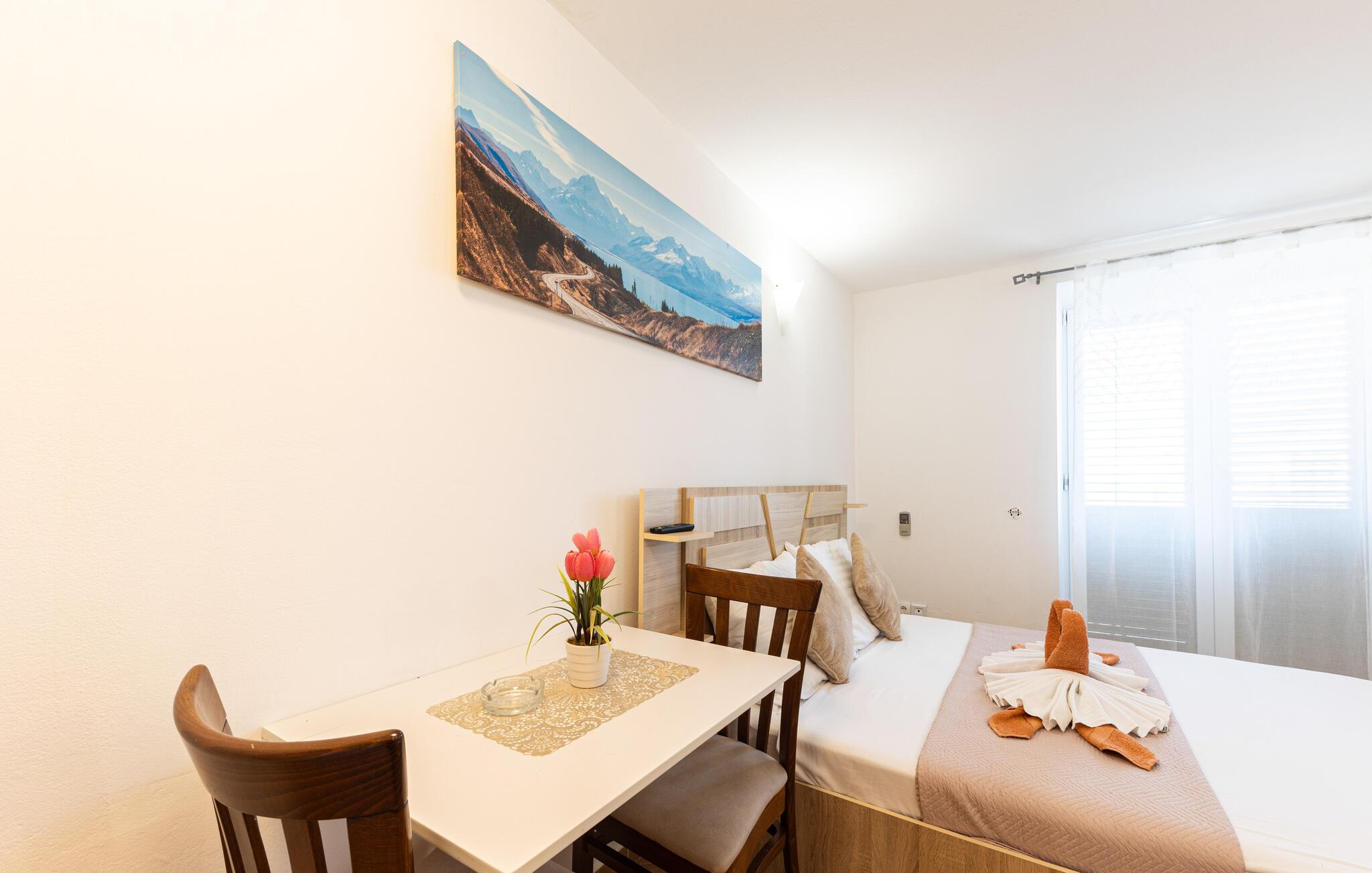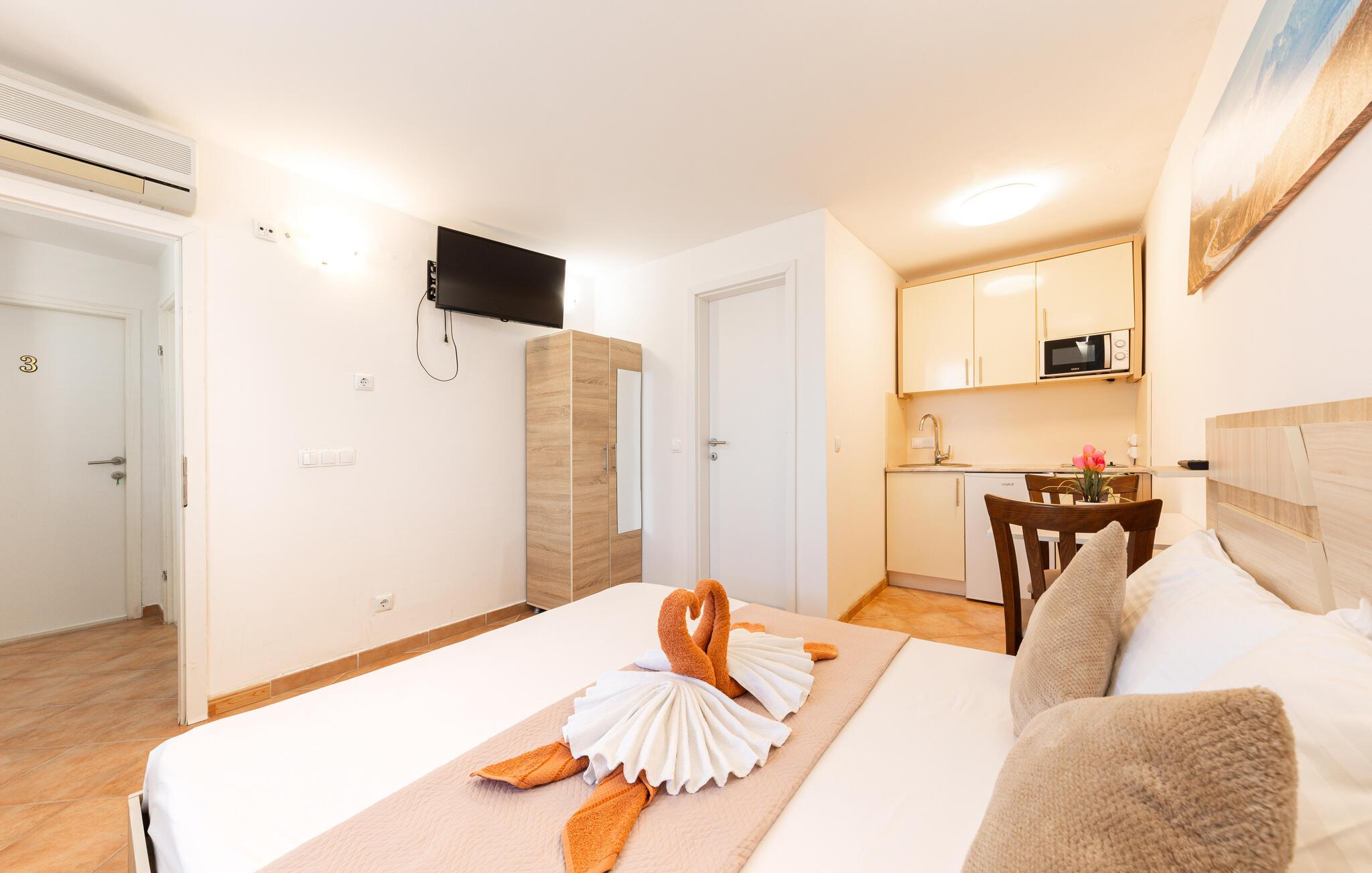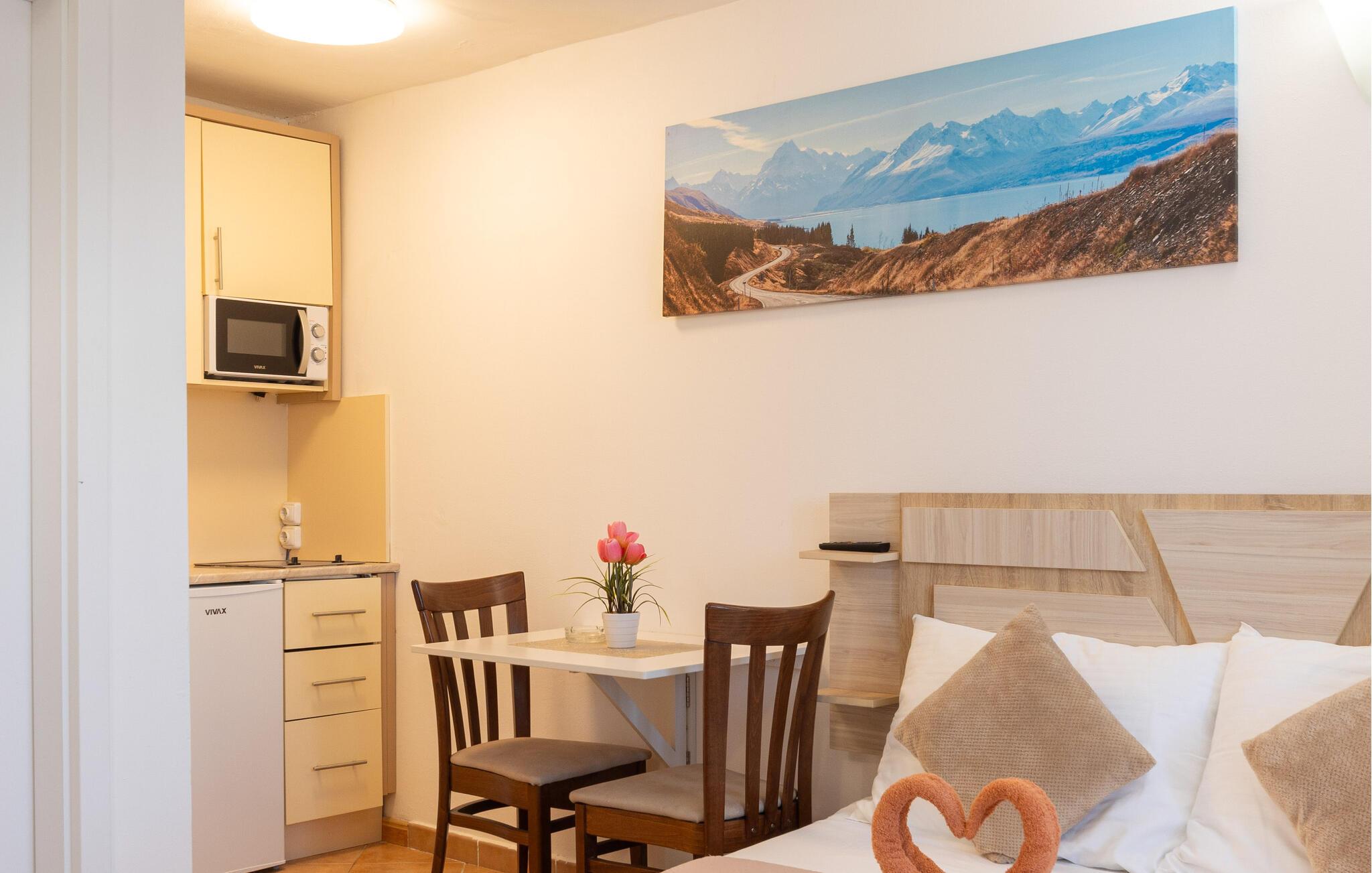 Der er kun få skridt fra denne luftige ferielejlighed til en smuk stenstrand, hvor I og jeres partner kan lægge hverdagen bag jer. Tryl jeres måltider frem i det praktiske tekøkken og planlæg jeres aktiviteter ved det indbydende spisebord. Efter mange solskinstimer kan I forkæle jer selv med en afslappende siesta og afslutte dagen med en god bog eller et brætspil.