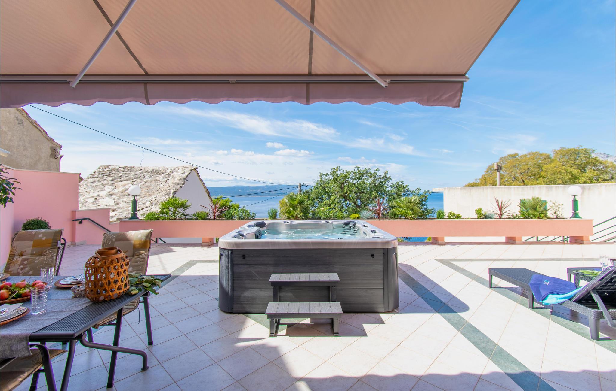 Komfortabelt og smagfuldt feriehus med stor terrasse, jacuzzi og havudsigt.