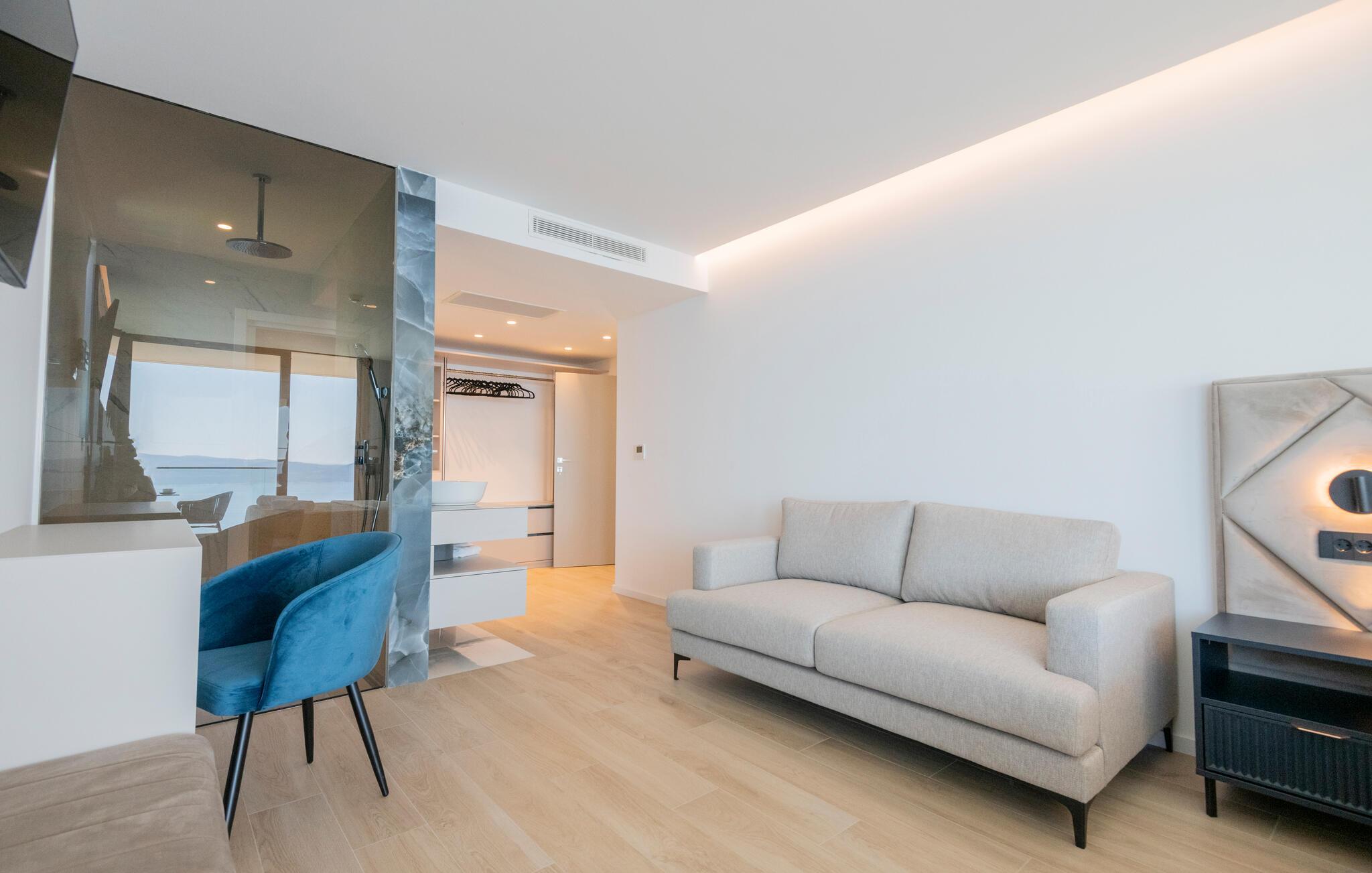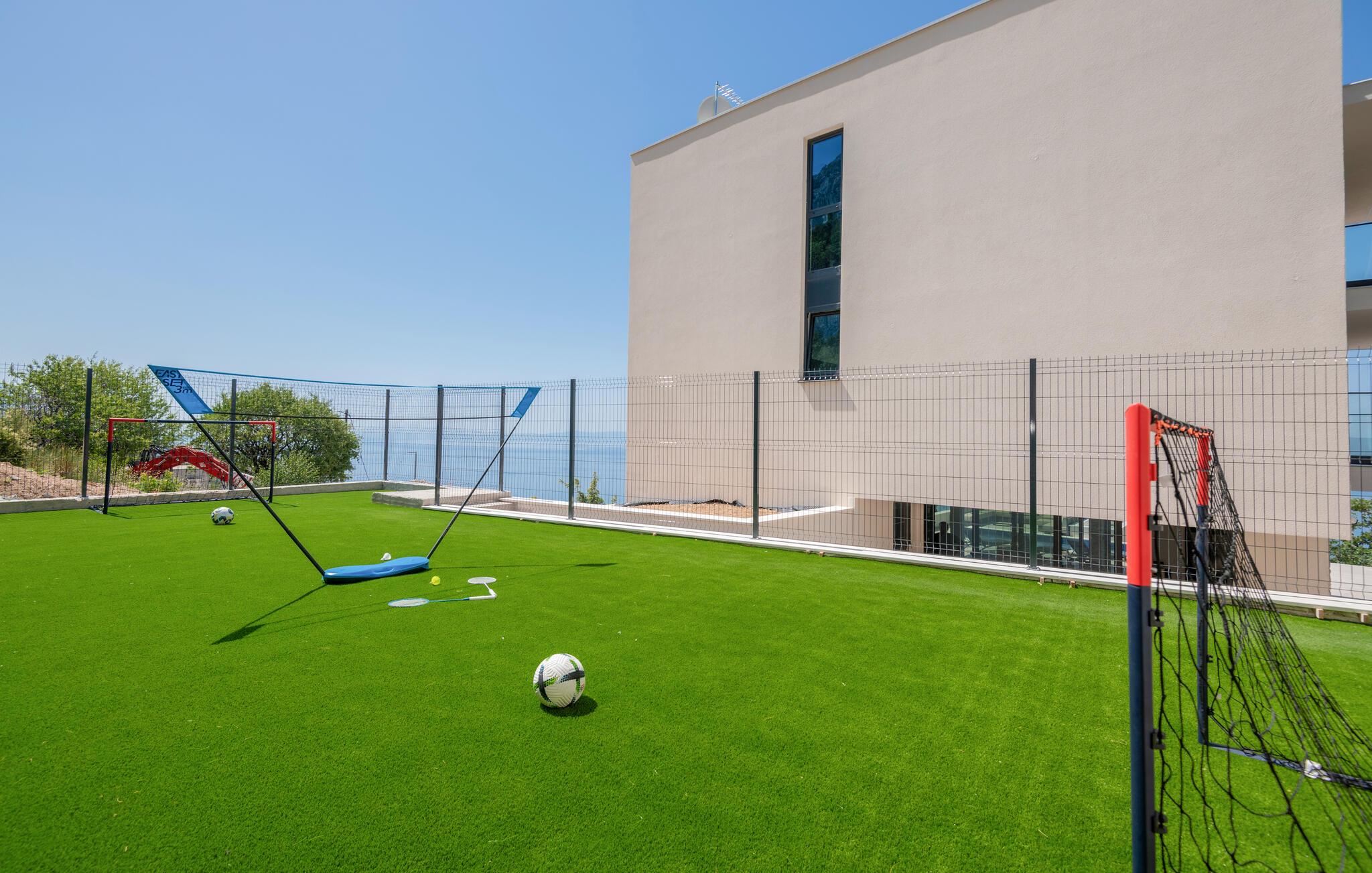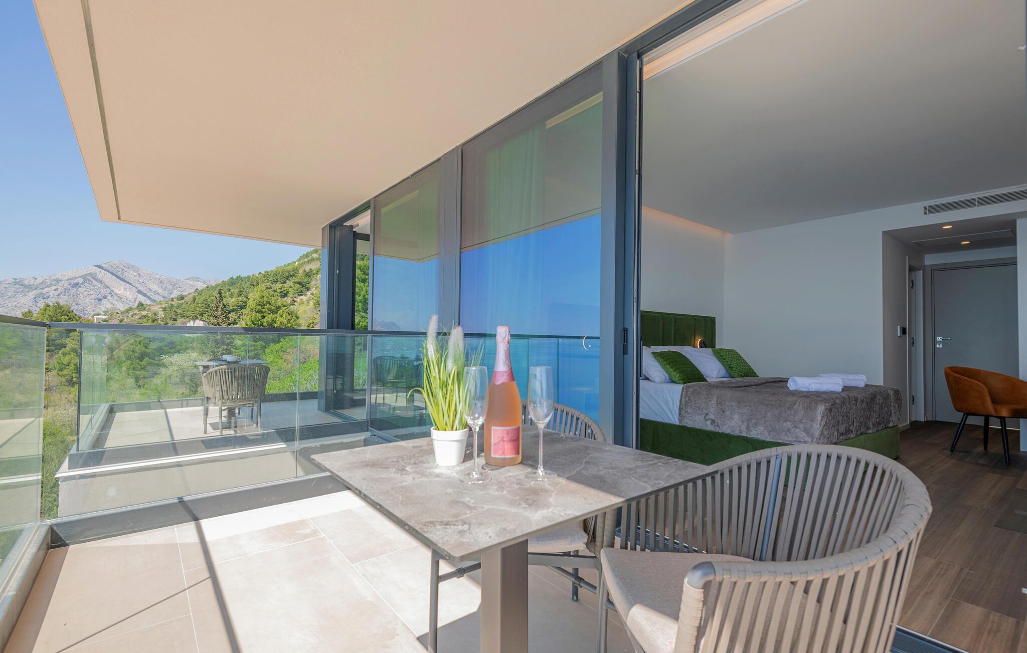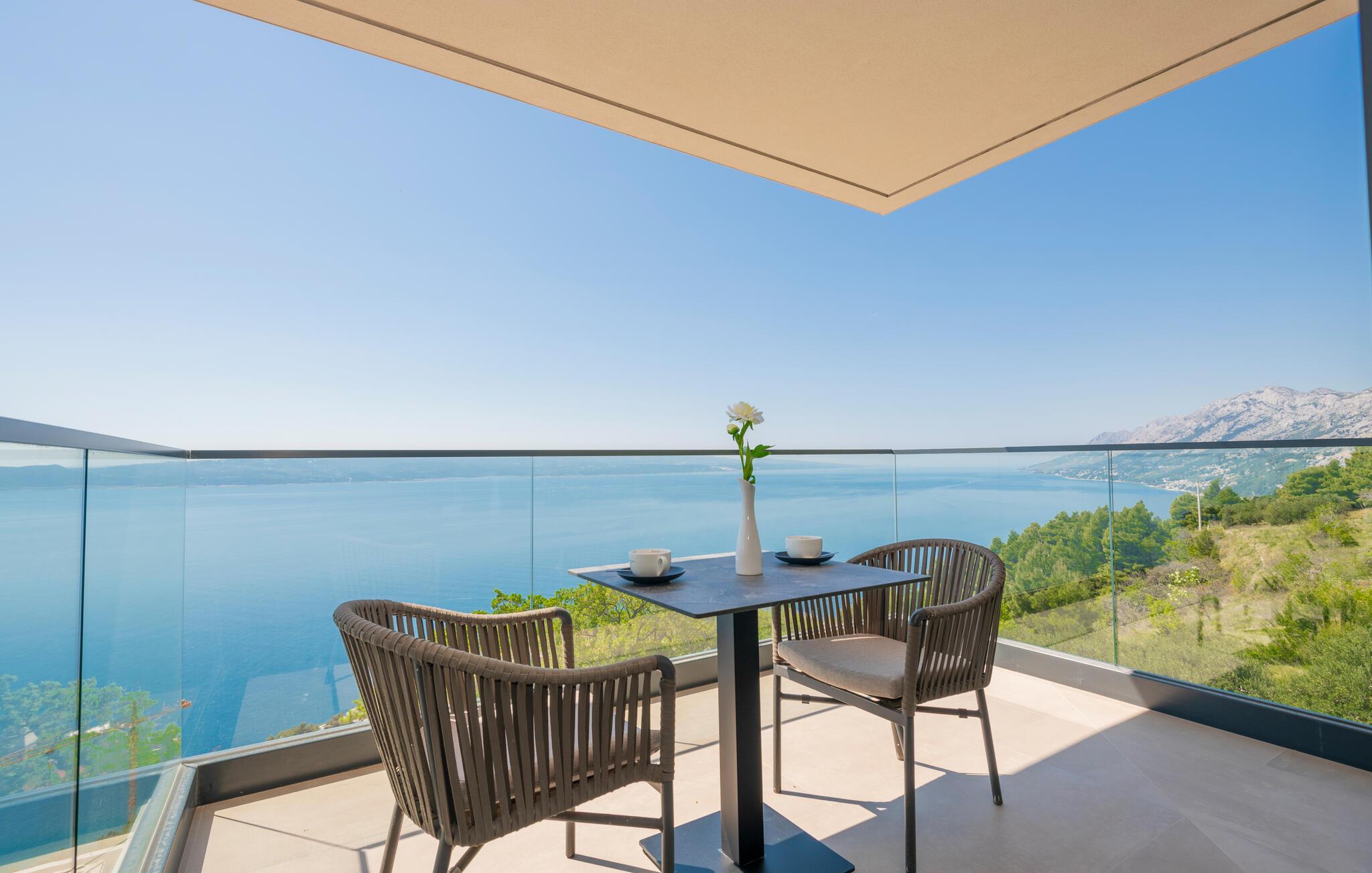 Udeområdet er tilsvarende lækkert. Her kan I glæde jer til en fantastisk pool, en betagende havudsigt og et vejrbeskyttet terrasseområde, hvor I kan dække op til lækre grill-måltider under aftensolen. Nyd solnedgangen på jeres private altaner med en kølig drink og nyd, at I ikke skal tidligt op dagen efter.