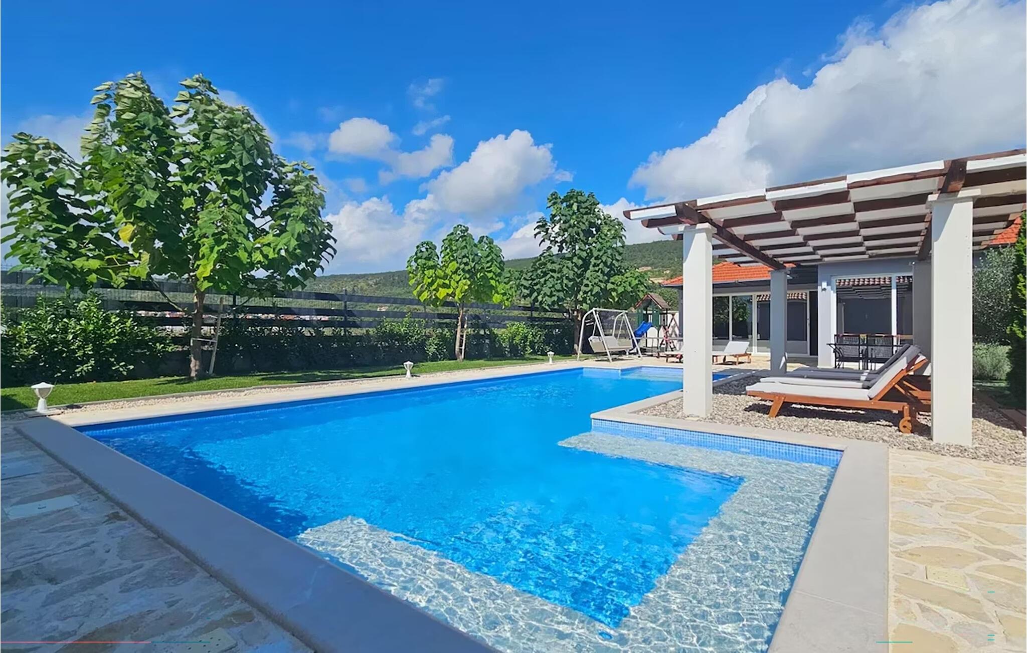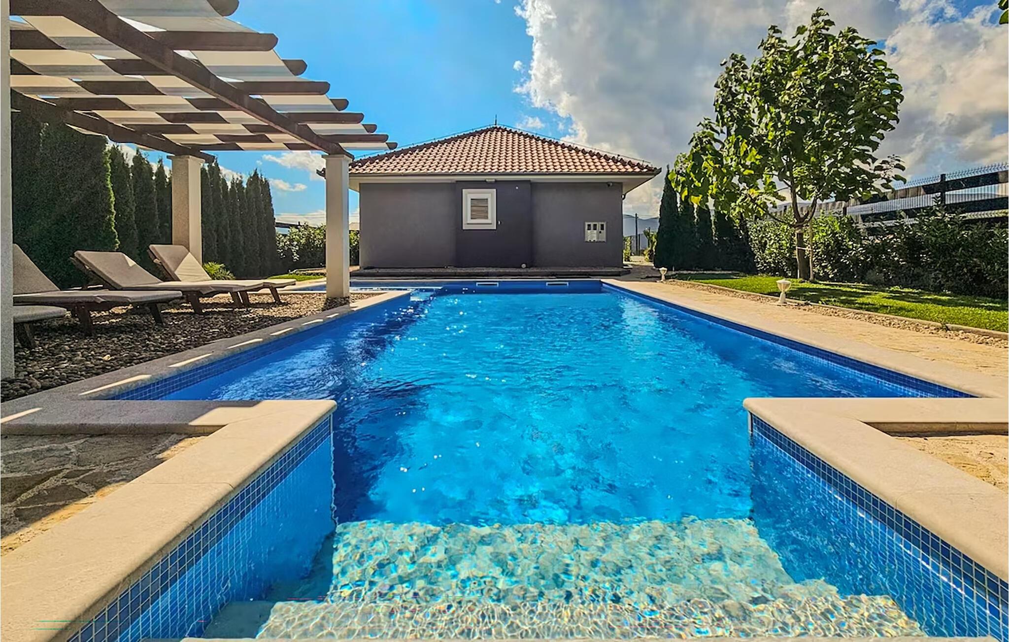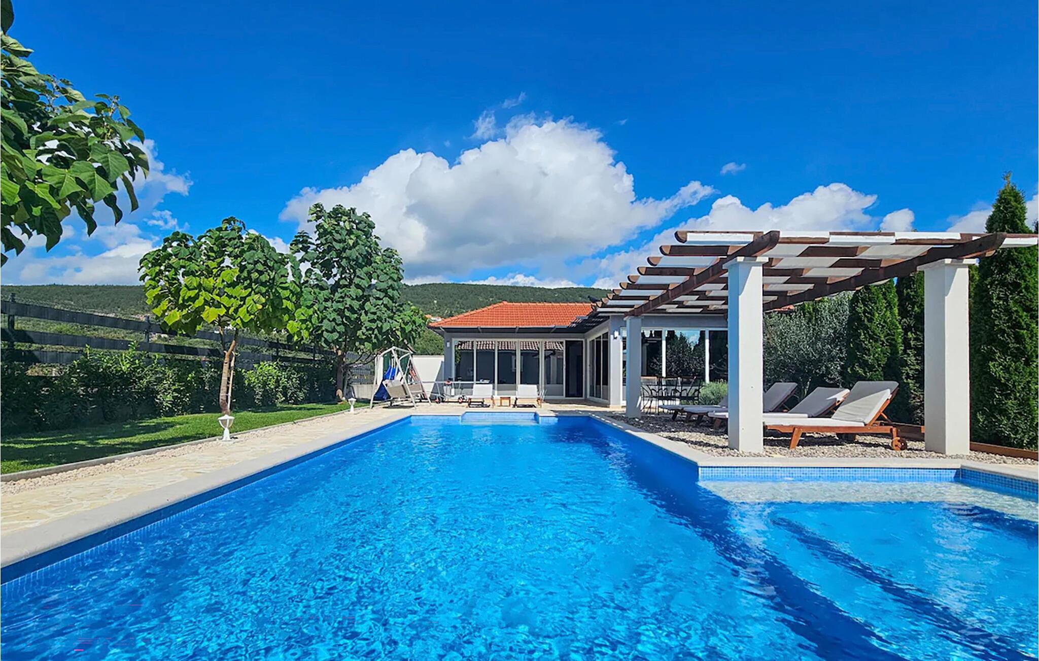 Nyd ferien i et komfortabelt feriehus med pool og udendørs wellness-område.