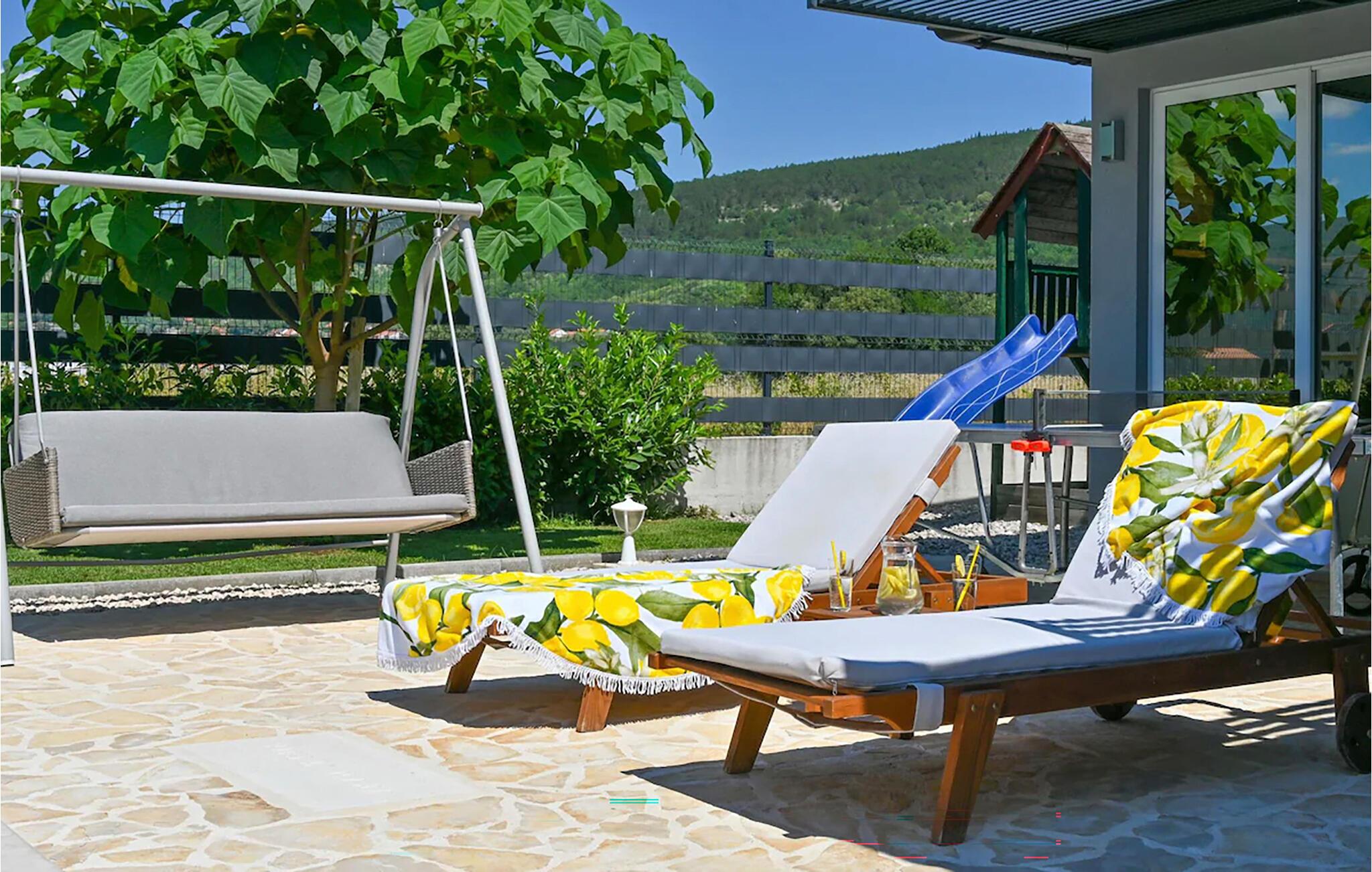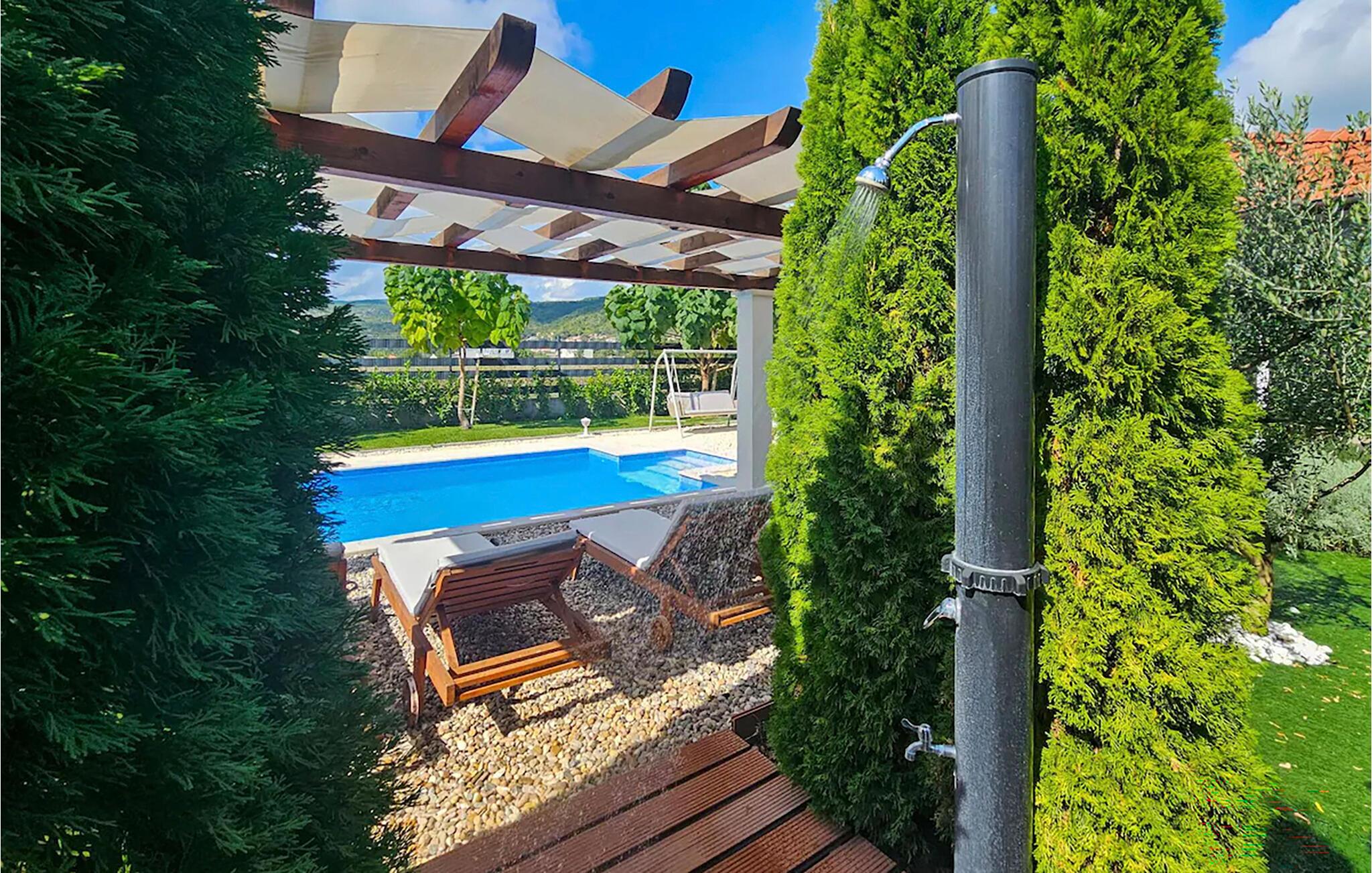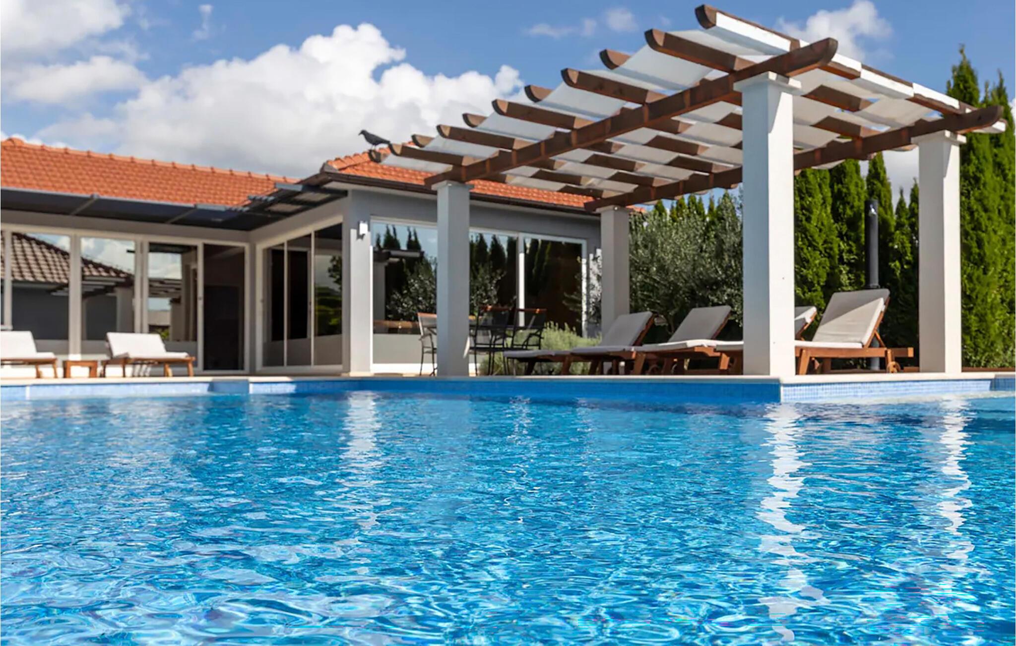 Nyd ferien i et komfortabelt feriehus med pool og udendørs wellness-område.