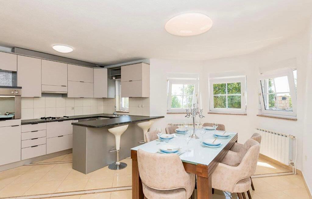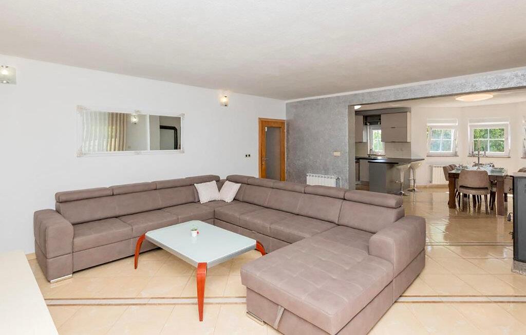 Freuen Sie sich auf eine funktionale Einrichtung, die sich ideal für eine große Familie eignet. Entspannen Sie im großzügigen Wohnraum mit großer Sofalandschaft und bodentiefen Fenstern, die den Blick in den Garten freigeben. Nutzen Sie den Wohnbereich für gemeinsame Abende oder ruhige Stunden. Nehmen Sie am Esstisch Platz und genießen Sie Mahlzeiten in geselliger Runde. Und bereiten Sie Speisen in der modernen Küche mit Küchentheke und Barstühlen zu.