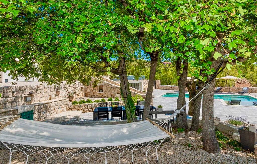 Entdecken Sie das Herzstück des Hauses: den weitläufigen Außenbereich. Schwimmen Sie im großen Pool und genießen Sie die ruhige Lage inmitten der Natur. Entspannen Sie auf den Sonnenliegen oder spannen Sie in der Hängematte unter schattenspendenden Bäumen aus. Nutzen Sie die Terrasse mit Natursteinmauern und großem Esstisch für Mahlzeiten im Freien. Lassen Sie Kinder im Spielhaus spielen, auf der Schaukel schwingen oder die Rutsche hinuntergleiten.