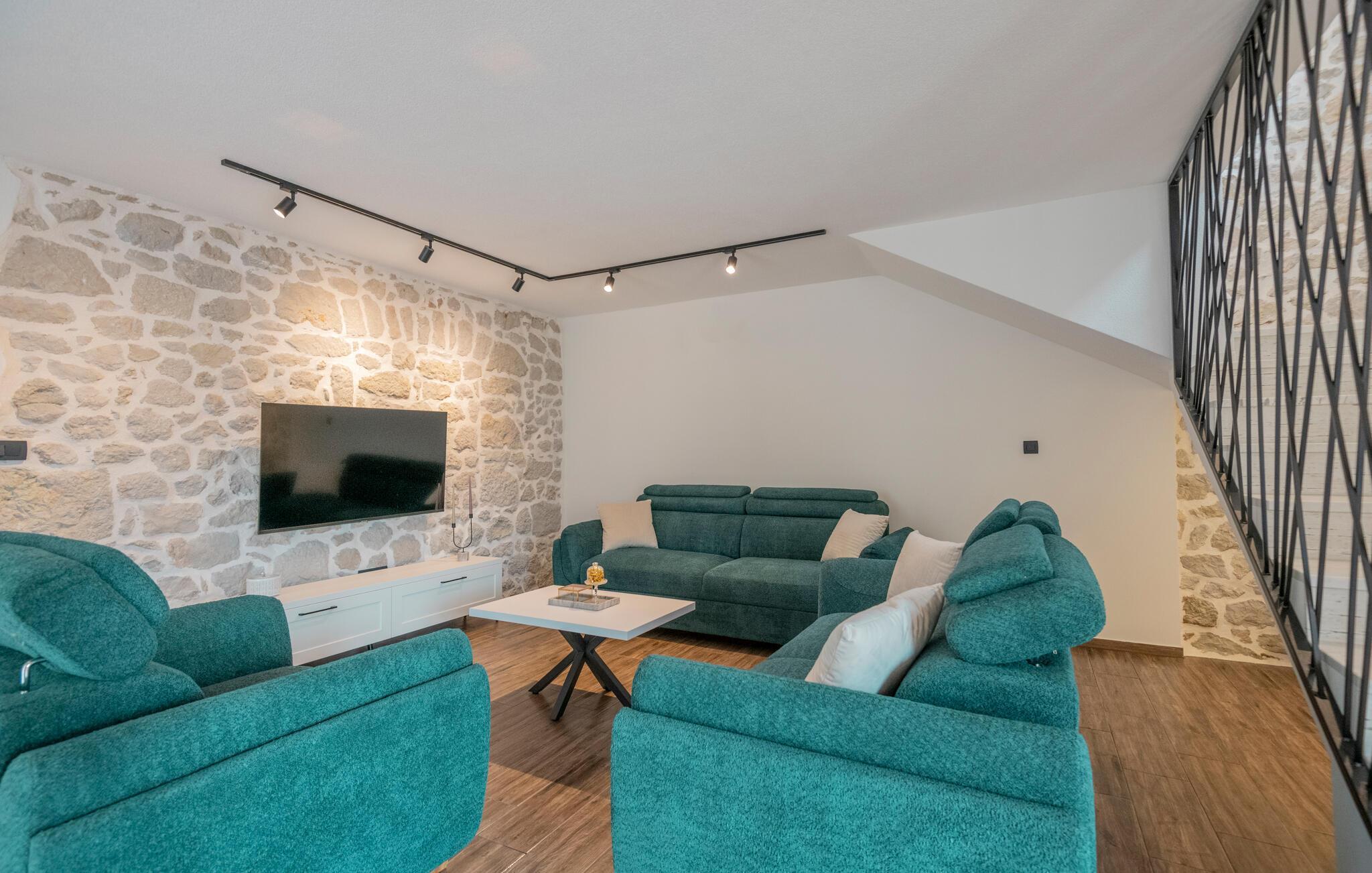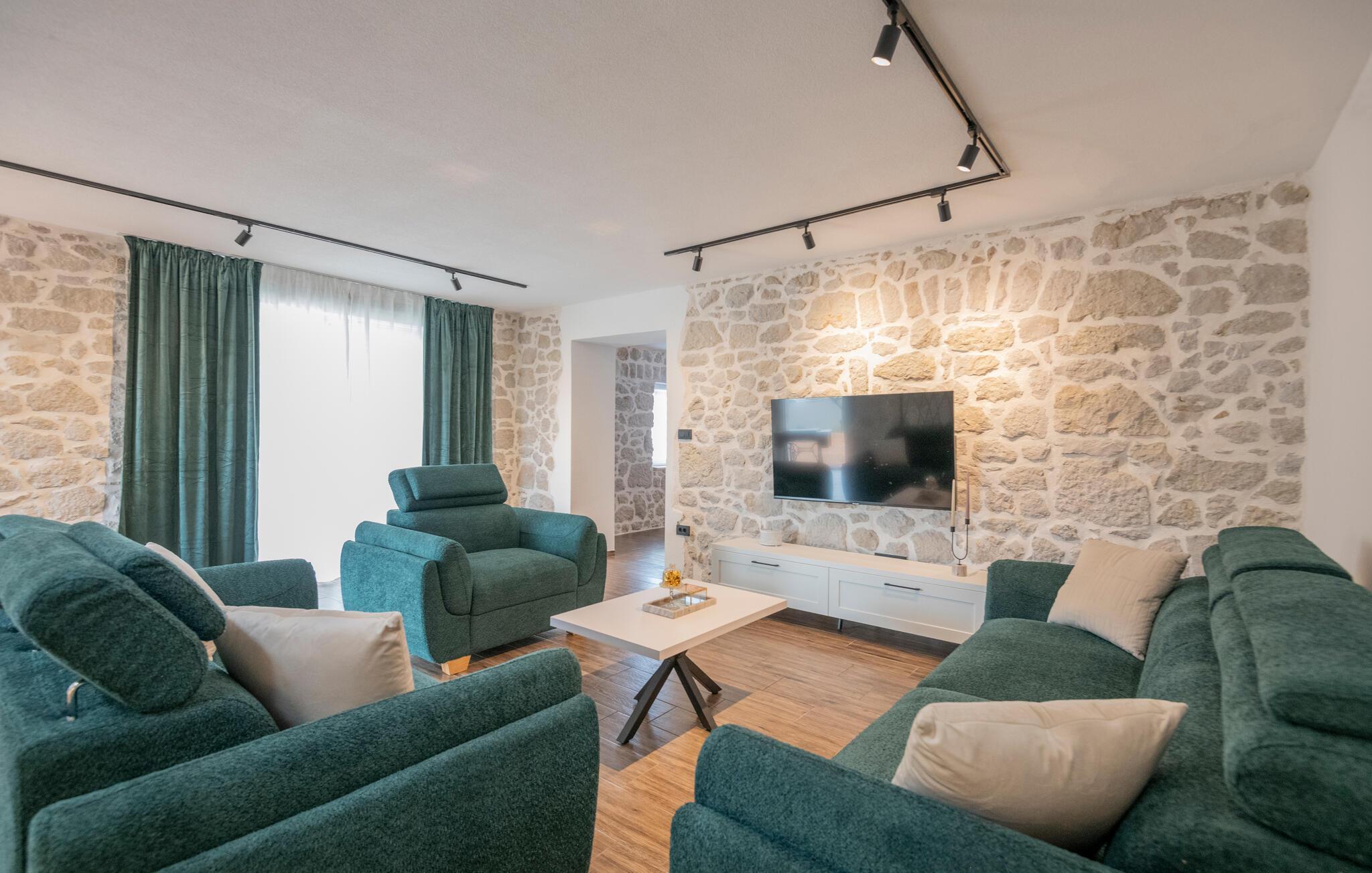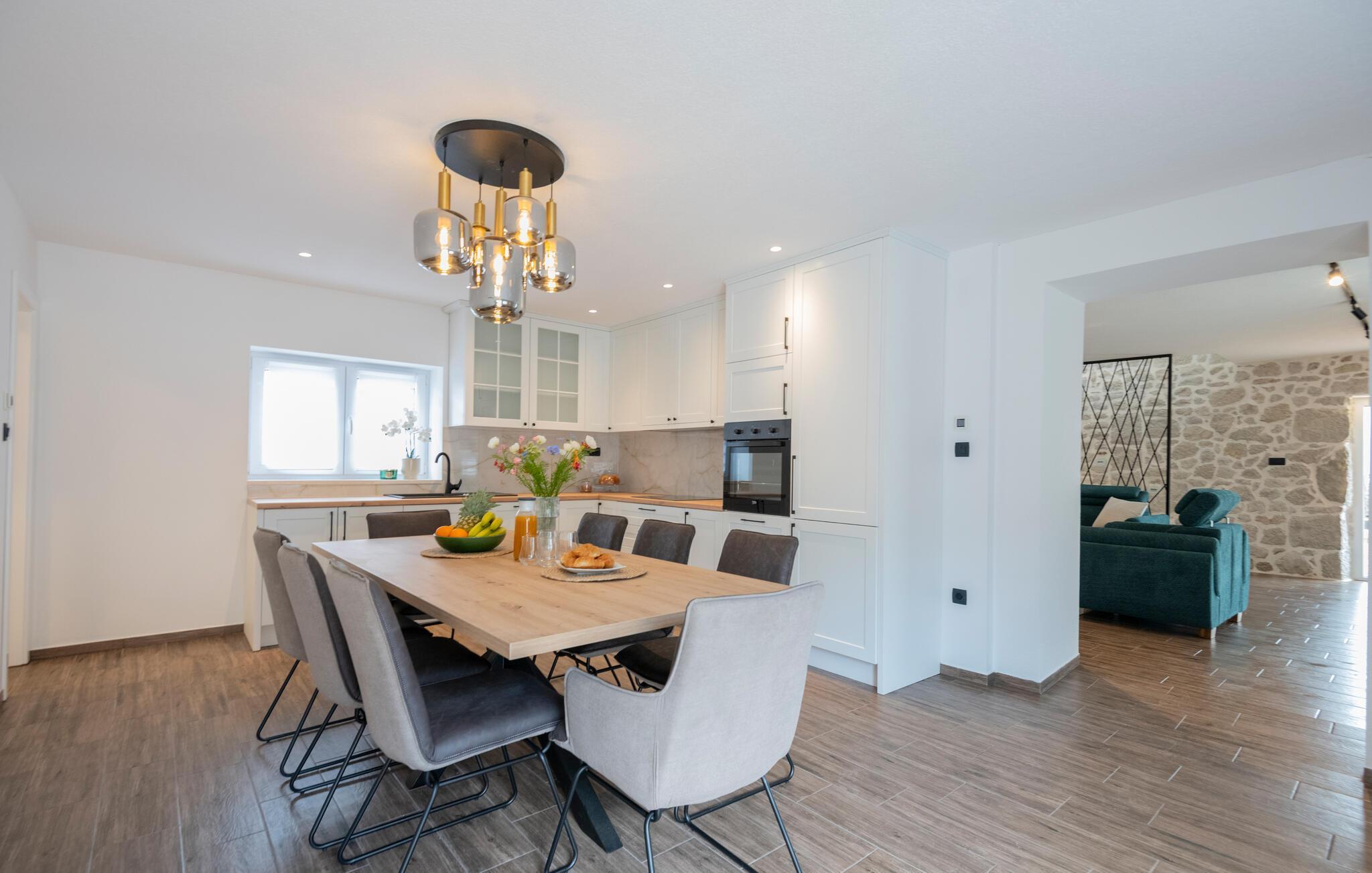 Huset ligger midt i den smukke natur og danner de perfekte rammer om et afslappende ophold i de dejligste omgivelser. Indretningen fremtræder både charmerende og moderne med synlige murværk og gode faciliteter, der gør det nemt at hygge sig med tingene og bare slappe af. Efter en aktiv feriedag kan I flade ud i sofaen med snacks, brætspil og en god film, mens I lægger planer for de kommende dage.