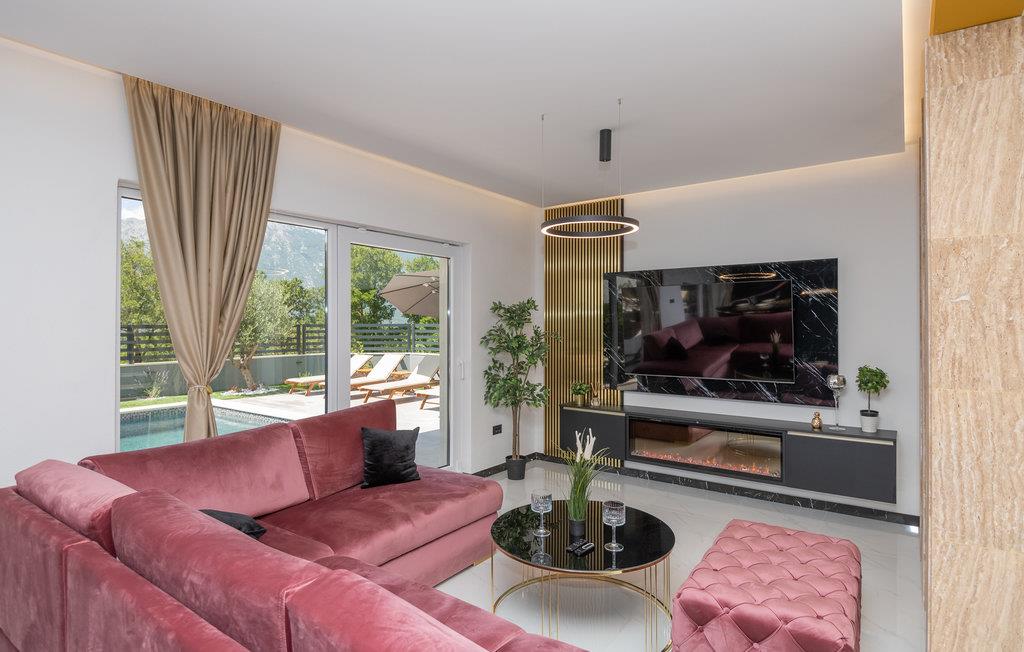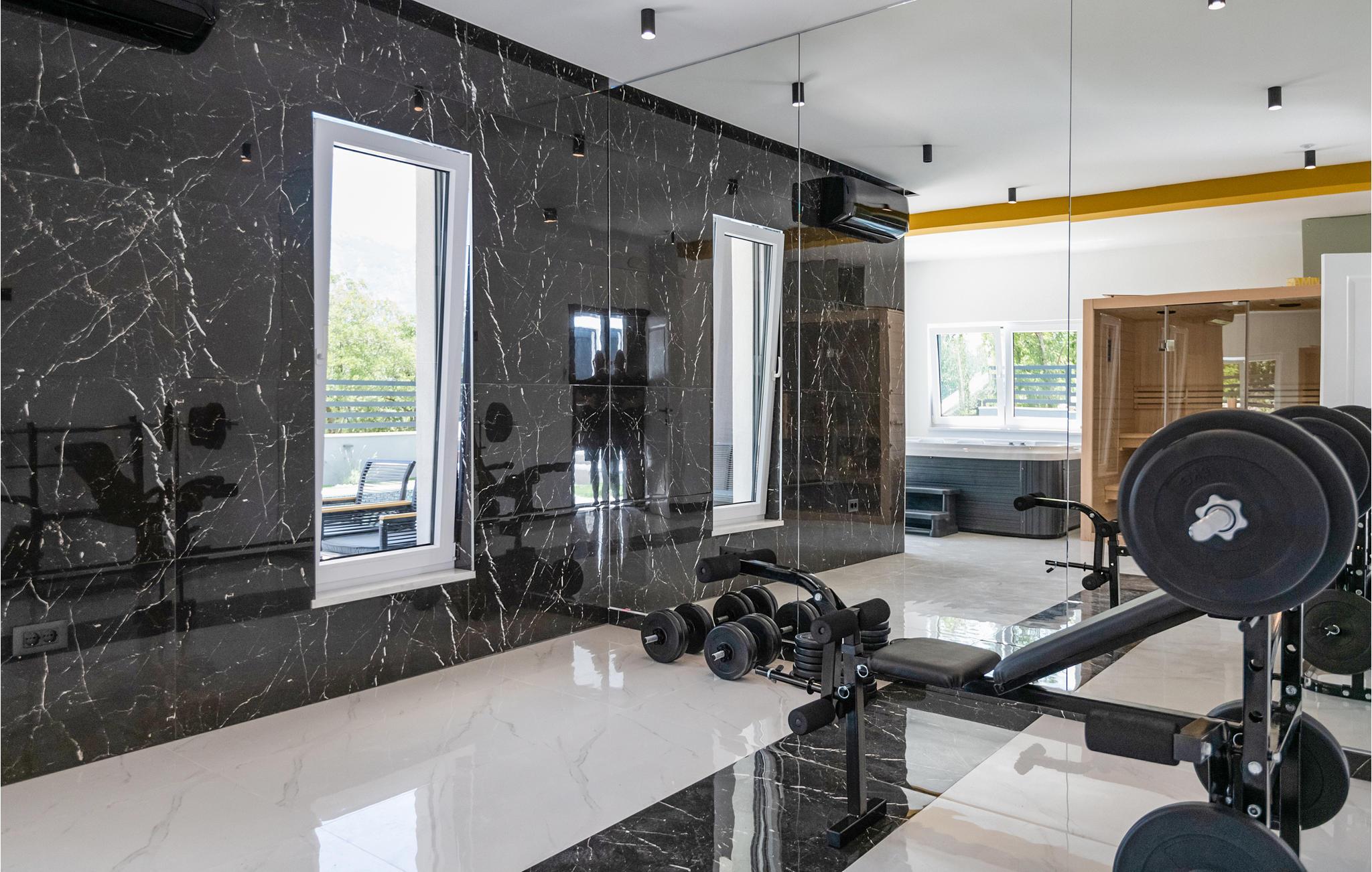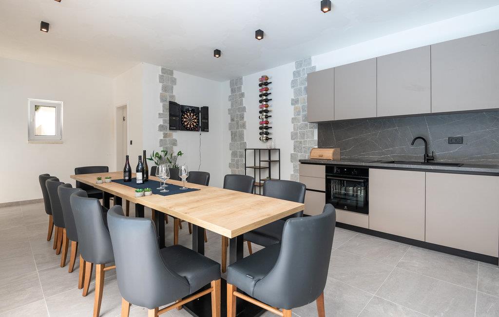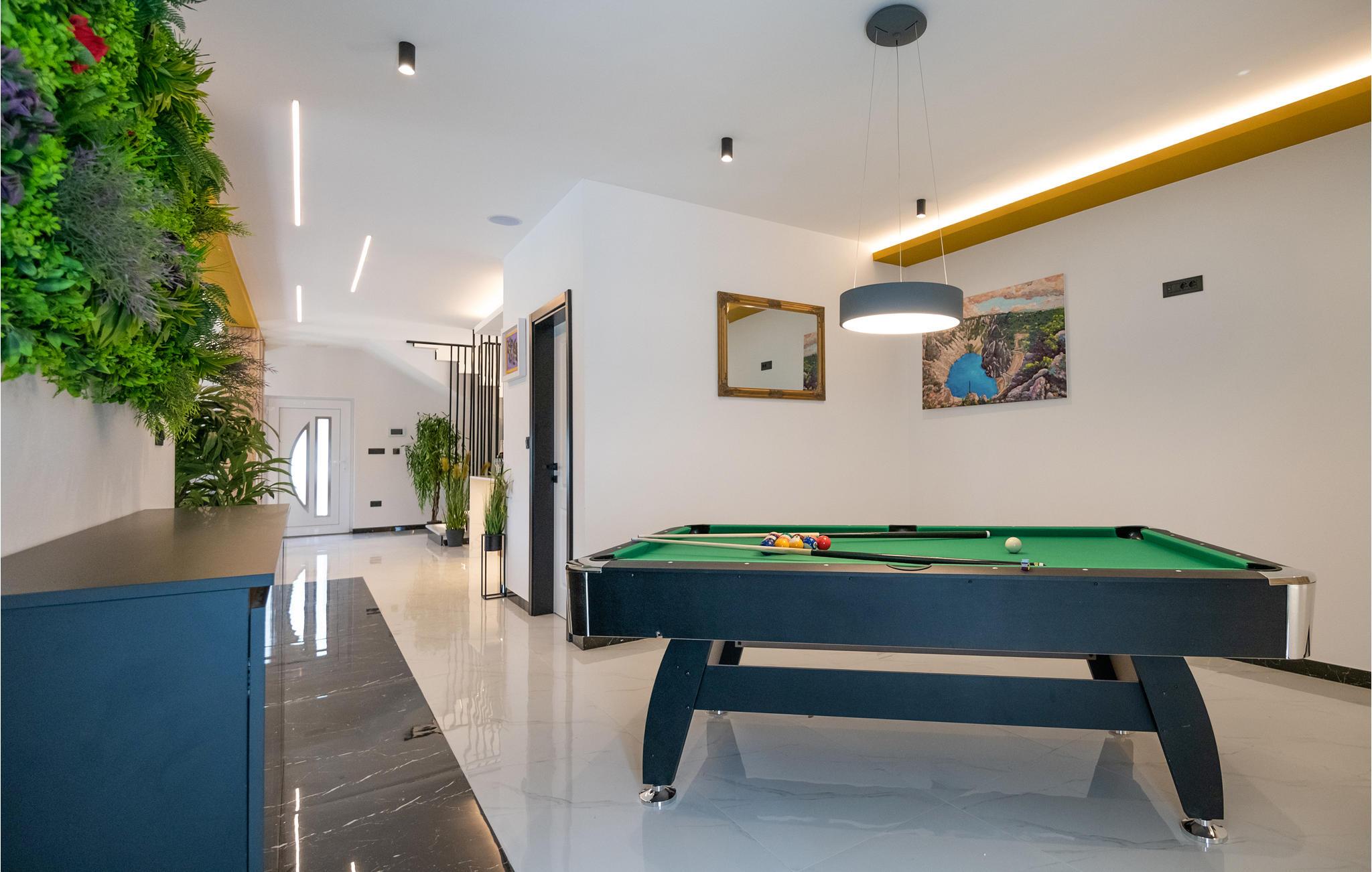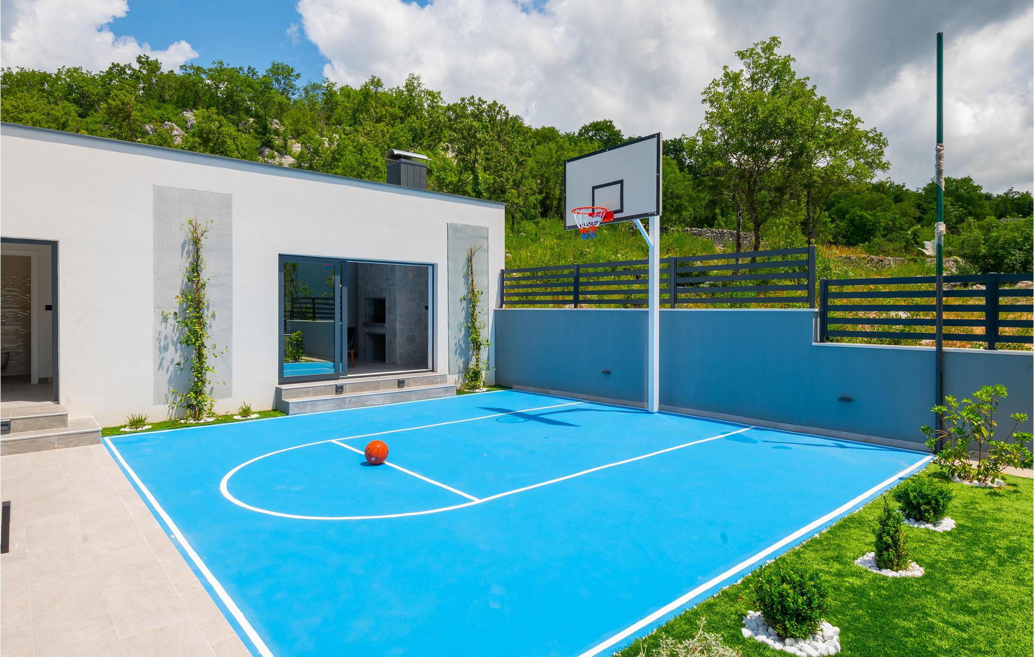 Dette luksuriøse feriehus med swimmingpool og mange faciliteter byder dig velkommen med en smuk udsigt over Sveti Jure-bjergene. Glæd dig til en afslappende ferie i dette skønne feriehus. Drømme går i opfyldelse her, og du kan tilbringe din ferie til dit hjertes lyst. Huset og haven har meget at tilbyde dig, for du kan følge dit sportsprogram i fitnessrummet samt slappe af i saunaen og spabadet. De yderst komfortable soveværelser og den store stue vil også byde på afslapning med deres højkvalitetsmøbler og hygge. Haven lover dig også underholdning, sjov og afslapning. Mød op på din private bane for at spille basketball eller udfordre dig selv til bordtennis. Der skorter heller ikke på badehygge, se dine børn bade, mens du nyder solbadning og udsigten over landskabet. Beliggenheden er ideel til at kombinere naturoplevelser med dage på stranden. Beundre nærliggende søerne Baluen og Røde i Imotski, eller forfrisk dig selv i søerne i naturreservatet Prološko Blato. Landskabet er også ideelt til vandre- og cykelture. Klatrere vil have det sjovt i de nærliggende bjerge og kan nyde en betagende udsigt fra toppene. De smukke stenstrande ved kysten kan nås hurtigt i bil. Hop ind i bølgerne og nyd fantastiske timer ved havet. Forkæl dig selv med en uforglemmelig ferie i Dalmatien!