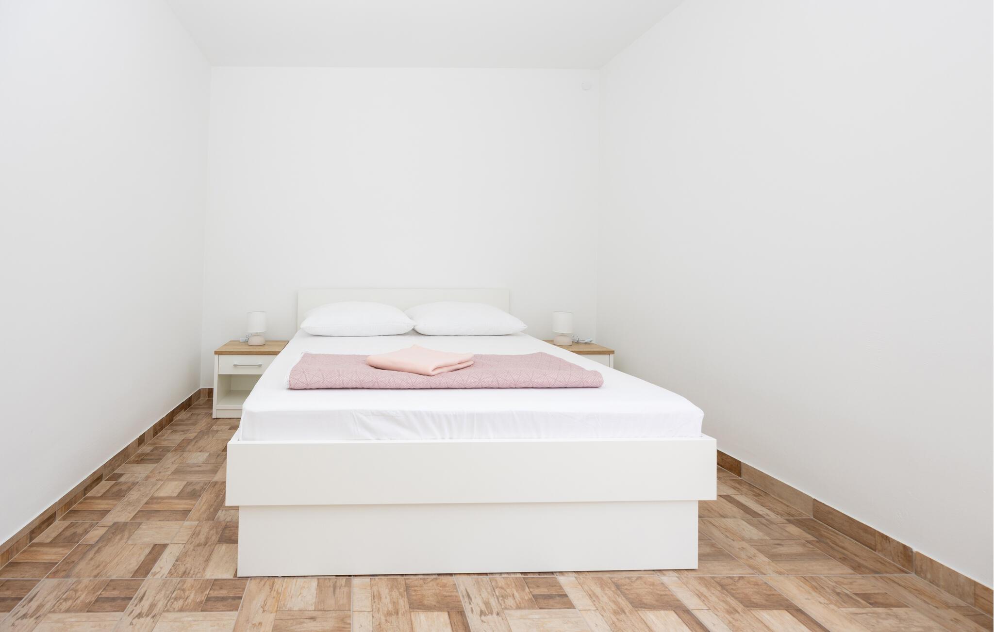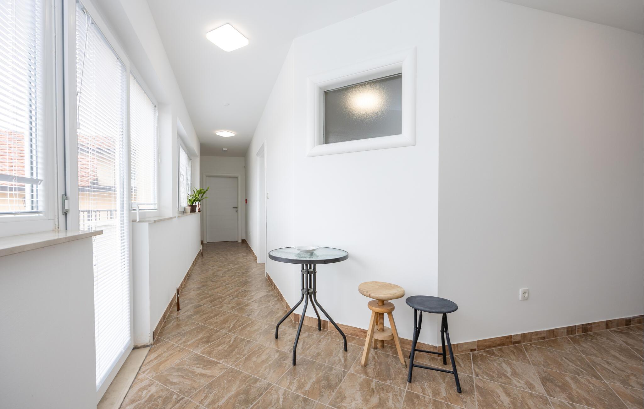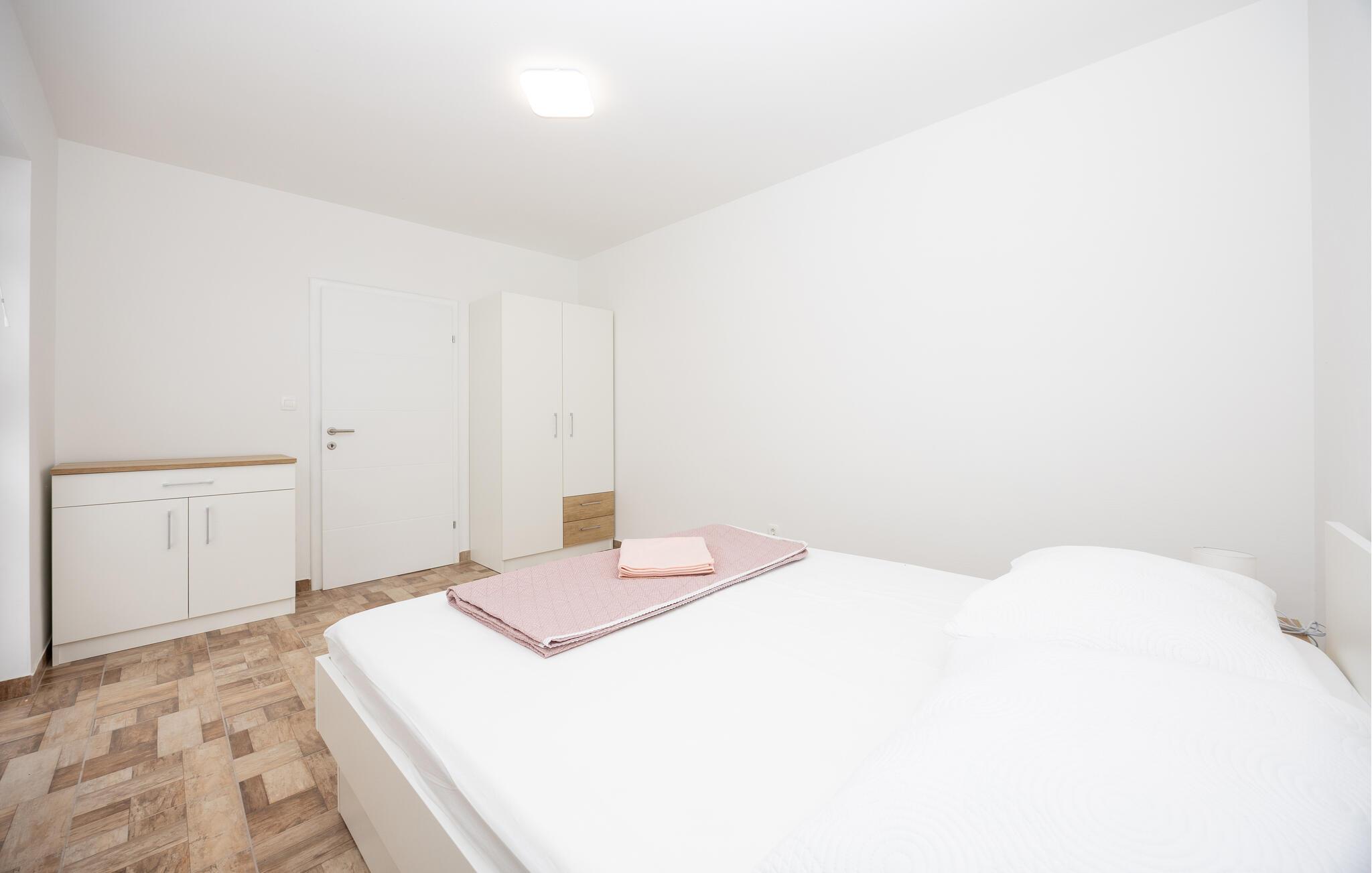Denne moderne og venlige ferielejlighed med højt til loftet og rummelige værelser giver jer lige den komfort, I ønsker jer på ferien. Det hyggelige køkken, der er fuldt udstyret, indbyder til fælles madlavning, mens det komfortable opholdsområde er perfekt til afslappede aftener med spil og hygge. På ejendommen står en fælles grill til rådighed – ideel til at tilberede lækre retter under åben himmel, måske endda lokale specialiteter.
