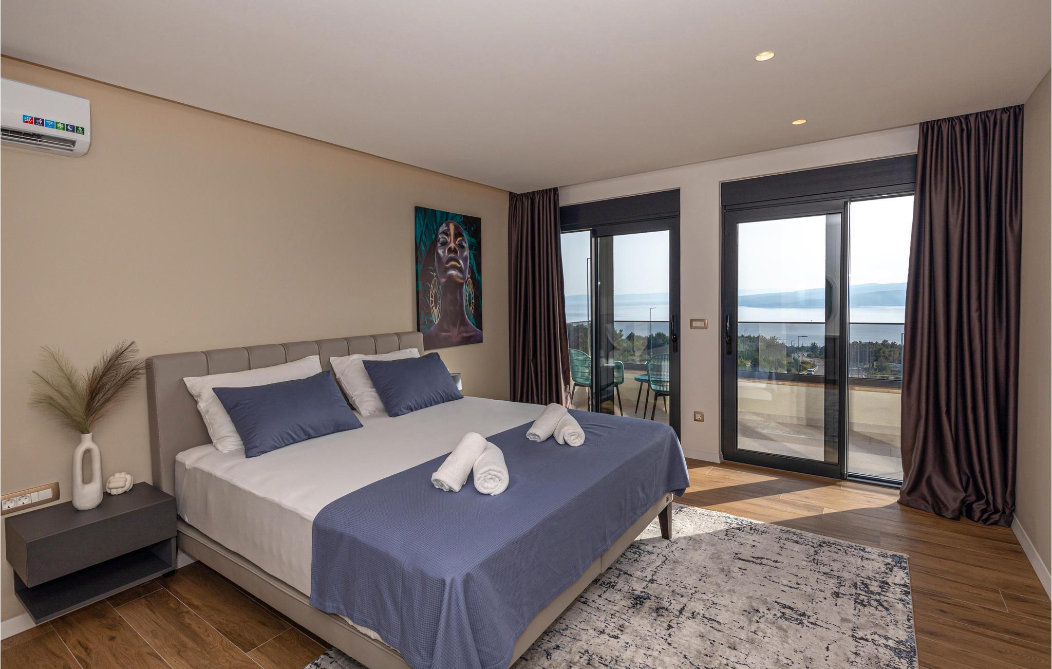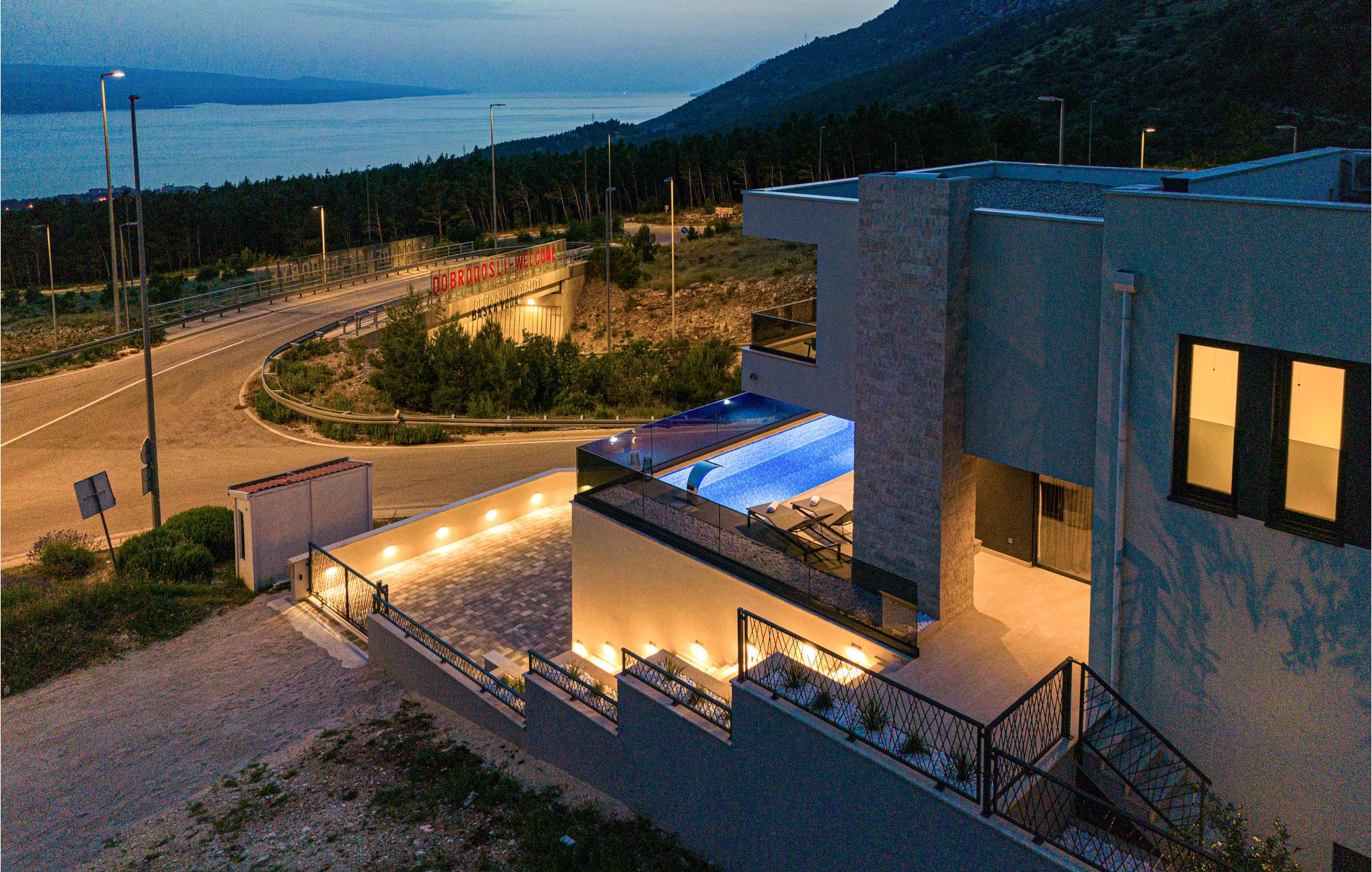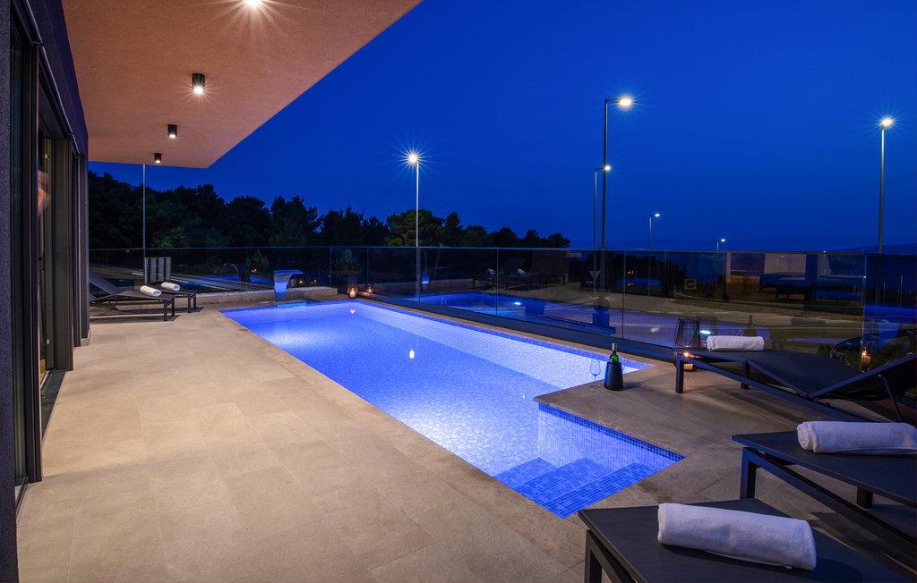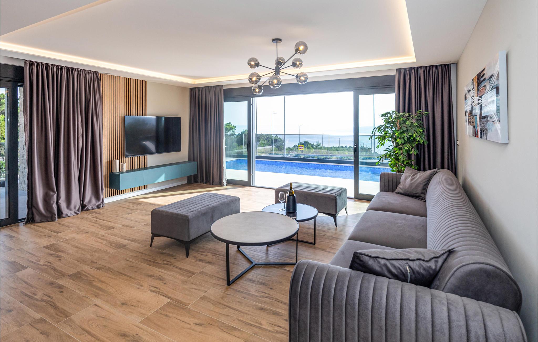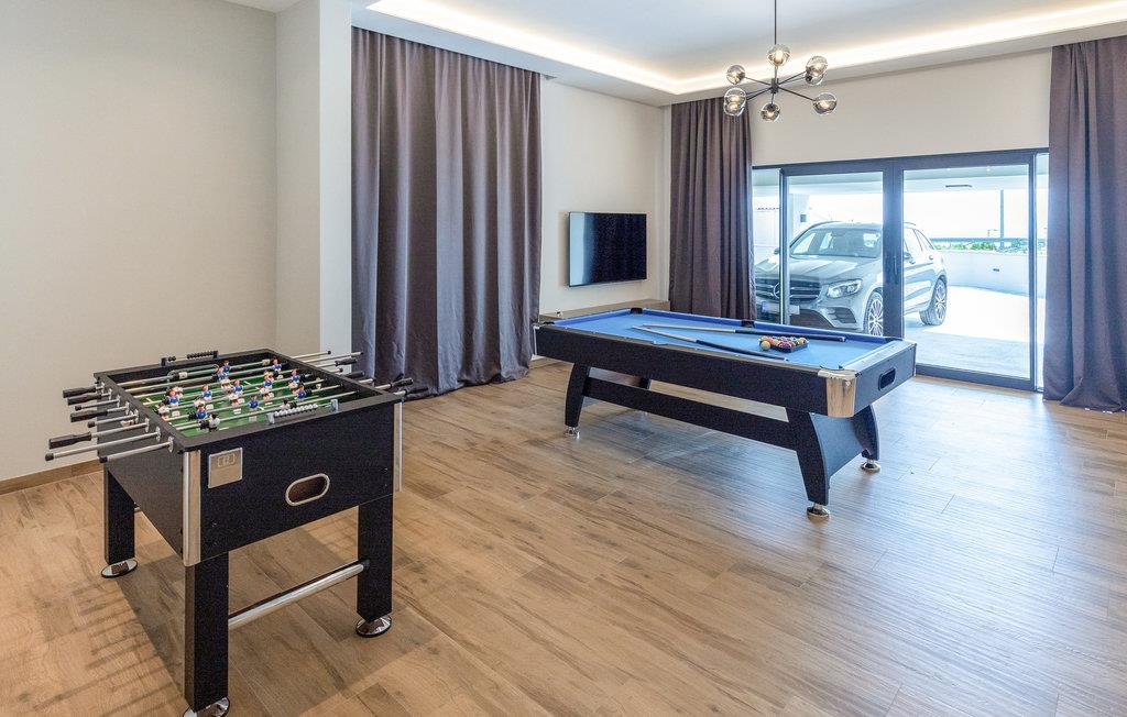 Dette luksuriøse feriehus med mange faciliteter venter på jer med en smuk udsigt over havet. Blot få kilometer fra strandene byder dette skønne og rummelige feriehus velkommen med god adgang til kysten og oplandet. Det moderne hus byder velkommen på tre fuldt udstyrede etager, som byder på komfort, underholdning og en god tid sammen med den store familie eller vennepar. Mens den nederste etage bruges til underholdning og hygge med billard og bordfodbold, kan du en etage over mødes med dine kære i stuen og slappe af i sofaen. Spil kort ved spisebordet eller lav lækre måltider i køkkenet. Den øverste etage er designet til afslapning, hvor du ikke kun kan tilbringe afslappende nætter, men også nyde udsigten over bugten og øerne om morgenen fra balkonen. Glæd dig til mange timer i poolen eller solbadning på terrassen. Om aftenen kan du tilberede din grillmad i den murede grill og afslutte hyggelige aftener udendørs. Fra huset kan du hurtigt komme til strandene ved Adriaterhavet i bil. Besøg de charmerende kystbyer i Dalmatien og dyk ned i det krystalklare hav. Tag på ture til de omkringliggende øer eller planlæg en dagstur til den imponerende by Split. Naturelskere og aktive feriegæster kan også tage på store vandreture i Sveti Jure-bjergene og belønne indsatsen ved opstigningen med en betagende panoramaudsigt!