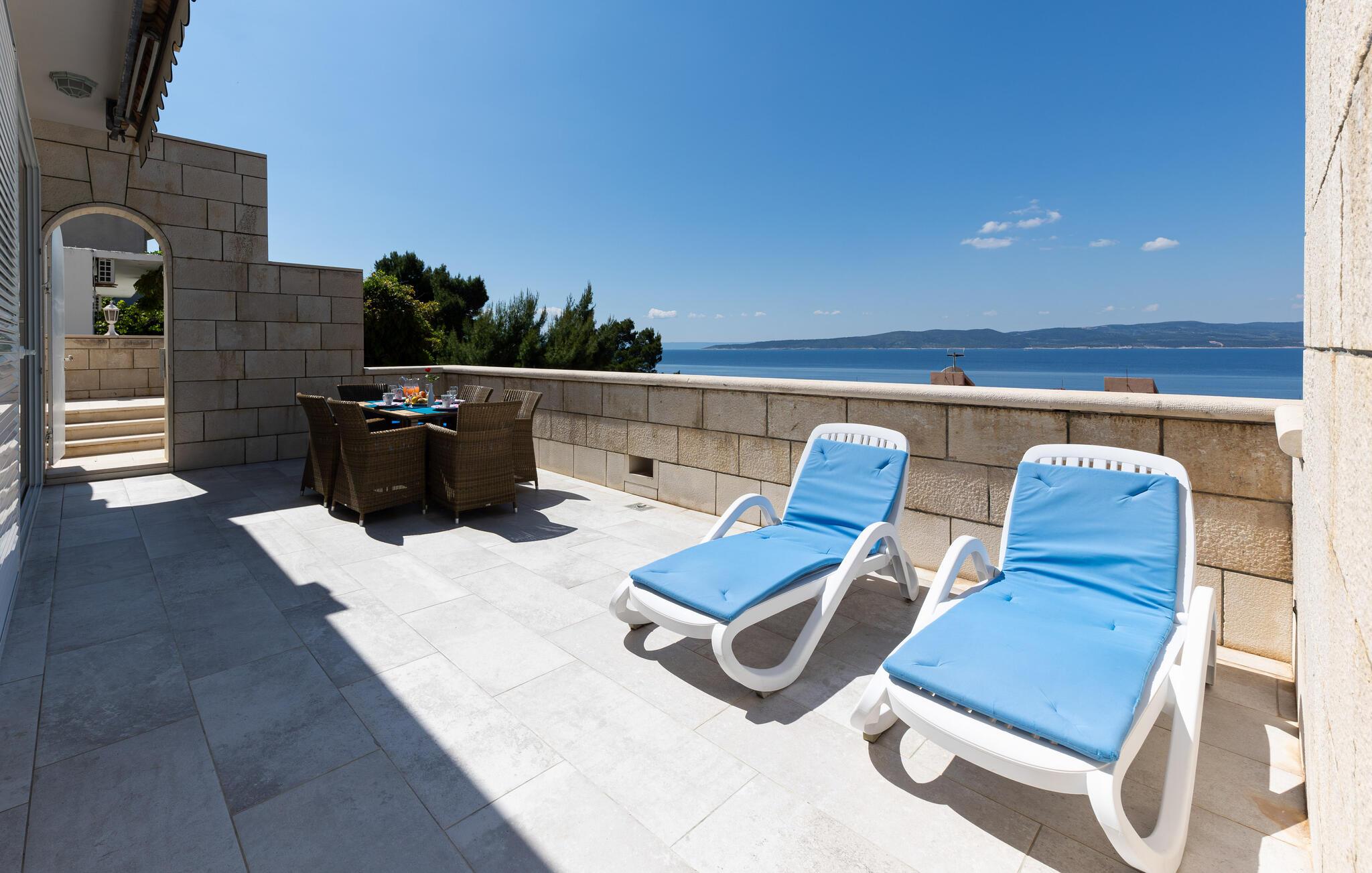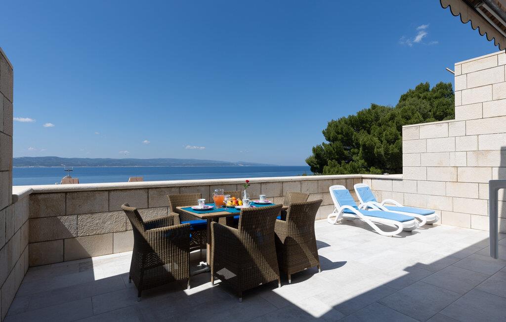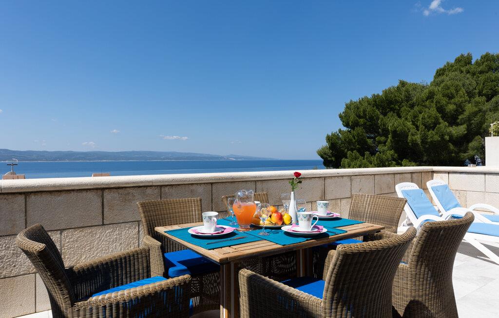 Træd ud på jeres solrige terrasse og lad jer fortrylle af den betagende havudsigt. Alt efter jeres ønsker kan I bruge forteltet til at nyde jeres måltider i solen eller i skyggen. Slap af på liggestolen, fordyb jer i en god bog og fejr middelhavsnætterne med vin og levende lys.