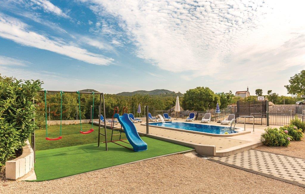 Dette komfortable og smagfuldt indrettede feriehus ligger i Dalmatiens bagland, bag Makarskas riviera. Huset består af underetage, stueetage og en første sal forbundet med indre trapper. Foran huset ligger en swimmingpool, ved siden af en legeplads og en terrasse med en grill. Der er aktivitetsrum i souterrain. Her er tænkt på både at slappe af og være aktive. Hvis I holder af natur, har ønske om fred og ro, er dette feriehus det helt rigtige. Herfra er den en uforglemmelig udsigt ud over de omliggende bjerge.