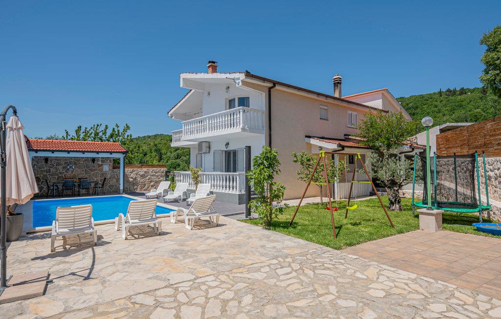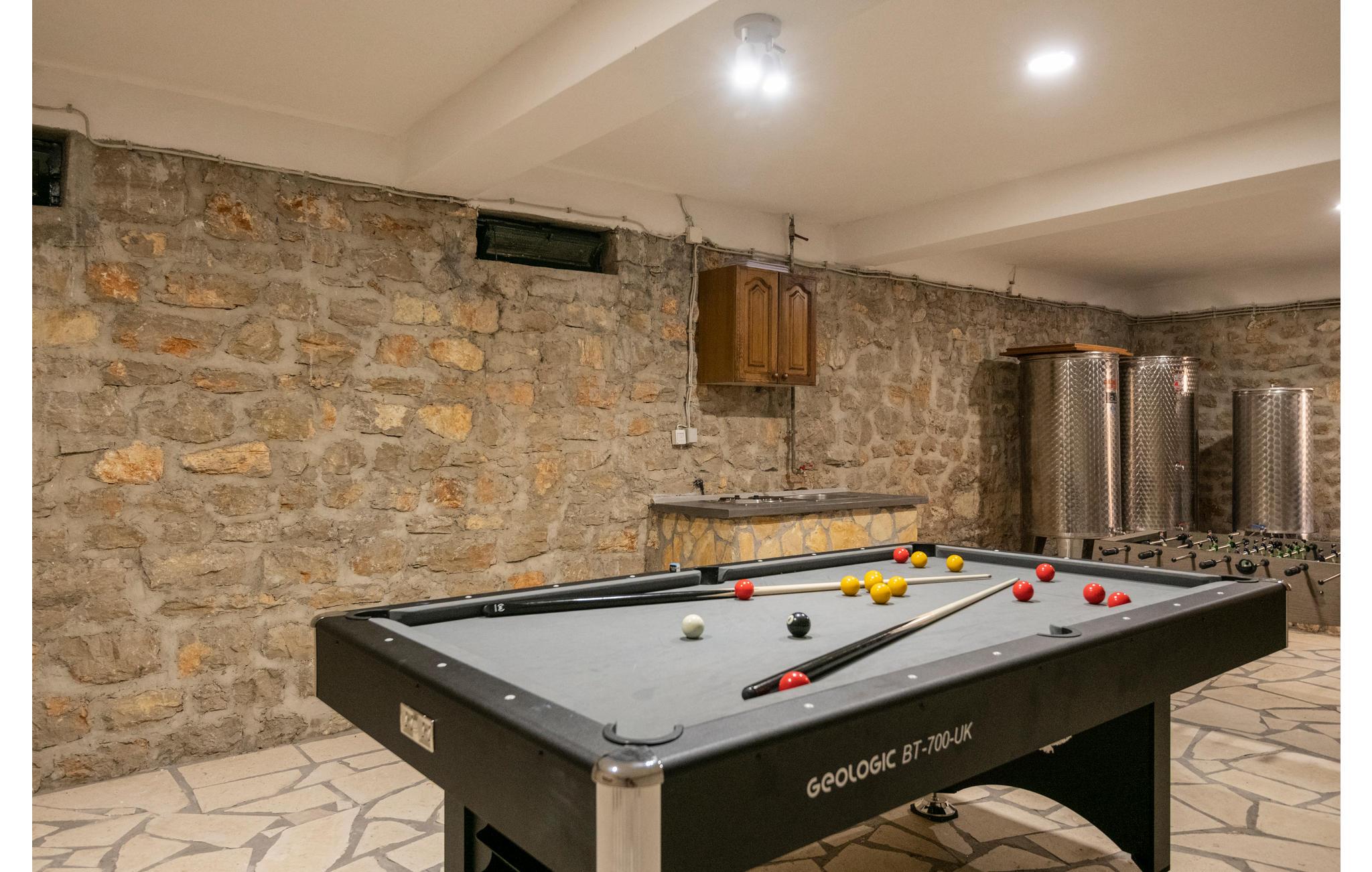 Dette charmerende og stilrene feriehus i to etager indbyder til en skøn ferie for mange gæster. Eftersom begge etager har eget køkken, badeværelse og soverum, er det ideelt til to familier på ferie sammen. Huset har mange terrasser og altaner at vælge mellem, hvoraf I fra nogle af dem kan nyde en storslået udsigt over landskabet. Selvom interiøret er særdeles komfortabelt, er det formentlig omkring poolen, at en stor del af jeres ferie kommer til at foregå. Her kan I tilbringe skønne timer med at plaske rundt i vandet og sole jer fra liggestolene. Om aftenen kan I tilberede en lækker feriemiddag på grillen og efterfølgende flade ud foran fladskærmen med udspilede maver. Udover legetøj til børnene er huset udstyret med billard, bordfodbold og bordtennisbord - her er "kedsomhed" et fremmedord.