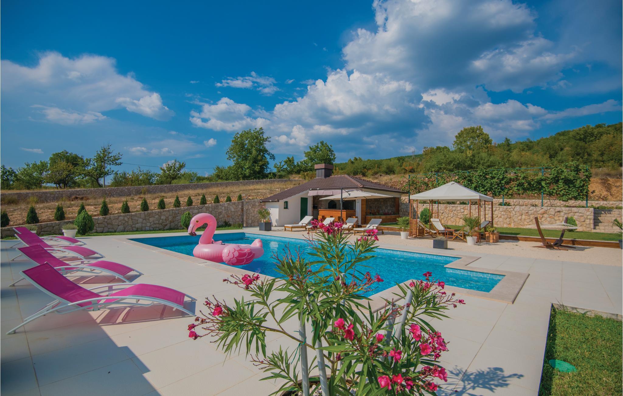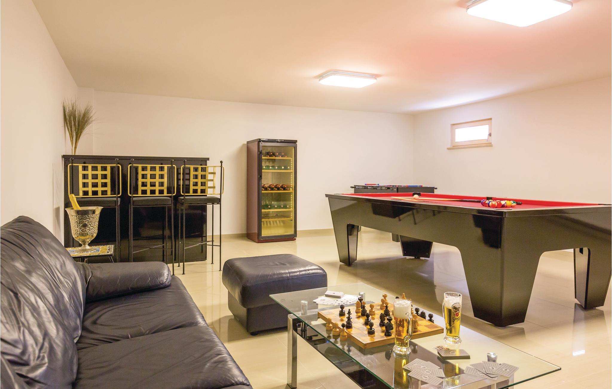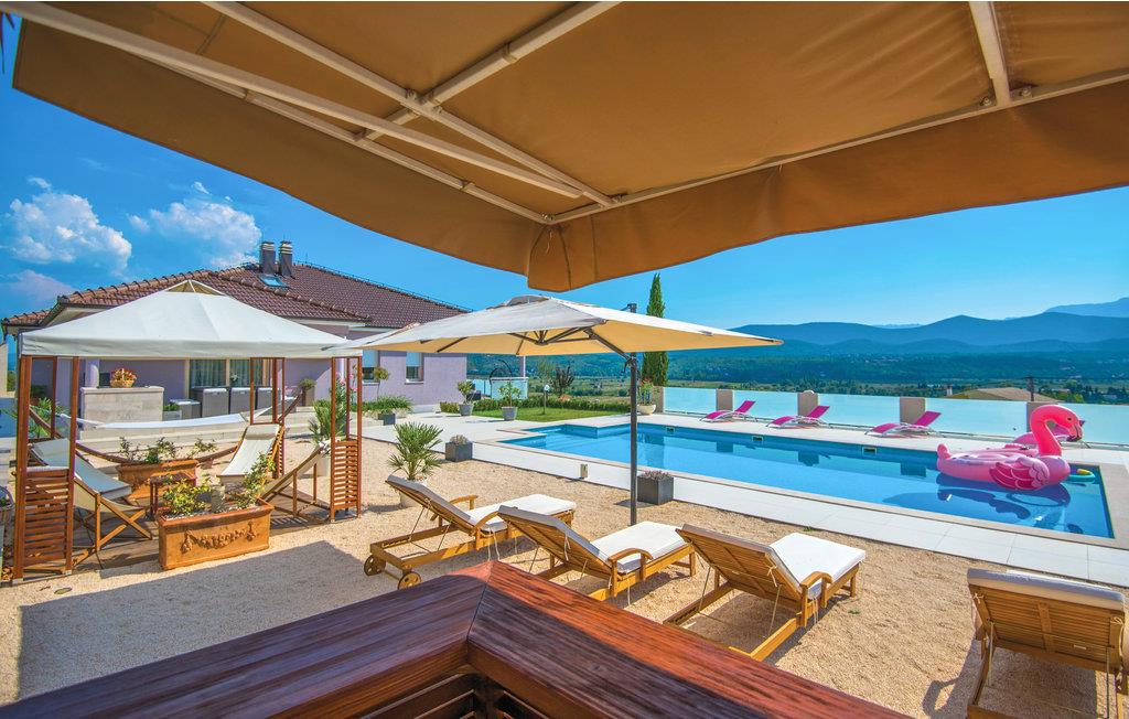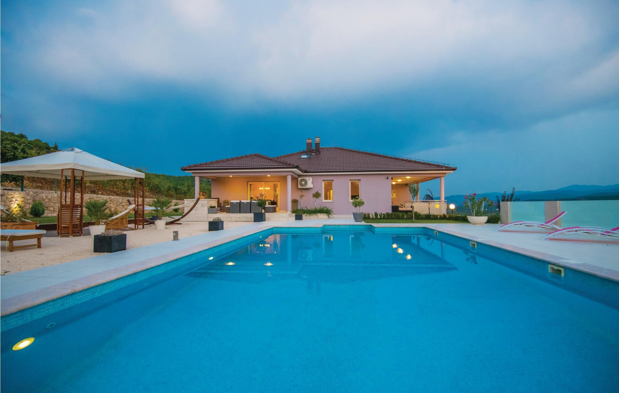 Vil I flygte langt væk fra hverdagens udfordringer og tilbringe ferien omgivet af den smukke natur i det dalmatiske bagland, så er I her på rette sted. Dette skønne feriehus ligger på en indhegnet grund, ikke langt fra Imoski, indrettet til en bekvem ferie. I husets souterrain har I jeres et wellness-område med whirlpool, badeværelse, sauna og massagebriks til brug til massage som givers af husets ejer (fysioterapeut) mod betaling. På samme etage er der en taverne med vinotek og et aktivitetsrum med billardbord, bordfodbold og dart. Foran dette ligger jeres private udendørs pool. Ved siden af den er der et udendørs køkken på den overdækkede terrasse. I stueplan er der køkken, stue med kamin, tre soveværelser og to badeværelser, og på øverste etage med skrå vægge ligger husets sidste to soveværelser. Det ene soveværelse er gennemgangsrum og her er der tv, Wii og en PlayStation. Her er der alle muligheder for at holde en uforglemmelig, afslappet og komfortabel ferie med mange former for underholdning. I bor blot 700 m under den røde sø, og nær mange stier hvor I kan cykle og vandre. Ikke langt væk ligger en restaurant, en lille butik og desuden floden Vrljika. Besøg også byen Imotski, med mange former for underholdning og naturligvis også den røde og den blå sø. Der er kun 30 minutter at køre i bil til de nærmeste kiesstrande ved Makarskas riviera.