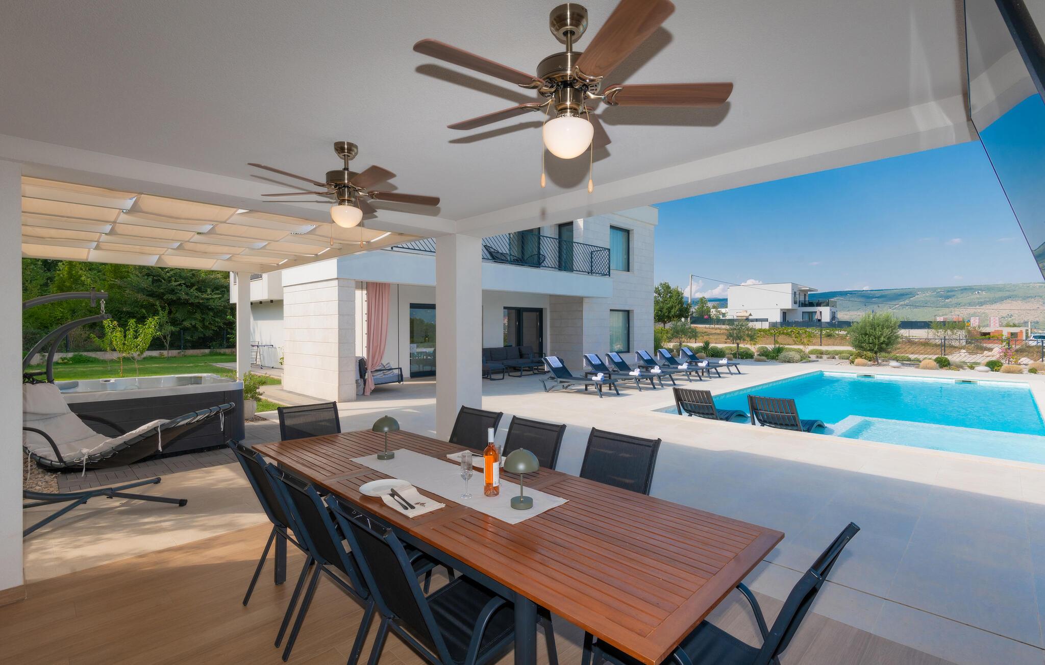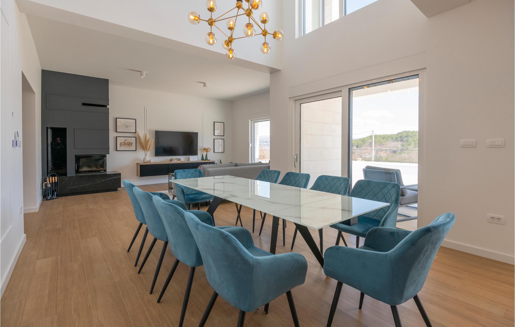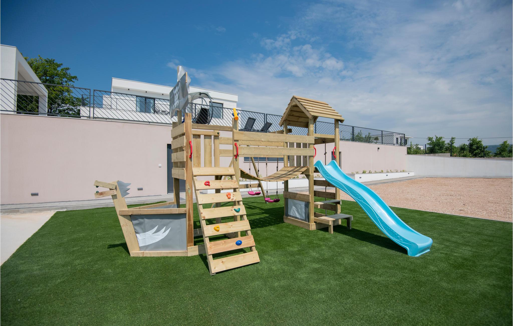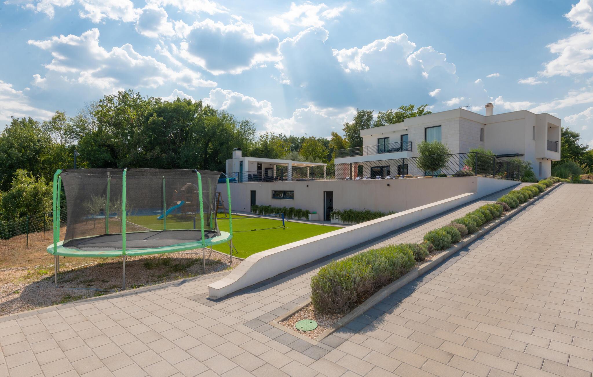 Huset er fuldt klimatiseret og består af en stueetage med stue og køkken, soveværelse, badeværelse og ekstra badeværelse med finsk sauna. En intern trappe fører til 1. sal med fire soveværelser, hver med eget badeværelse og flere balkoner med smuk udsigt til Imotski. Der er også et underholdningsrum i kælderen med billard, bordfodbold og bordtennis og en PlayStation-konsol. Friske dukkerter på varme sommerdage kan fås i den attraktive pool foran huset, som også har et lavvandet område for børn. Ved siden af dette finder I et spabad og et sommerkøkken med grill til at tilberede jeres yndlingsspecialiteter. Der er også faciliteter for børn, der kan lege på legepladsen ved huset.