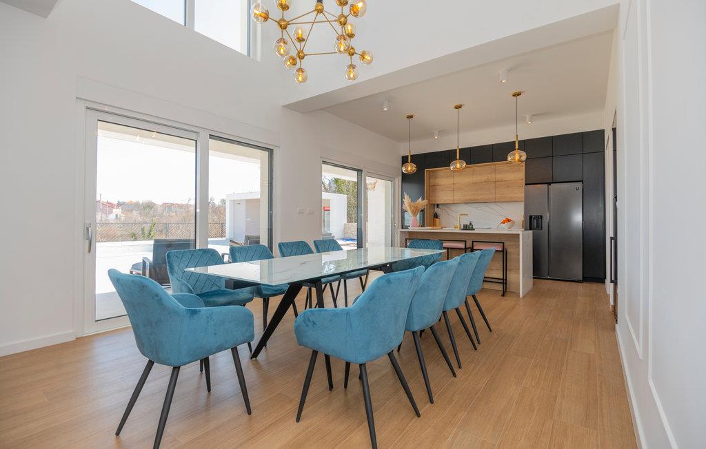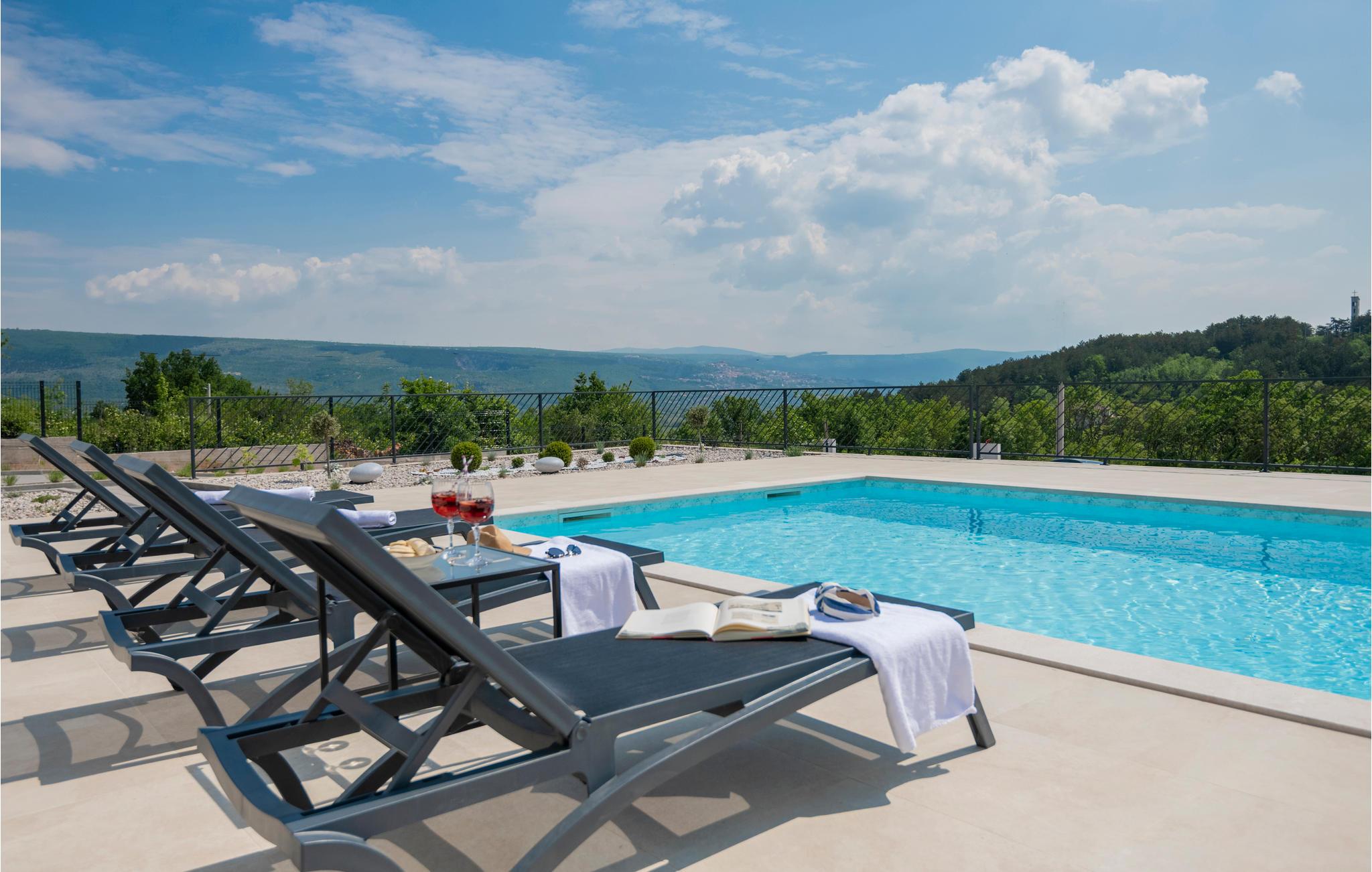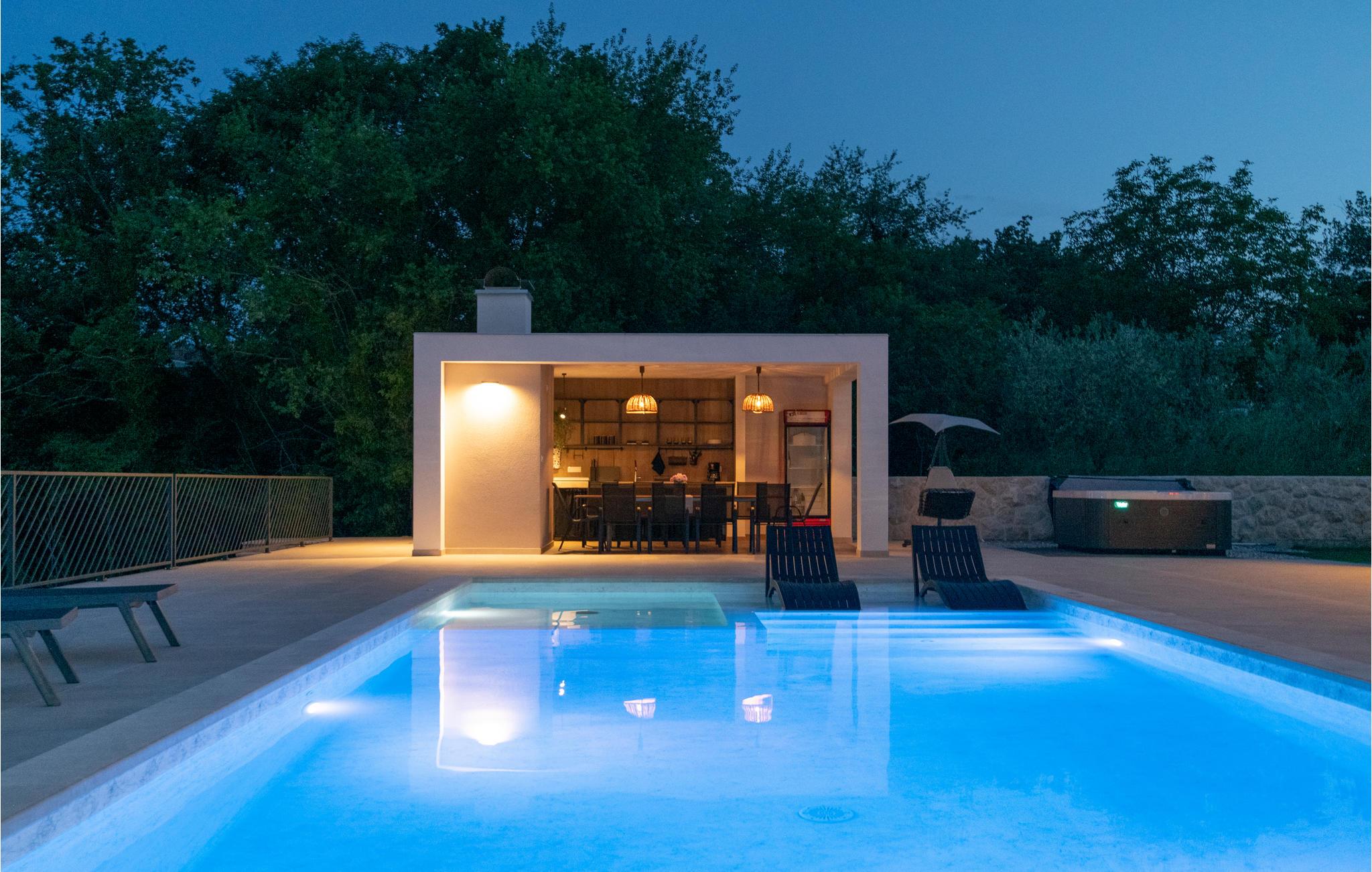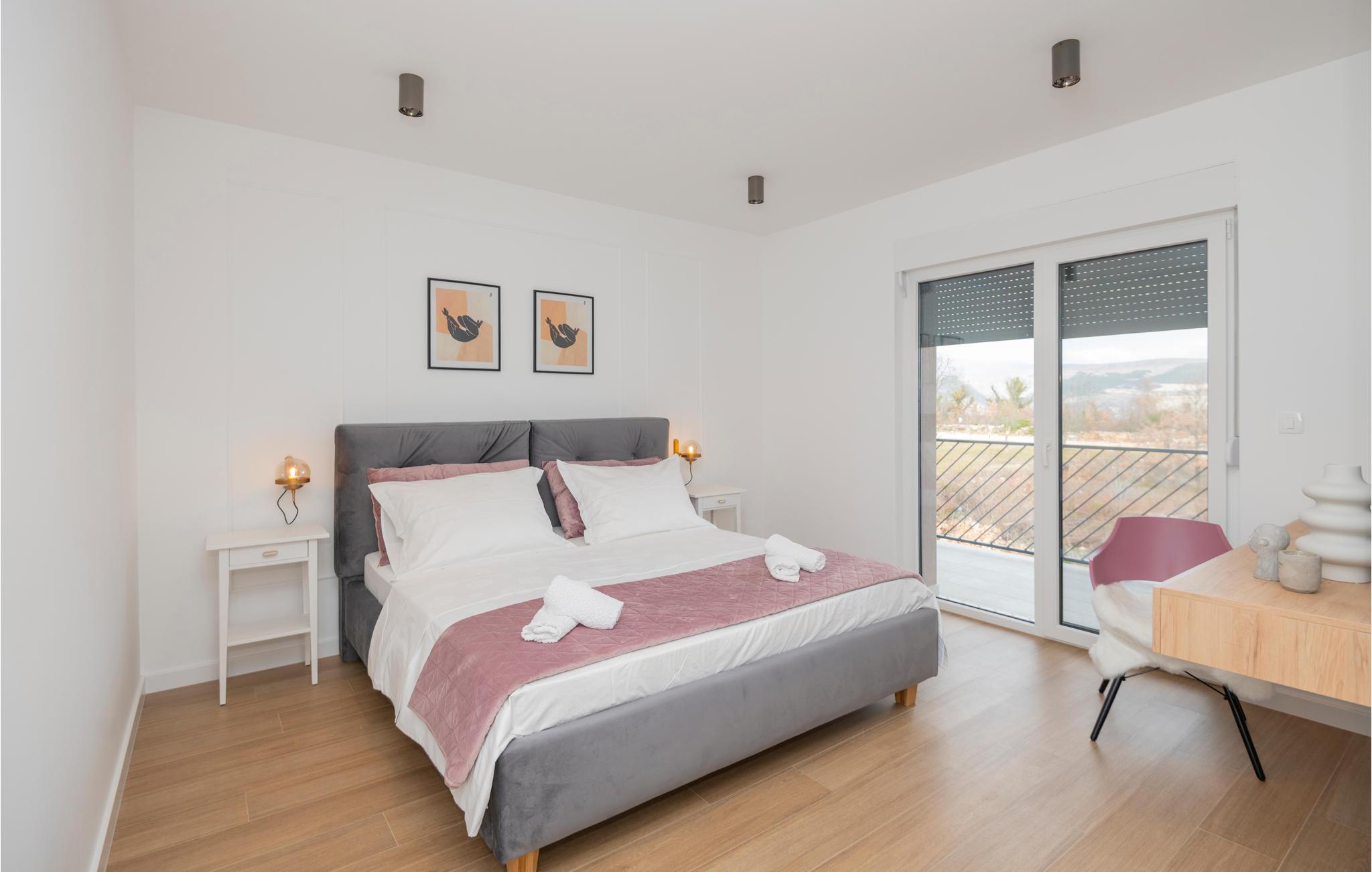 Huset er fuldt klimatiseret og består af en stueetage med stue og køkken, soveværelse, badeværelse og ekstra badeværelse med finsk sauna. En intern trappe fører til 1. sal med fire soveværelser, hver med eget badeværelse og flere balkoner med smuk udsigt til Imotski. Der er også et underholdningsrum i kælderen med billard, bordfodbold og bordtennis og en PlayStation-konsol. Friske dukkerter på varme sommerdage kan fås i den attraktive pool foran huset, som også har et lavvandet område for børn. Ved siden af dette finder I et spabad og et sommerkøkken med grill til at tilberede jeres yndlingsspecialiteter. Der er også faciliteter for børn, der kan lege på legepladsen ved huset.