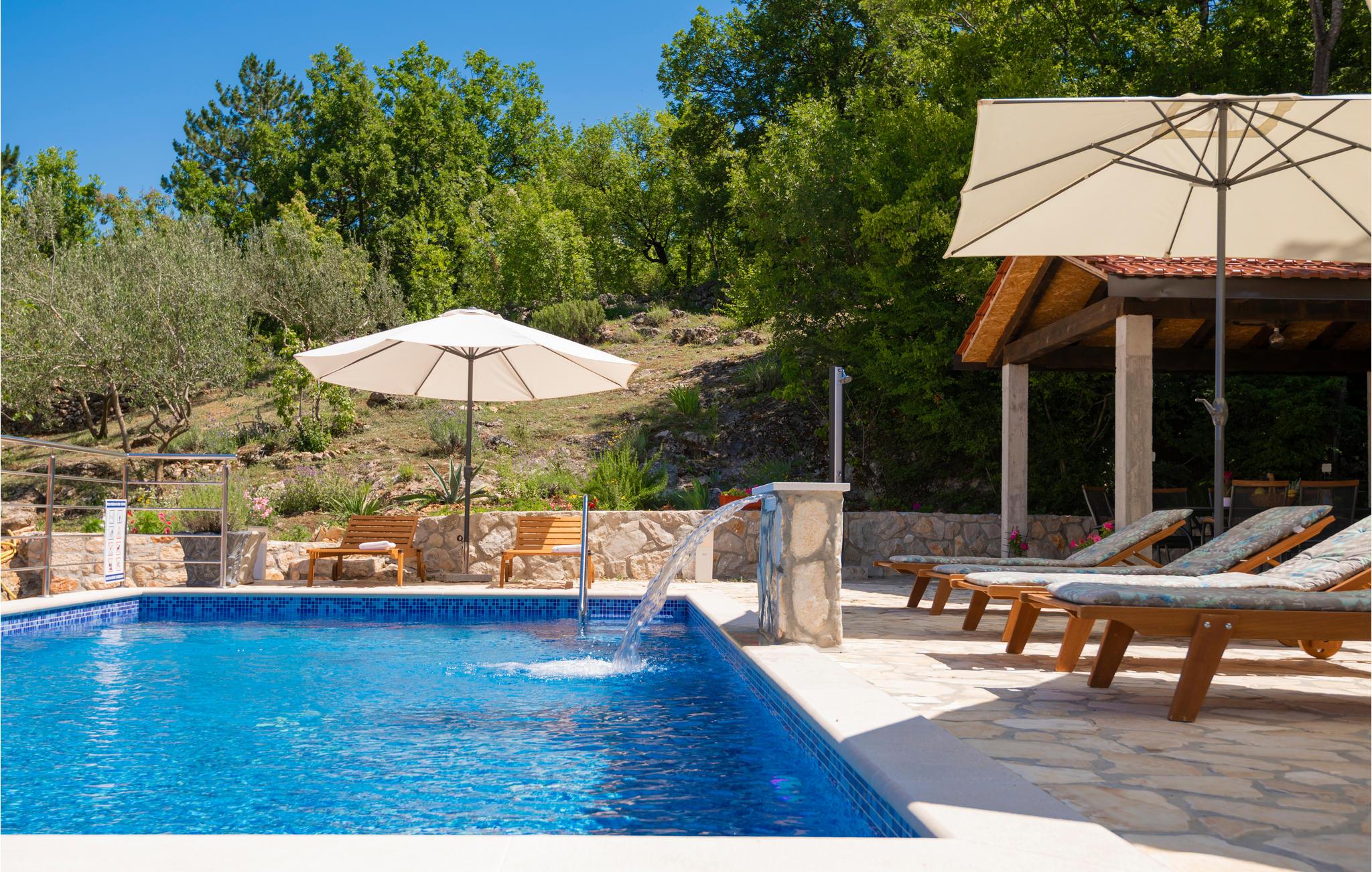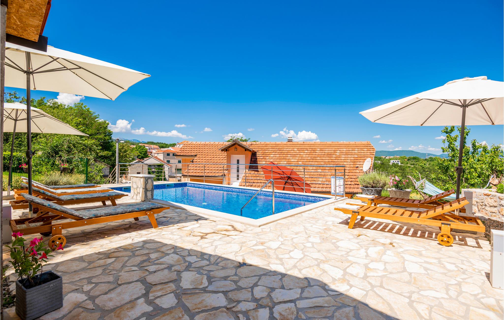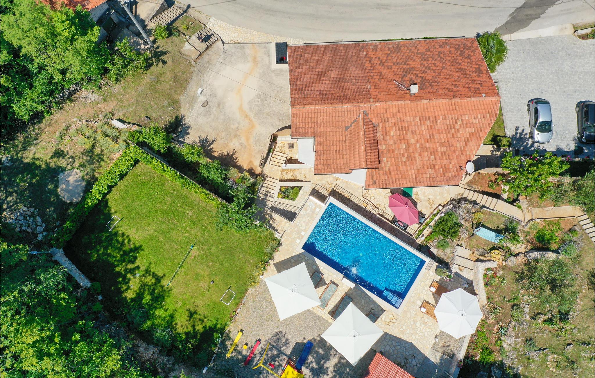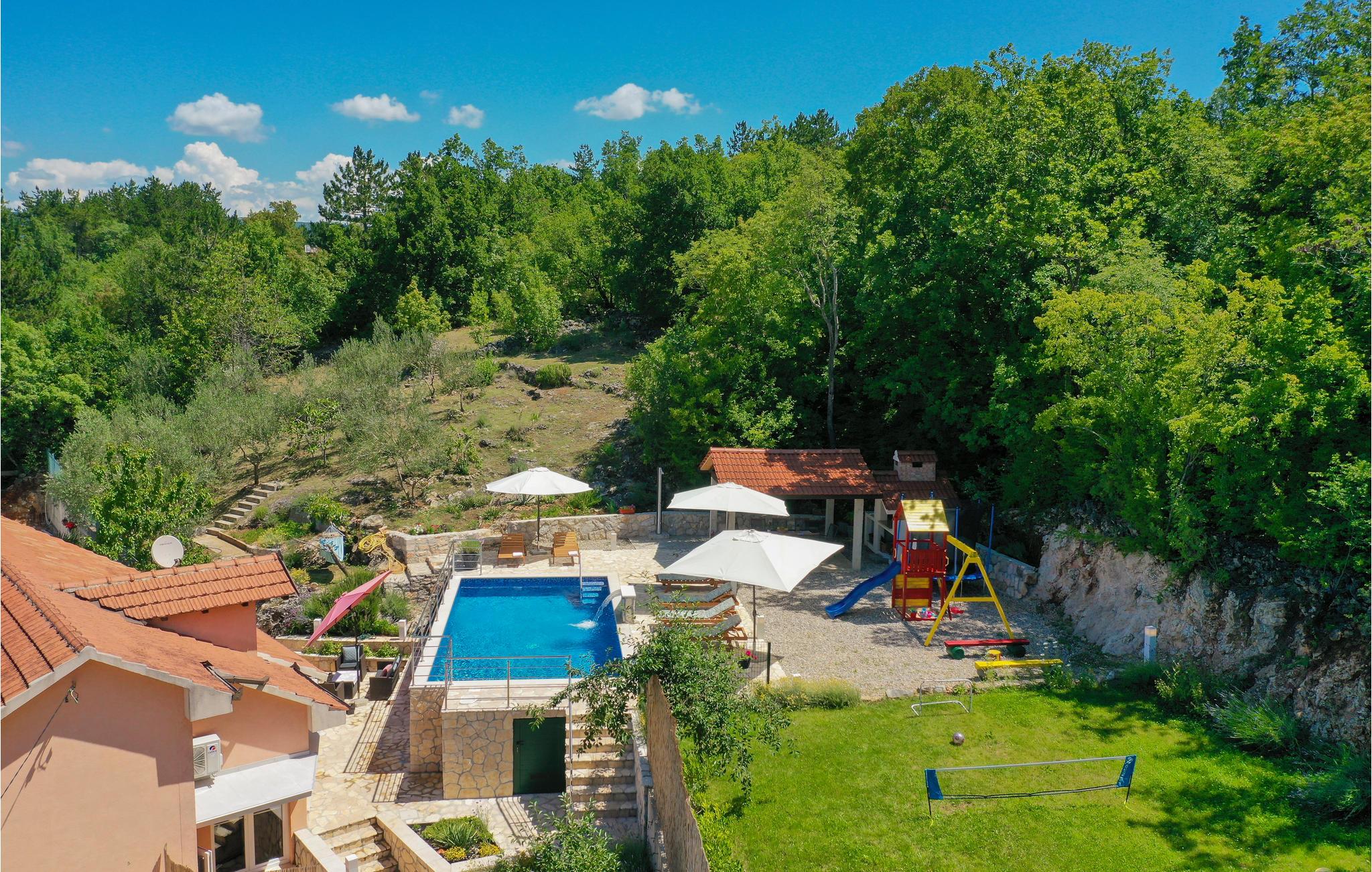 Dette smagfuldt indrettede feriehus med privat pool ligger i Grubine, i Dalmatiens skønne bagland. Der rummer alt, hvad I behøver til en komfortabel og uforglemmeligt dejlig ferie. Nyd at svømme og pjaske i den skønne ugenerte pool, lav lækker mad på grillen og hav sjov i aktivitetsrummet, mens jeres yngste leger på legepladsen. I stueplan er der køkken der åbent mod stuen, wc og aktivitetsrum. Indre trapper fører op til overetagen, med fire soveværelser og to badeværelser. Det tager kun 20 minutter i bil at køre til de skønne kiesstrande ved Makarskas riviera. Der er kun fem km til byen Imotski med forskellige former for underholdning.
