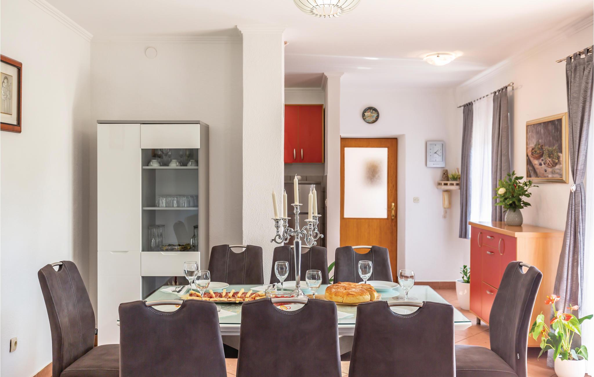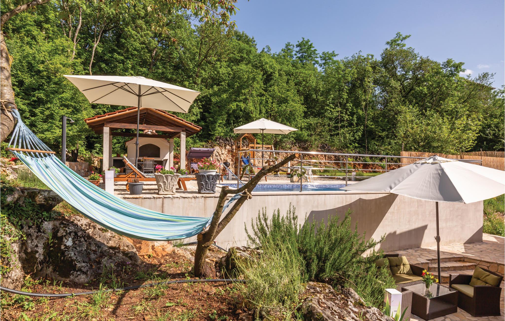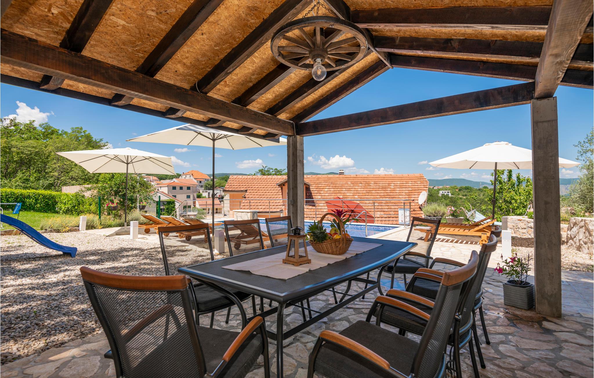 Dette smagfuldt indrettede feriehus med privat pool ligger i Grubine, i Dalmatiens skønne bagland. Der rummer alt, hvad I behøver til en komfortabel og uforglemmeligt dejlig ferie. Nyd at svømme og pjaske i den skønne ugenerte pool, lav lækker mad på grillen og hav sjov i aktivitetsrummet, mens jeres yngste leger på legepladsen. I stueplan er der køkken der åbent mod stuen, wc og aktivitetsrum. Indre trapper fører op til overetagen, med fire soveværelser og to badeværelser. Det tager kun 20 minutter i bil at køre til de skønne kiesstrande ved Makarskas riviera. Der er kun fem km til byen Imotski med forskellige former for underholdning.