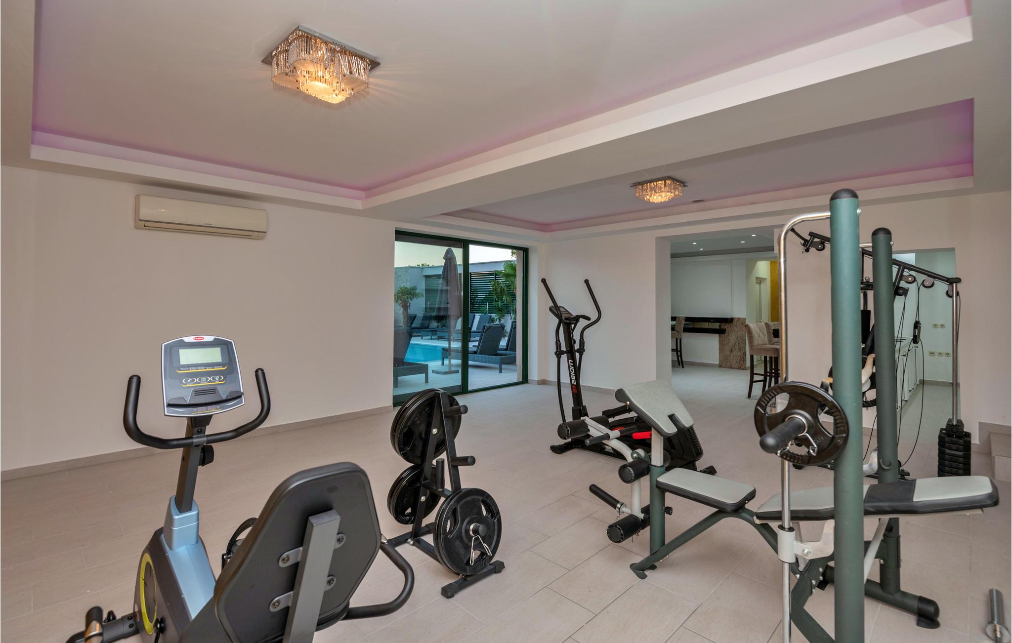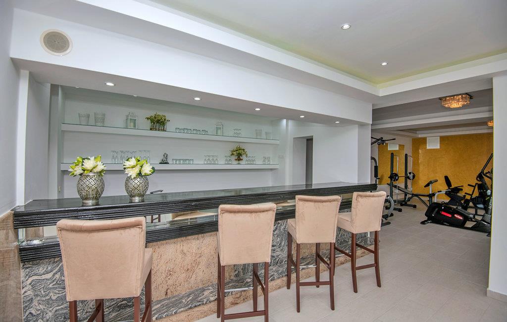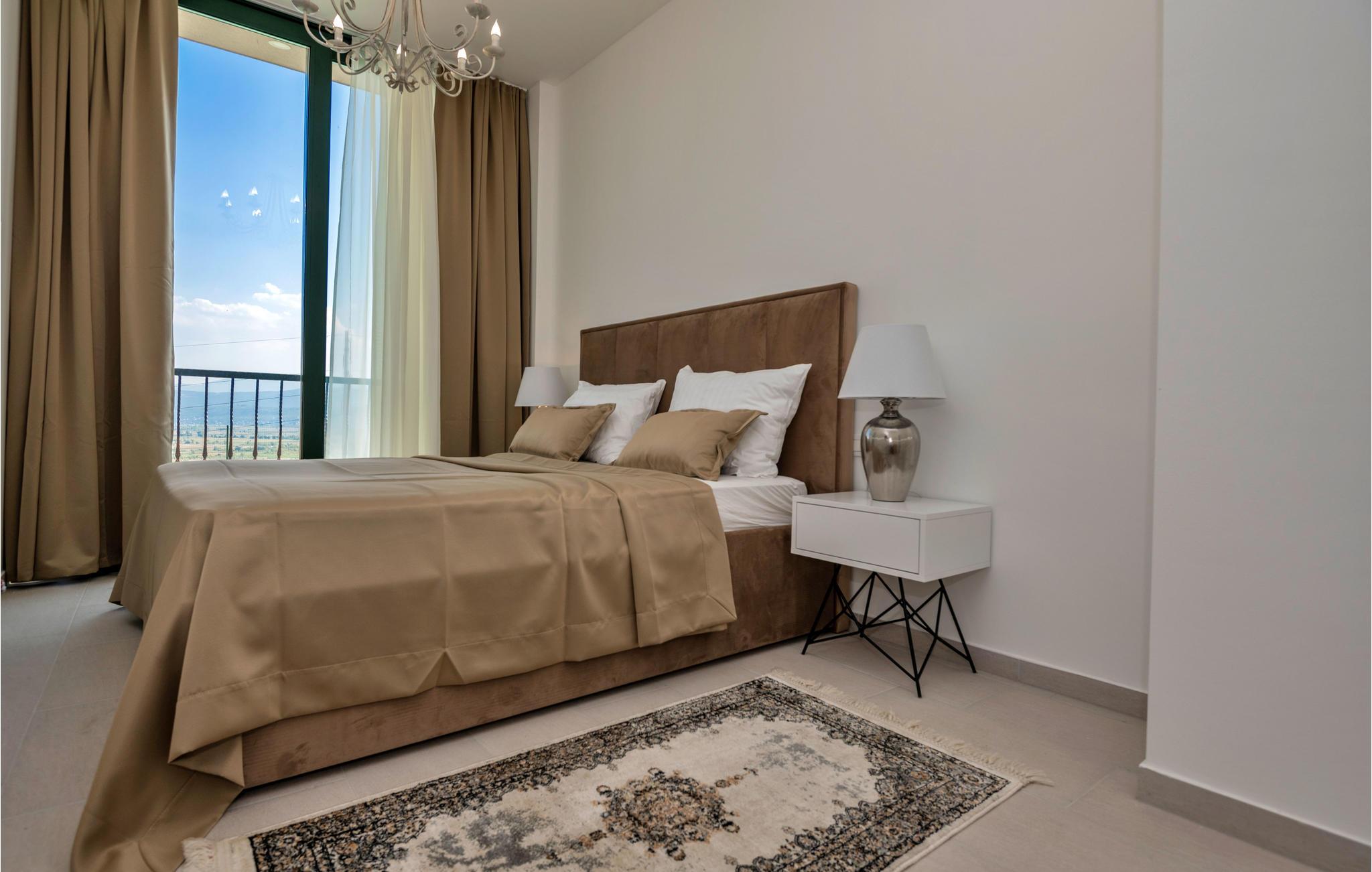Det større hus har to lejligheder og flere terrasser samt en vidunderlig udsigt over de omkringliggende marker og bjerge. På anden sal ligger ??en lejlighed med tre soveværelser, køkkenalrum og badeværelse, mens lejligheden på første sal består af to soveværelser, køkkenalrum samt badeværelse og ekstra toilet. Stueetagen med en sauna, en bar, en lounge med bordtennis, bordfodbold, dart og et fitnessrum med forskelligt udstyr og et badeværelse er forbundet til første sal via interne trapper.