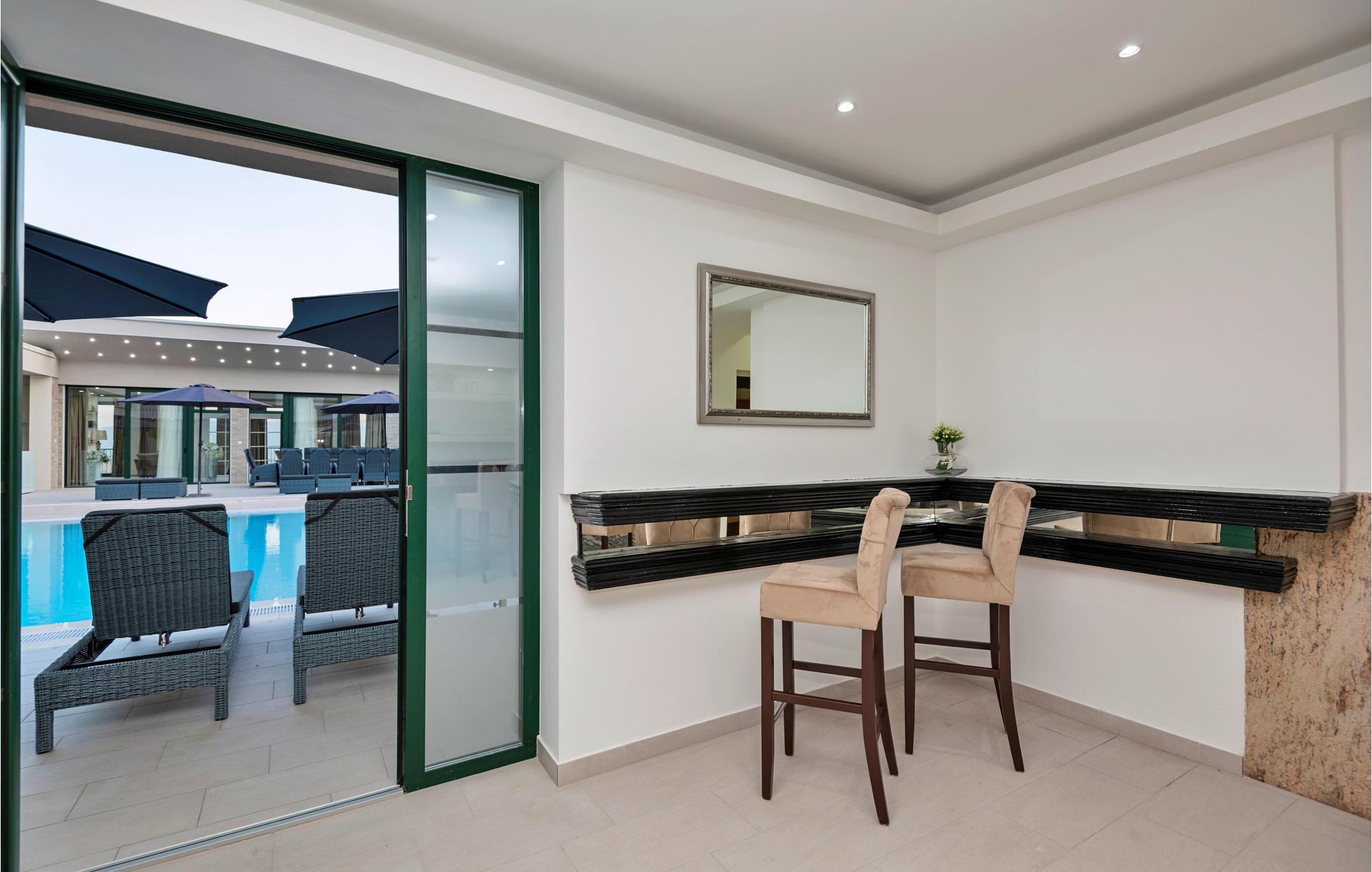 Ejendommen fordeler sig på to huse med udendørs terrasse og swimmingpool i midten, hvor I kan glæde jer til at tilbringe mange skønne timer.