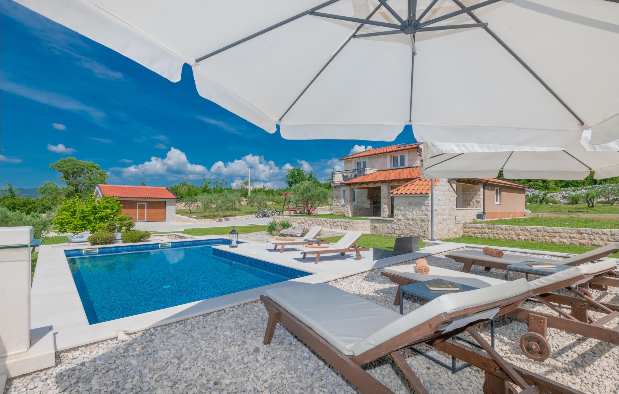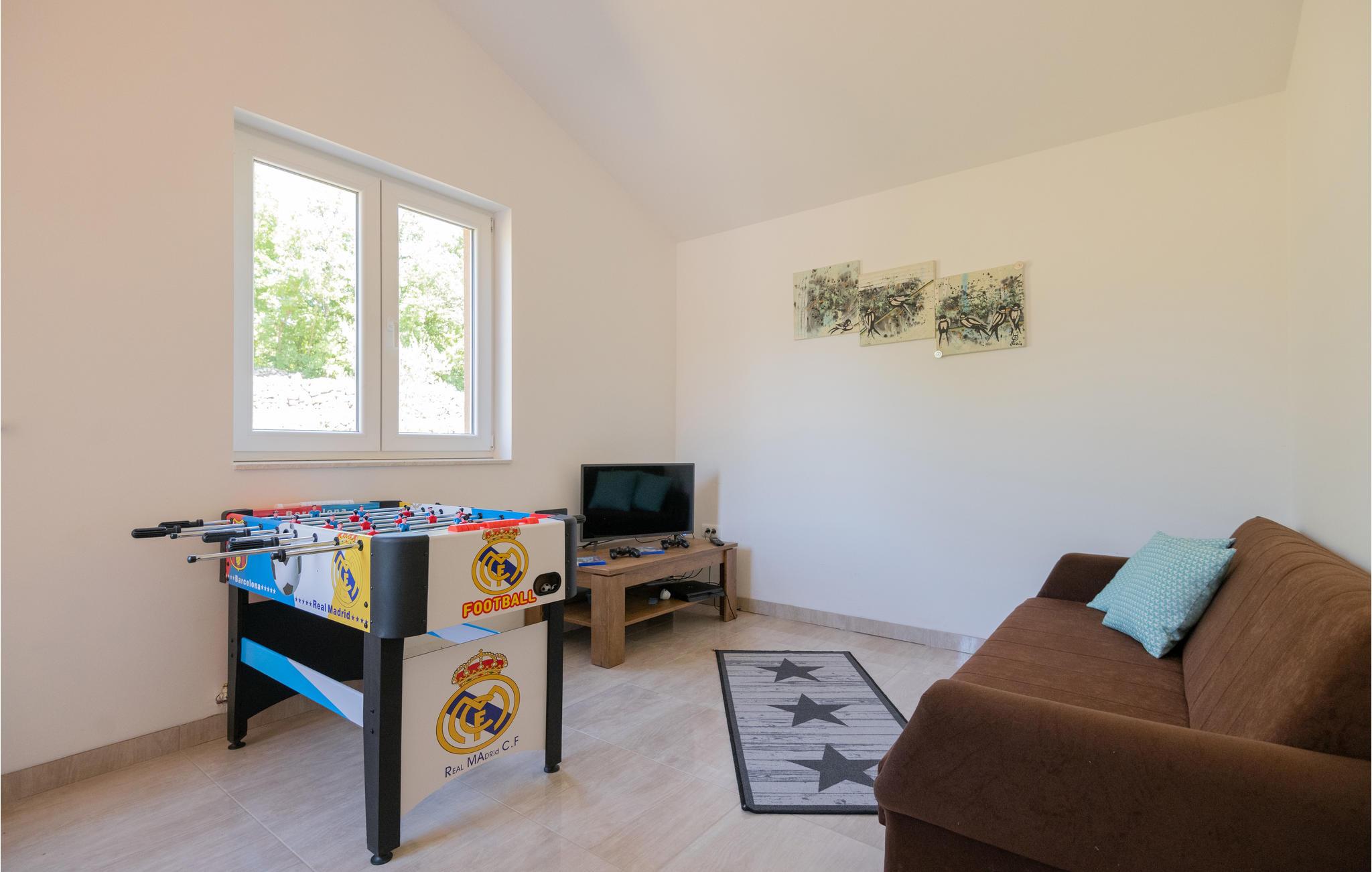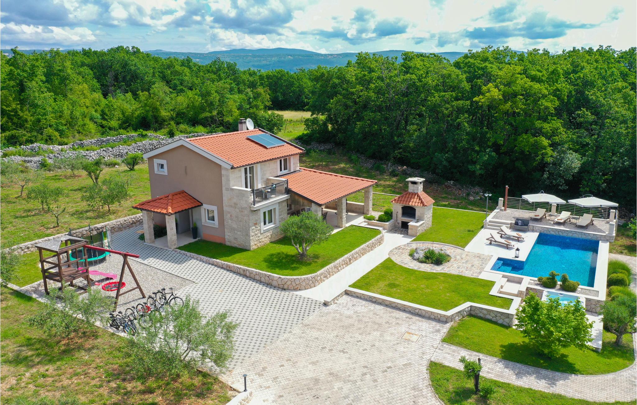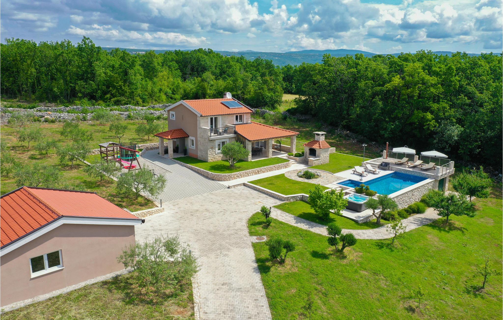 Dette skønne feriehus ligger i idylliske landlige omgivelser. Det er smagfuldt indrettet og omgivet af en grund med frugt- og oliventræer. Bag huset, med separat indgang er der et aktivitetsrum med dart, bordfodbold og PlayStation. Der hører også cykler med til huset, som I kan bruge til at udforske området på to hjul. Foran huset er der en overdækket terrasse med grill, herfra kan i nyde udsigten over Naturparken Biokovos nordside. På husets sydside er der en pool med massagedyser og legeredskaber til børnene. De sidste ca. 400 m op til huset er en grusvej. Det tager ca. 20 minutter at køre til Makarska.