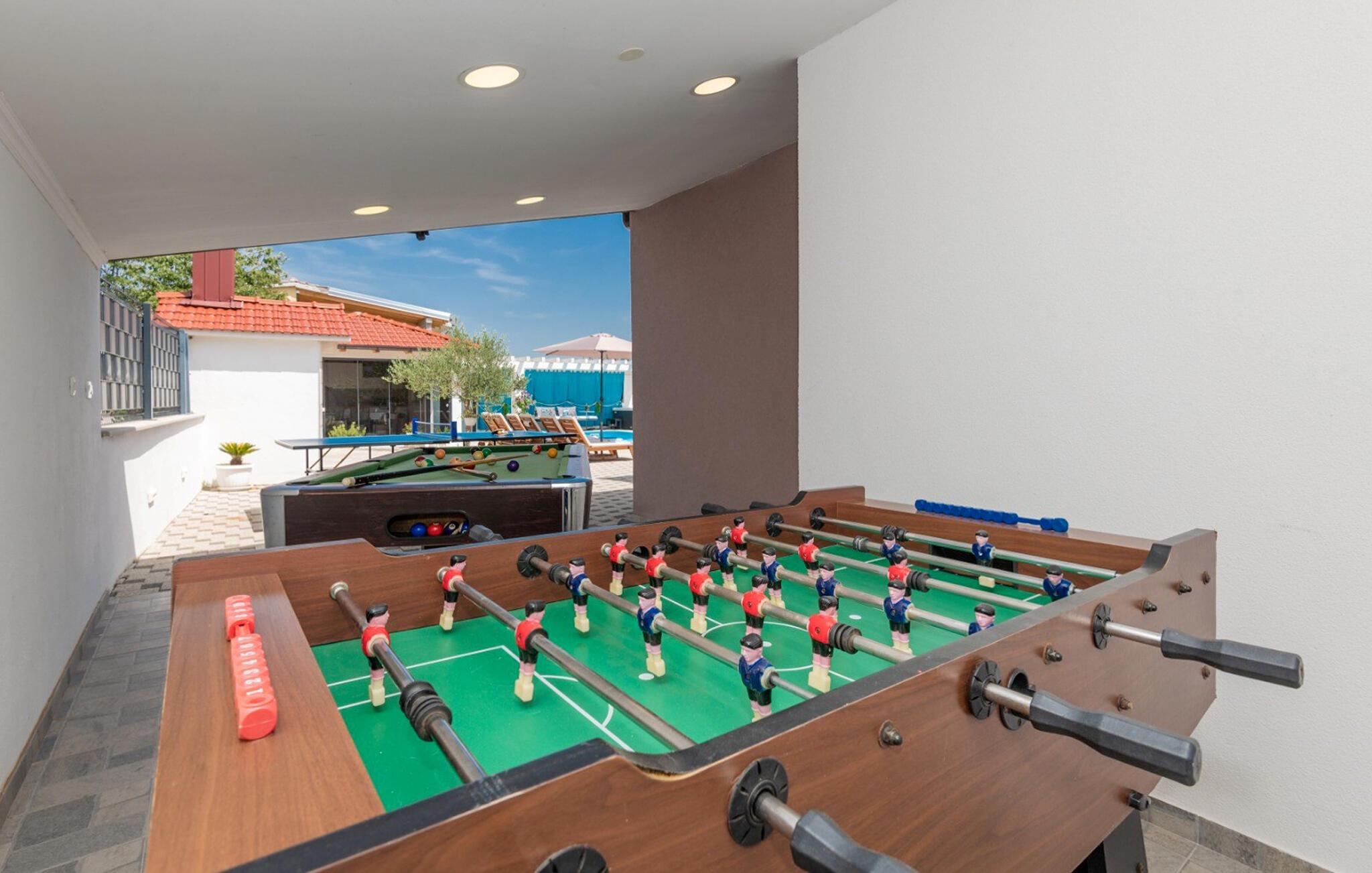 Bungalowen er fuldt udstyret og tilbyder jer et behageligt ophold. Forfrisk jer selv i poolen på varme sommerdage. Ved siden af ??ligger en overdækket terrasse med grill til lækre måltider. Bag huset er rekreationsrummet med billard og andre aktiviteter. Udendørs legeredskaber hjælper med at holde børnene underholdt.