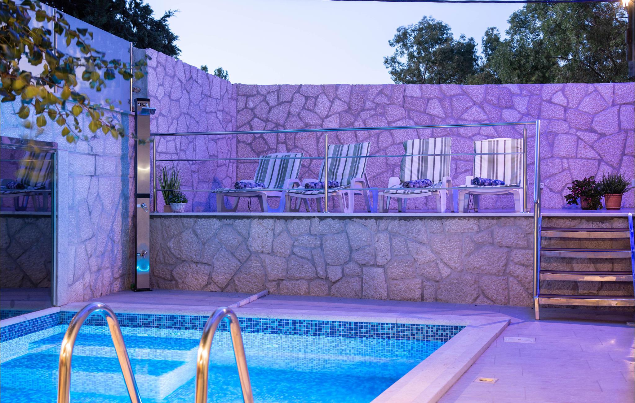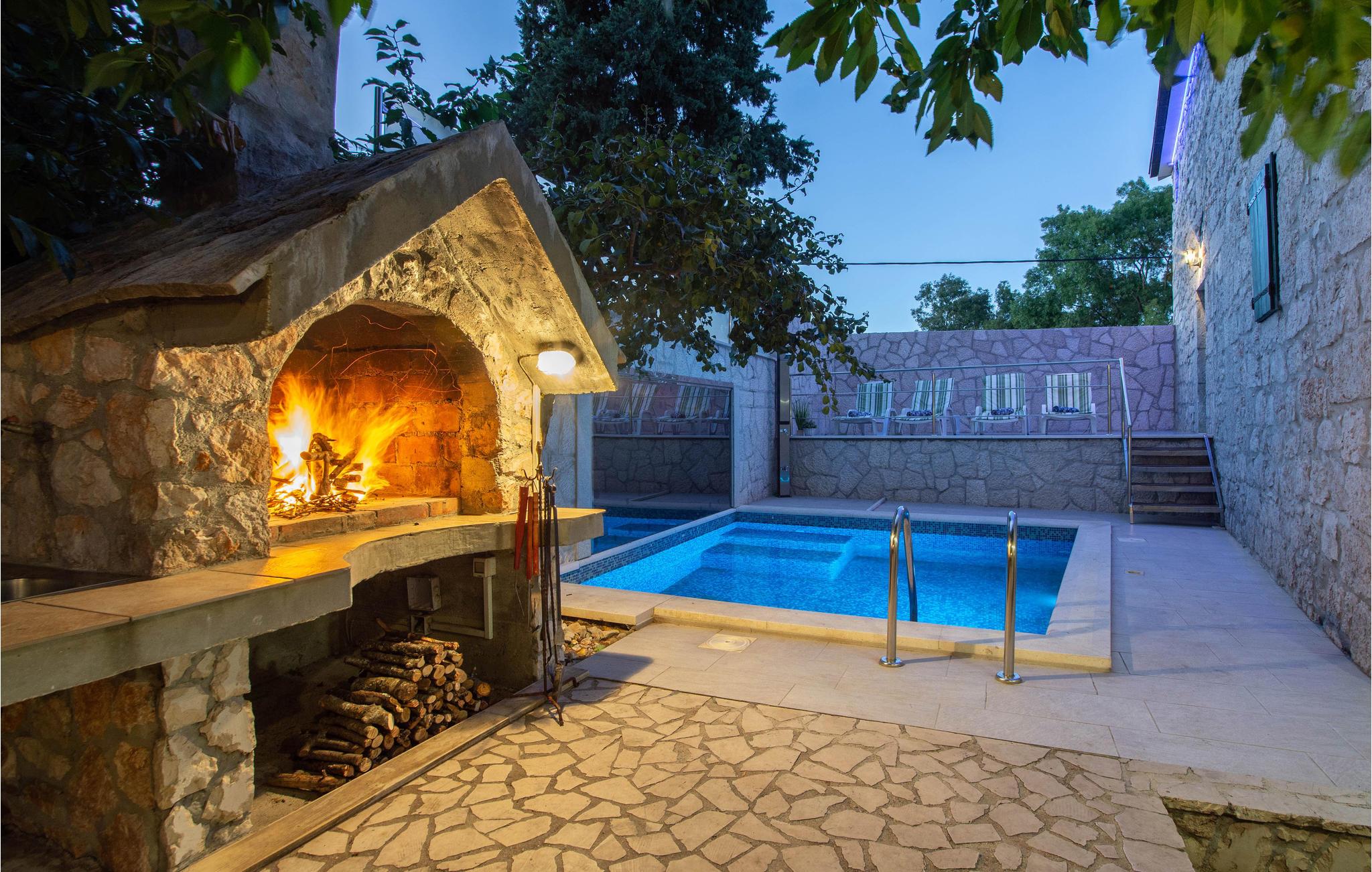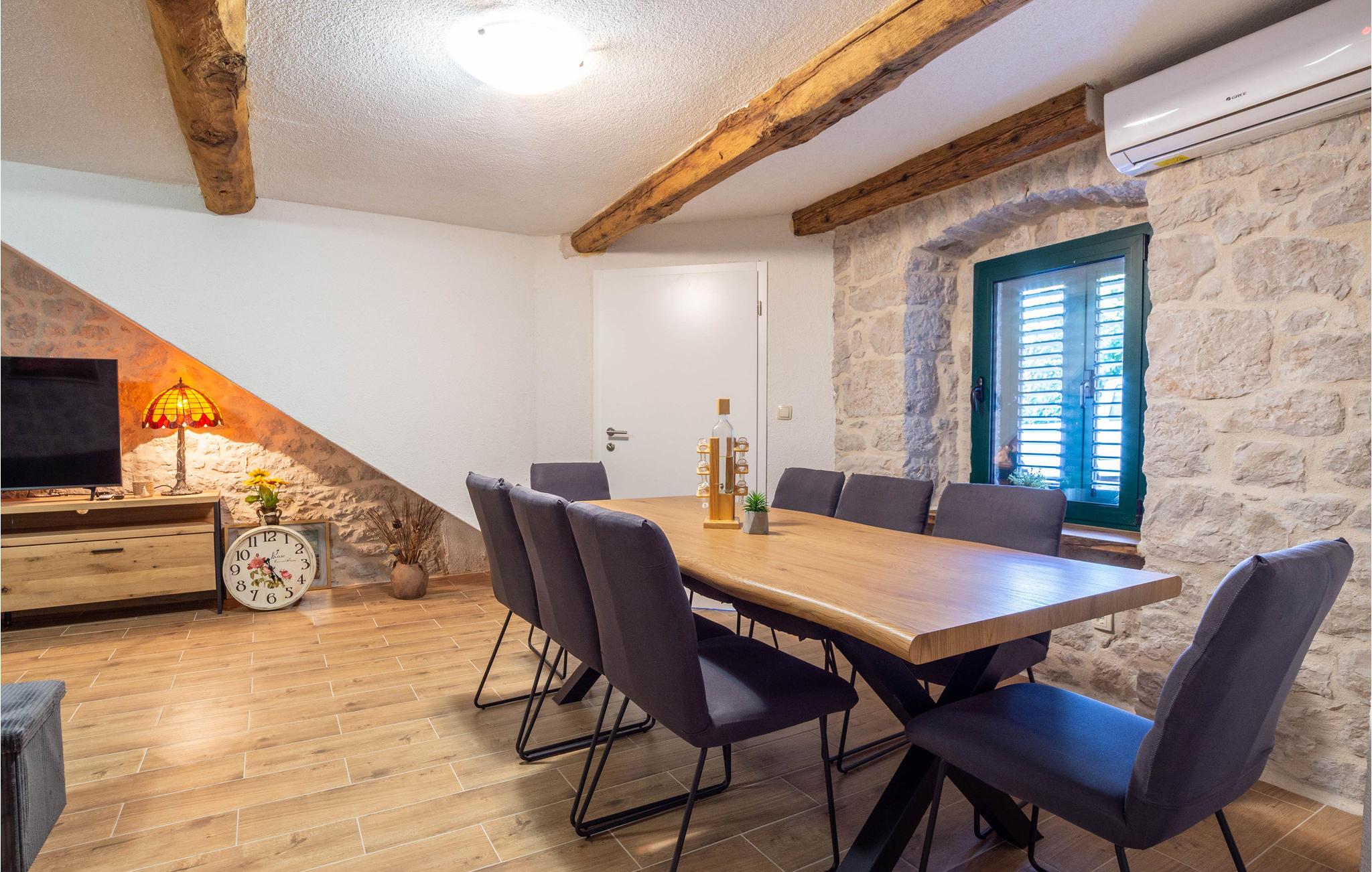 Dette rækkehus er renoveret i 2008 og ligger i grønne omgivelser i en lille dalmatinsk by. Værelserne ligger på 2 etager og er forbundet med en trappe. Loftsetagen er med delvis lave lofter og skråvægge. I nærheden ligger en flod, hvor I kan bade. Hvis det ønskes, kan der fra udlejeren købes vin og frugt fra husejers egen have. Der er fire parkeringspladser til rådighed. Ud over poolen hvor I kan svømme lige så tit I vil, er her både en legeplads, samt dartskive og bordfodbold, så hverken store eller små kommer til at kede sig. Et perfekt område til at slappe af i den friske luft og tage på ture i den uberørte natur på gåben eller cykel. Besøg de nærliggende Imotskisøer, som er rene naturperler, eller kør til en af de mange strande ved Makarskas riviera og tilbring en lang behagelig dag på stranden.