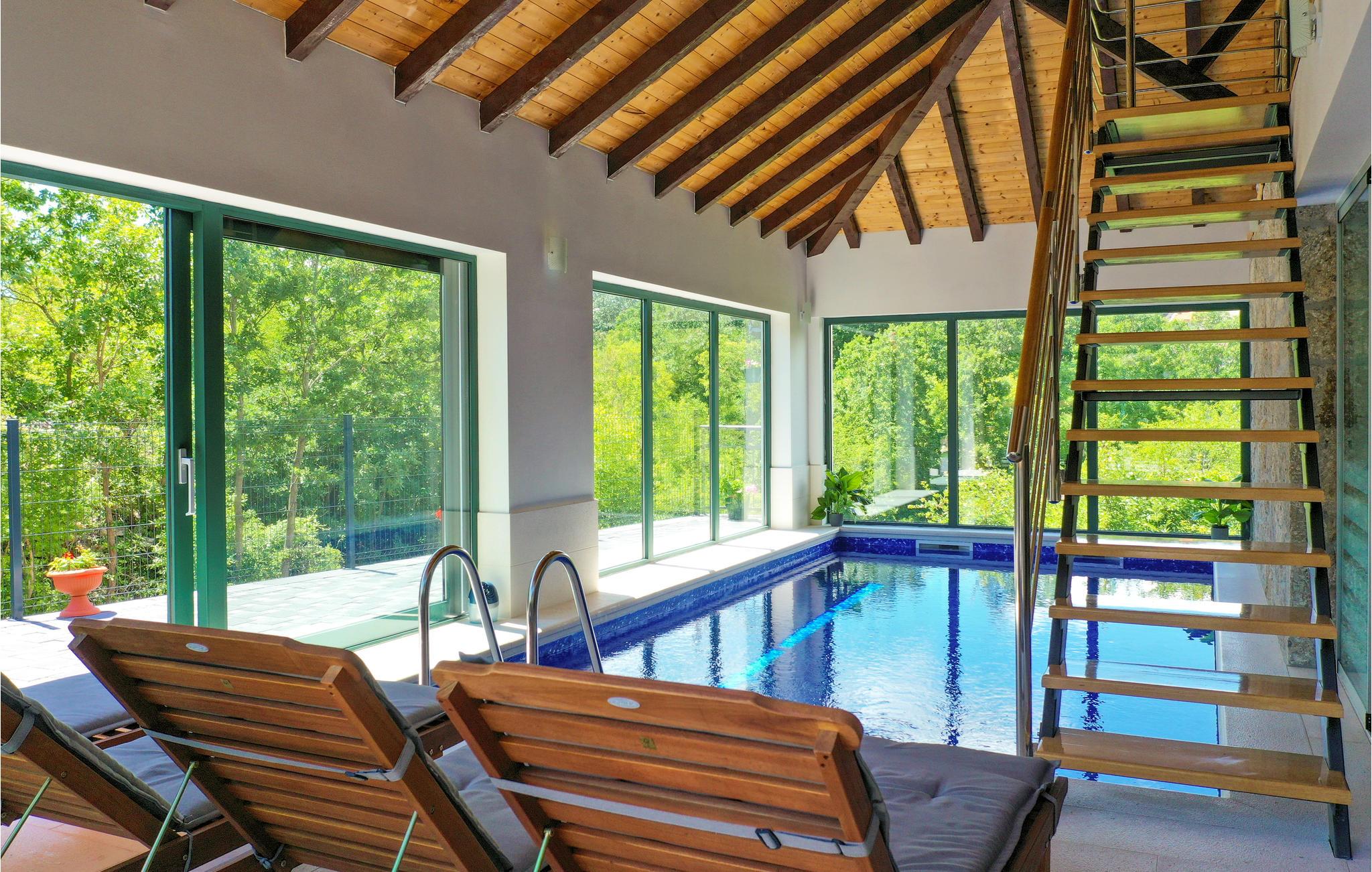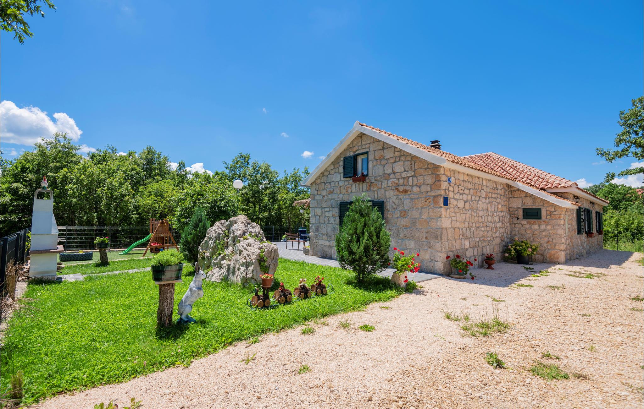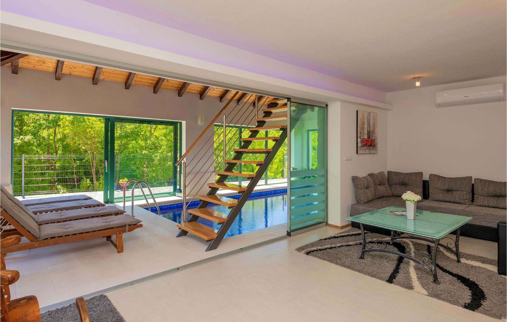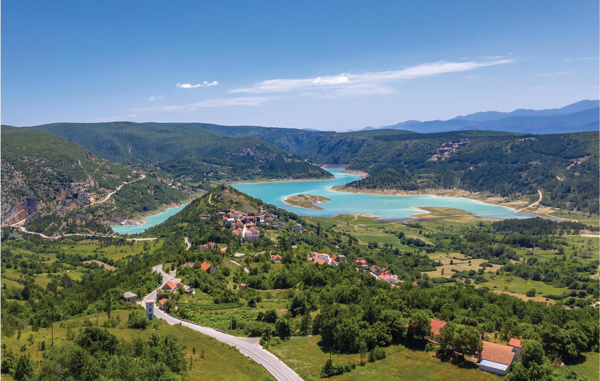 Dette skønne feriehus med indendørs pool ligger på en indhegnet grund i Mellemdalmatiens indland. Det rummer et stort køkken og stue i et, tre soveværelser og to badeværelser i stueplan, mens det fjerde soveværelse ligger på det åbne øverste plan (uden dør) med laveste loftshøjde i siden på ca. 150 cm. I stueplan er der en pool, der er omgivet af en glasskydedør, der delvist kan åbnes. Udendørs er der en skøn terrasse og legeplads hvor børnene kan få timer til at gå. Der er ca. tre km til den nærliggende sø Ricice som er velegnet til fiskeri og i den omgivende natur kan I vandre. Besøg også Imotski der ligger ca. 12 km væk. Vil I svømme I havet og nyde solen på stranden, så kør en tur til Makarska Riviera. De sidste 50 m op til huset er en grusvej.