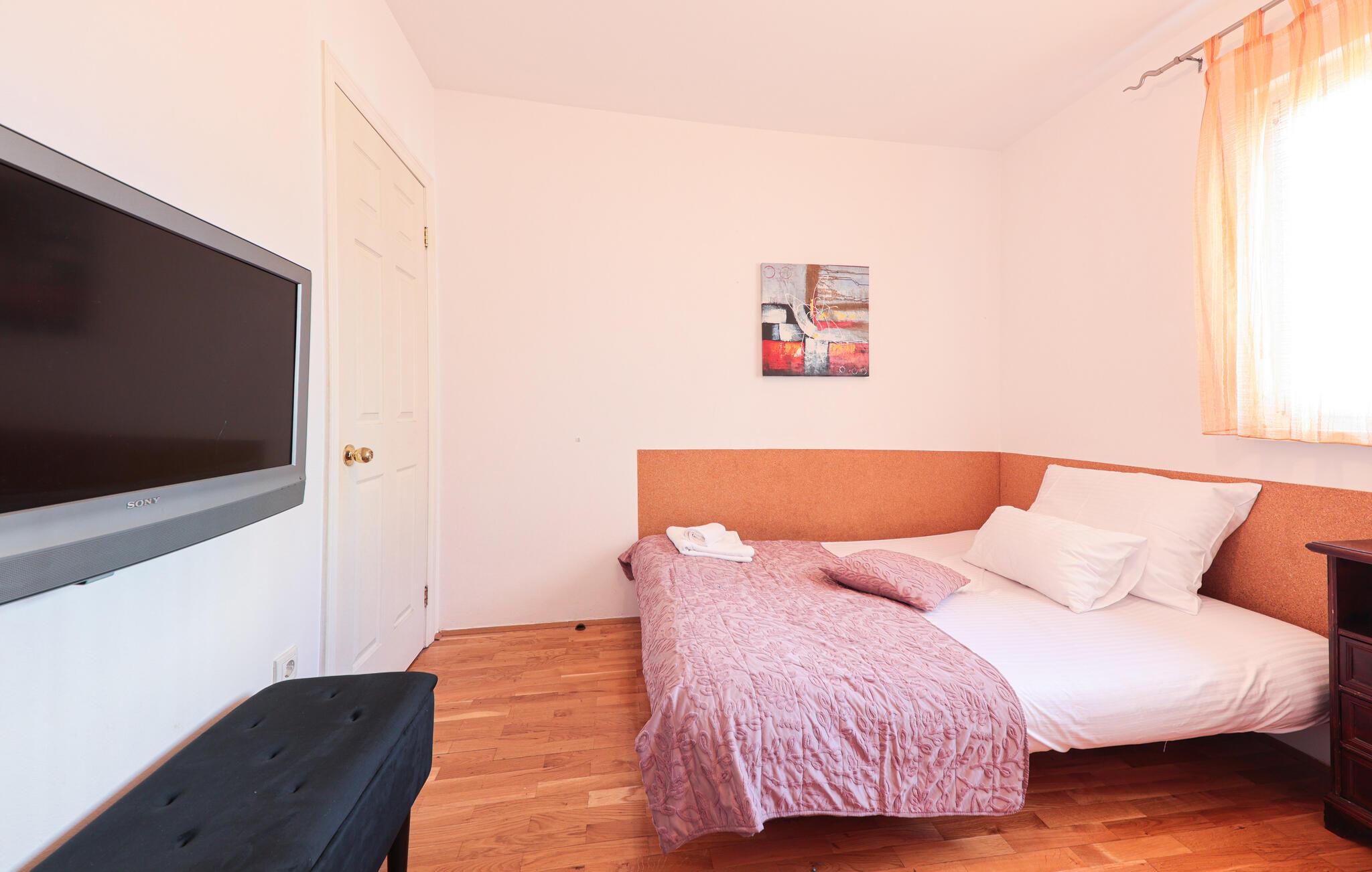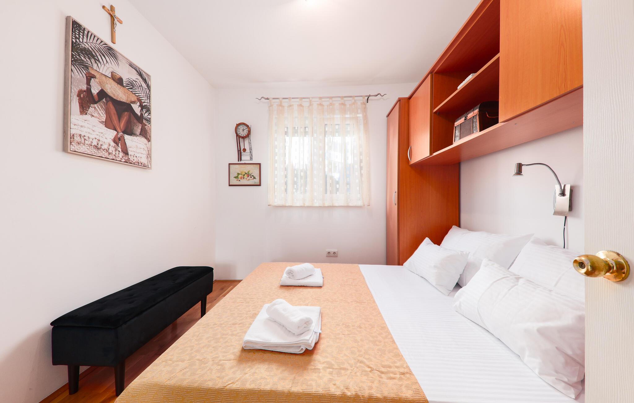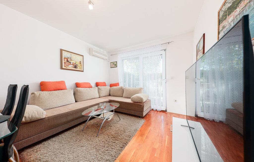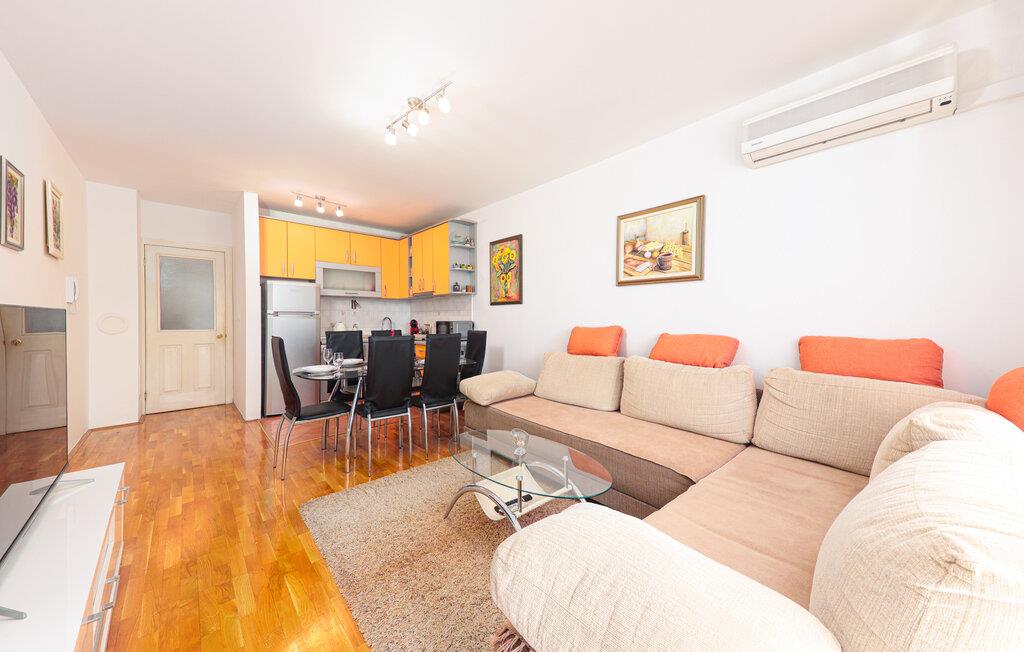 Denne lyse og hjemlige lejlighed i Makarska er ideel til familier, der leder efter komfortabel indkvartering nær stranden. Den rummelige lejlighed tilbyder jer et veludstyret køkken og lægger op til at lave mad og slappe af. Nyd hyggelige timer på jeres private terrasse eller start dagen med morgenmad med udsigt over de omkringliggende bjerge. Den stille gadeudsigt skaber en afslappet atmosfære, mens den centrale beliggenhed byder på adskillige udflugtsmuligheder.