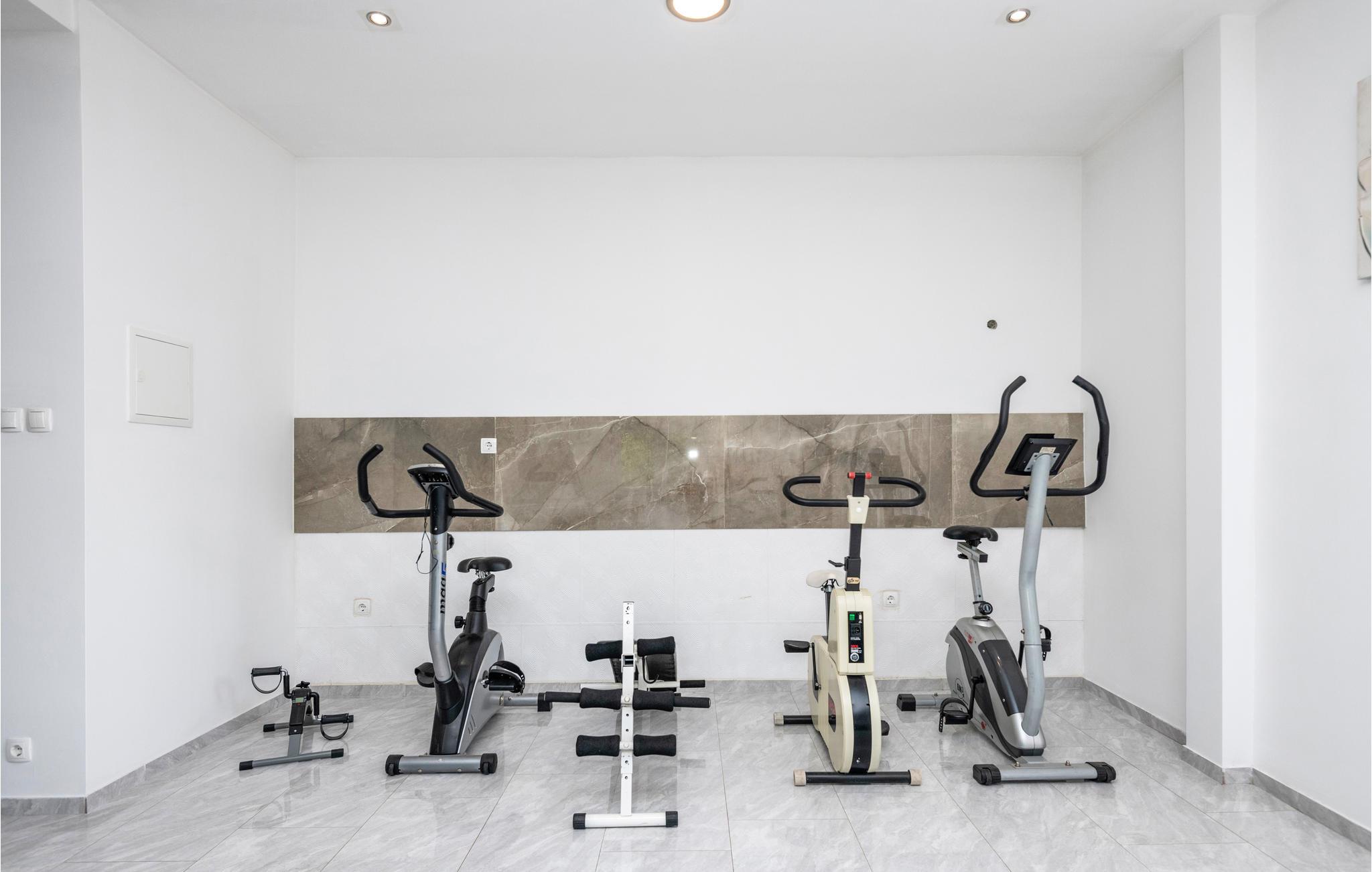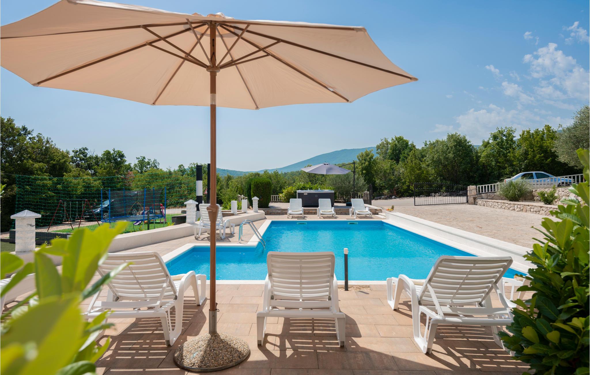 Dette hus fodeler sig over tre etager, hver med opholdsrum, ekstra toiletter og desuden også et fitnessrum på første sal. Det gør det ideelt til en stor gruppe venner eller flere familier, der ønsker at tilbringe ferien sammen. Huset har flere altaner og terrasser, bl.a. en med grill ude foran huset. Der er også en legeplads til børn, en fodboldbane med basketballkurve og badminton samt en stort set indhegnet gårdsplads. Nyd timer ved poolen, grill sammen på terrassen eller slik sol, mens børnene leger.