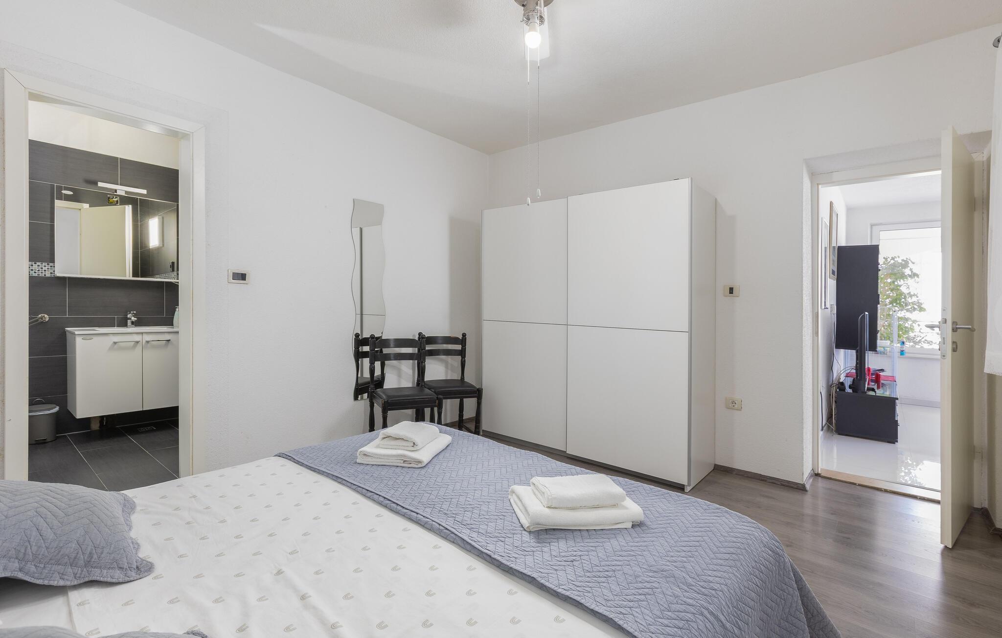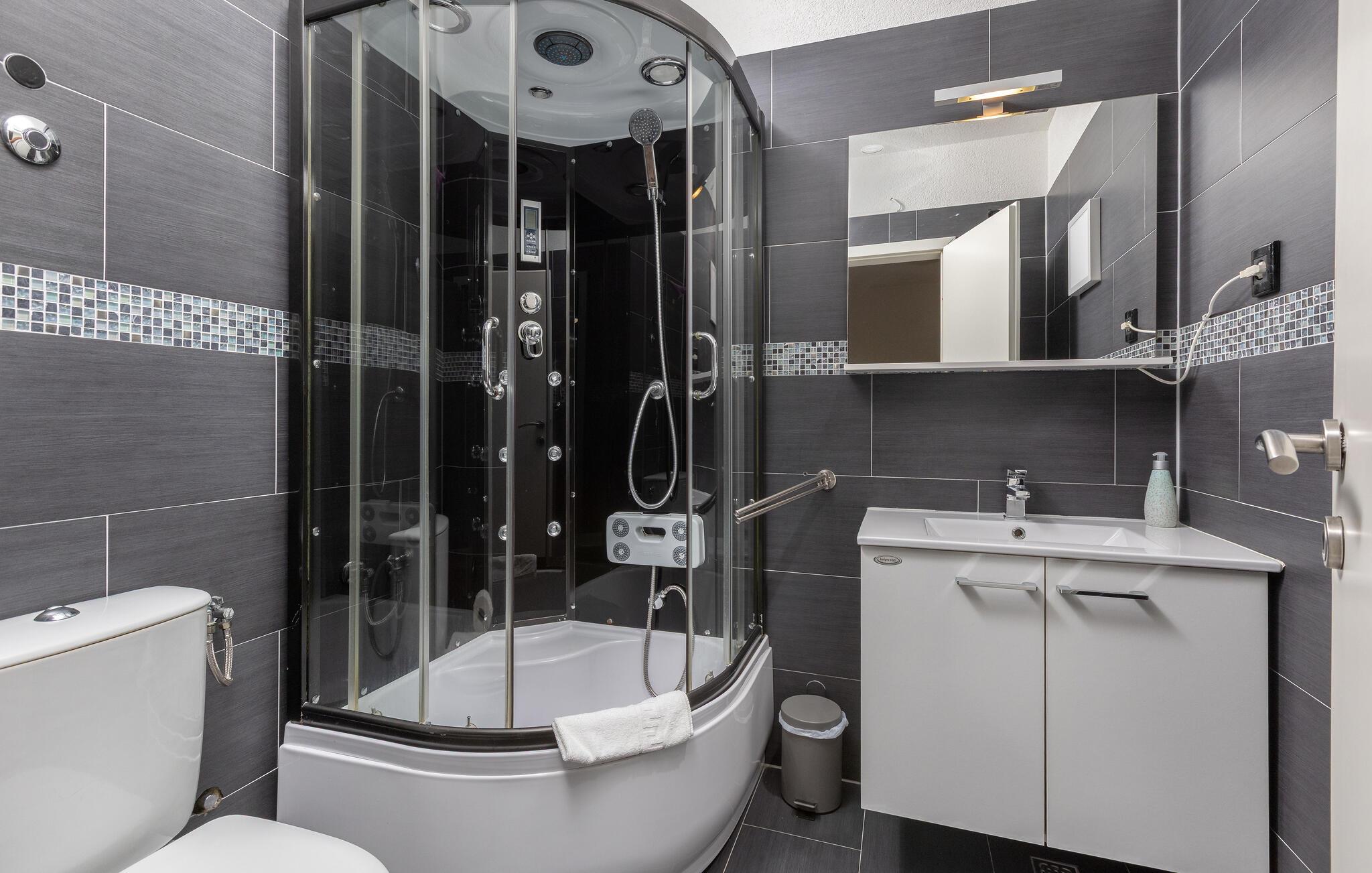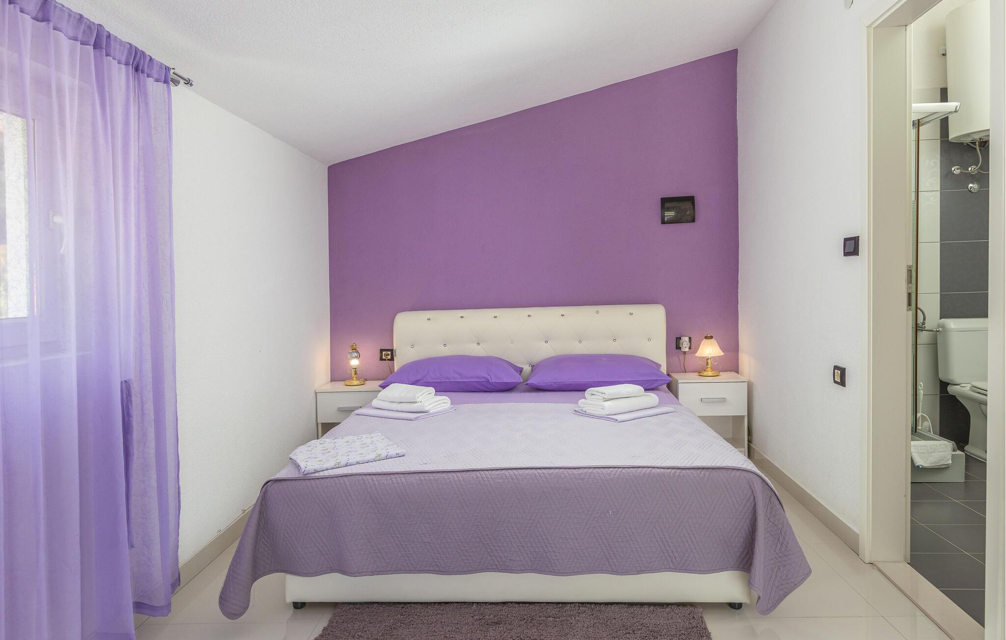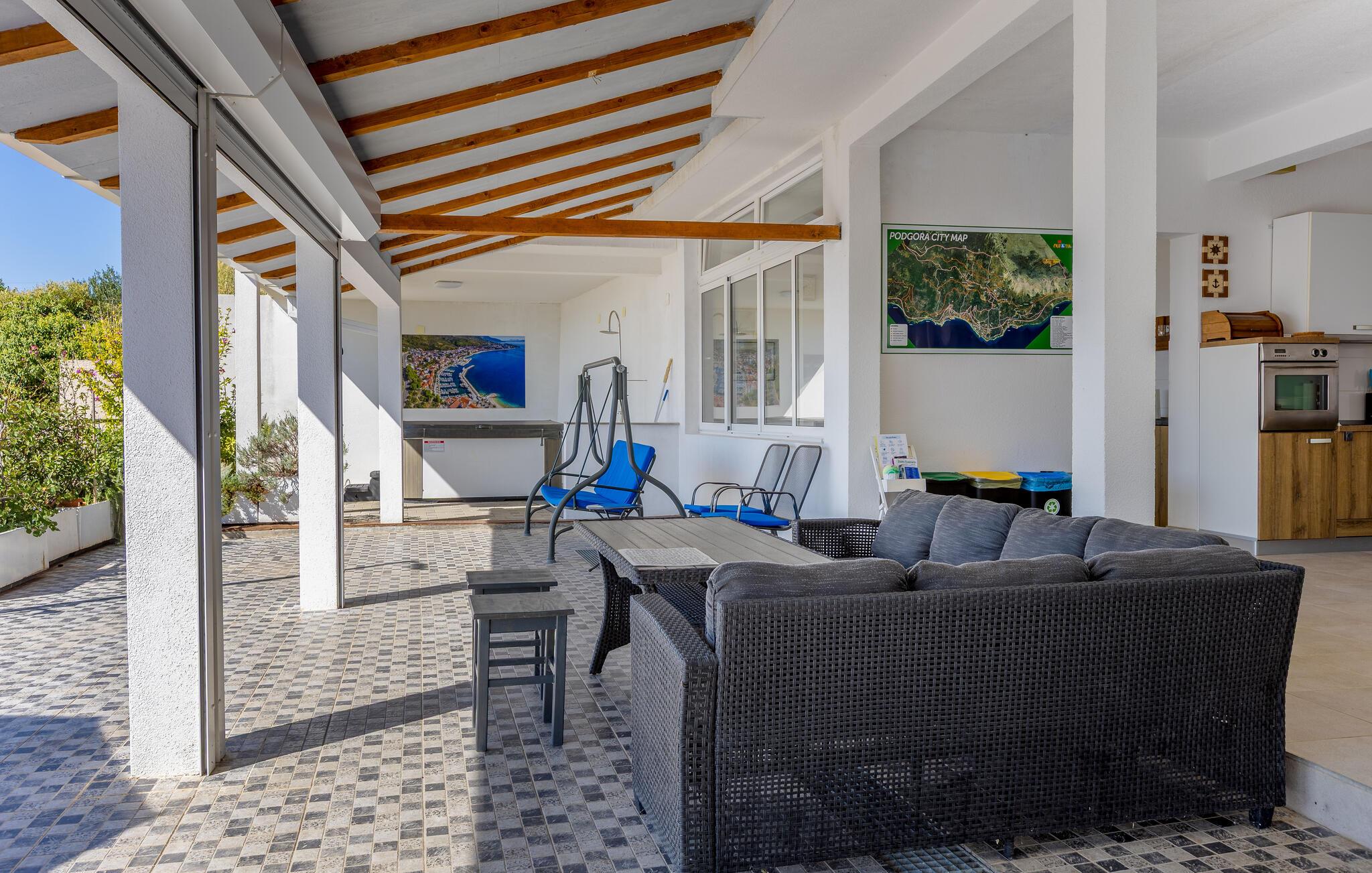 På en bakketop i byen Podgora, neden for nationalparken Biokovo, ligger dette hus med pool, som er godt indrettet. Huset fordeler sig på stueplan, første og anden sal, alle forbundet med udendørs trapper. I stueplan og på første sal er der køkken i åben forbindelse med stuen, to soveværelser og to badeværelser, mens der er tre yderligere soveværelser og et badeværelse på anden sal. Flere enheder har indgang udefra. Forfrisk jer i poolen, og slap af i whirlpoolen på terrassen på første sal. Her er også et aktivitetsrum og et udendørs køkken. Om aftenen kan I slentre gennem byen eller spise aftensmad på en af de gode restauranter. Podagras centrum, 2 km væk, har lange kiselstrande og meget at se og opleve.