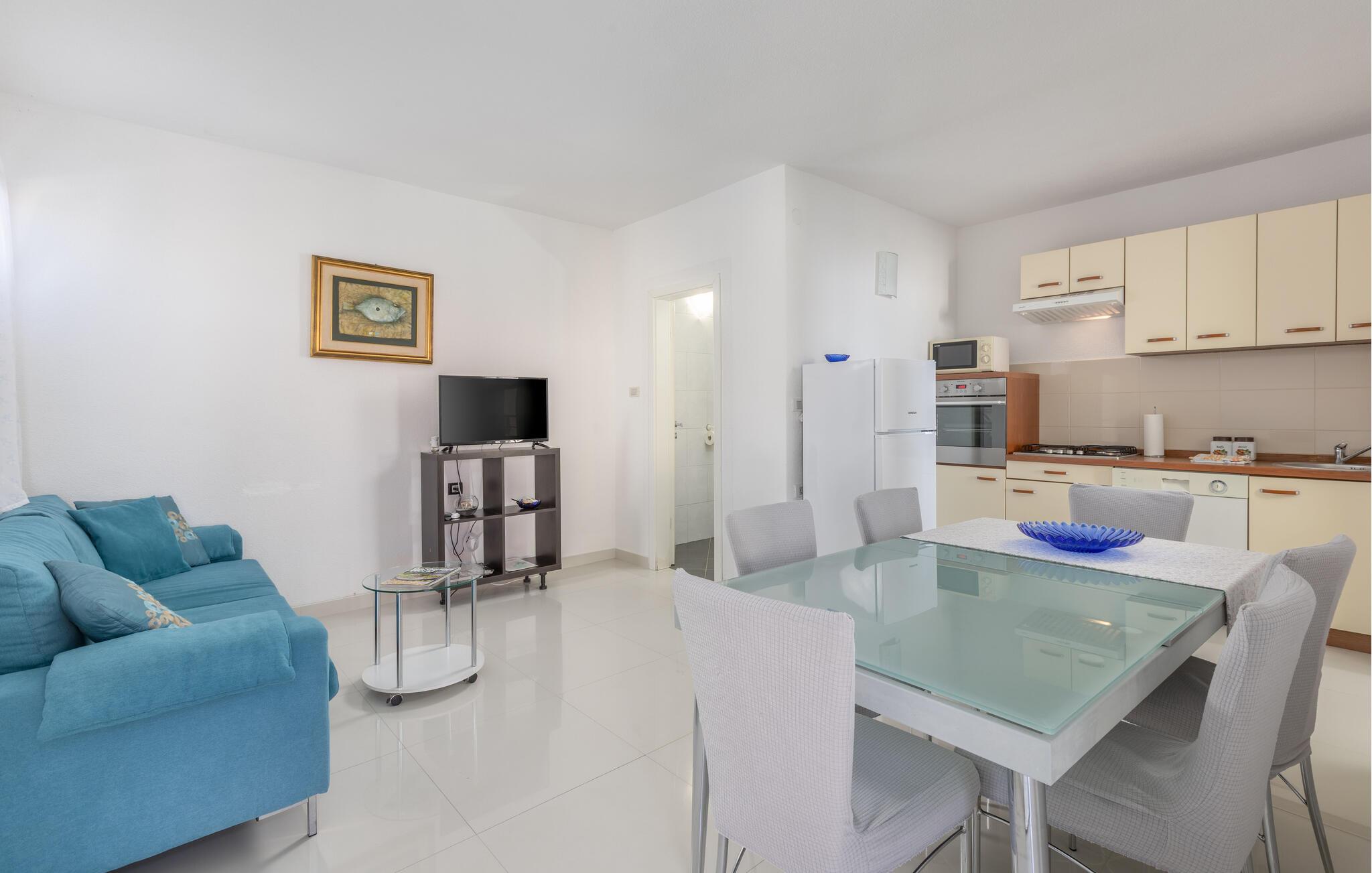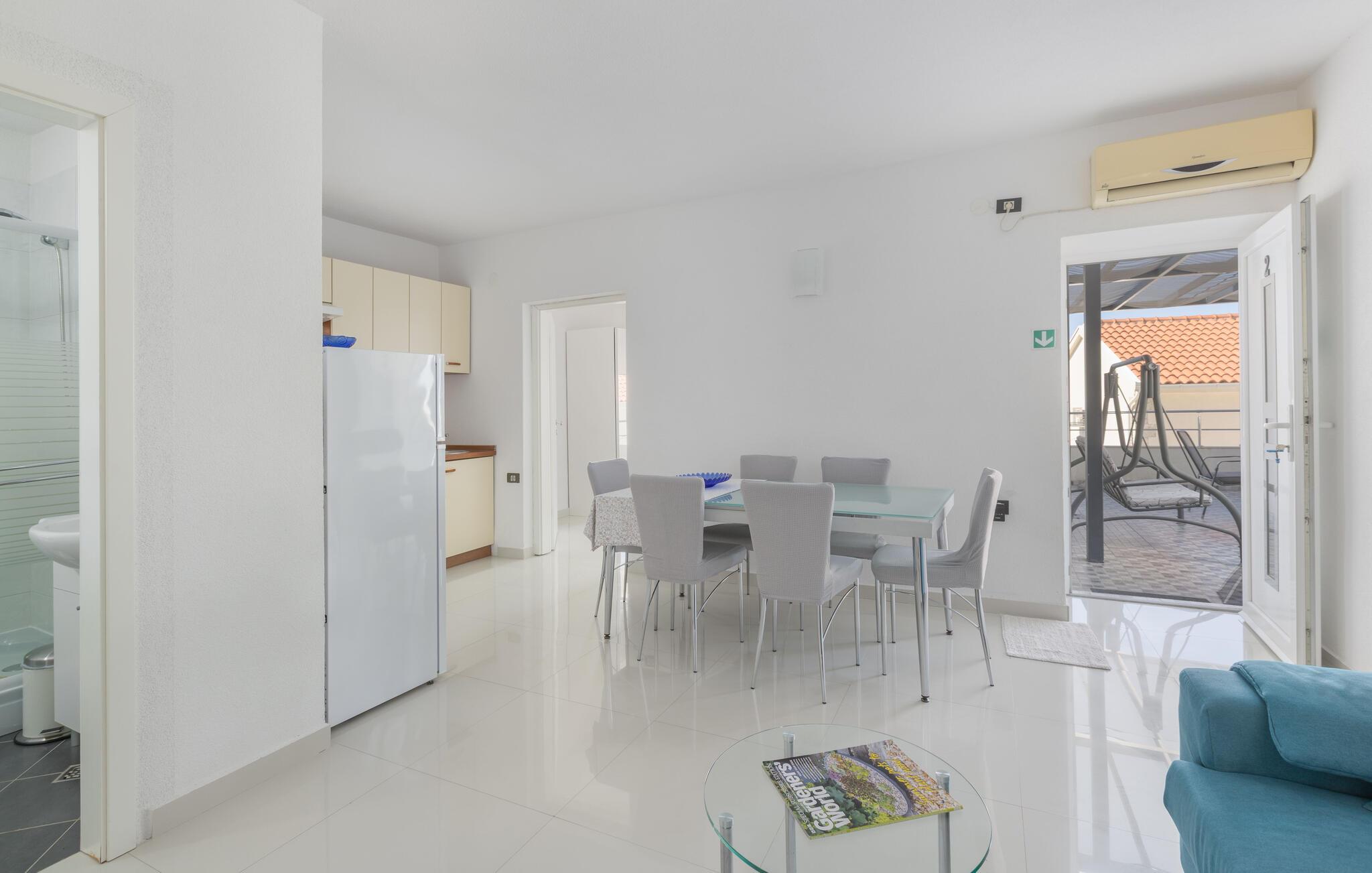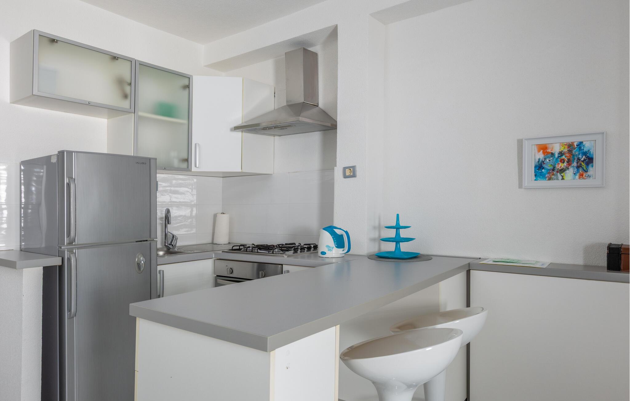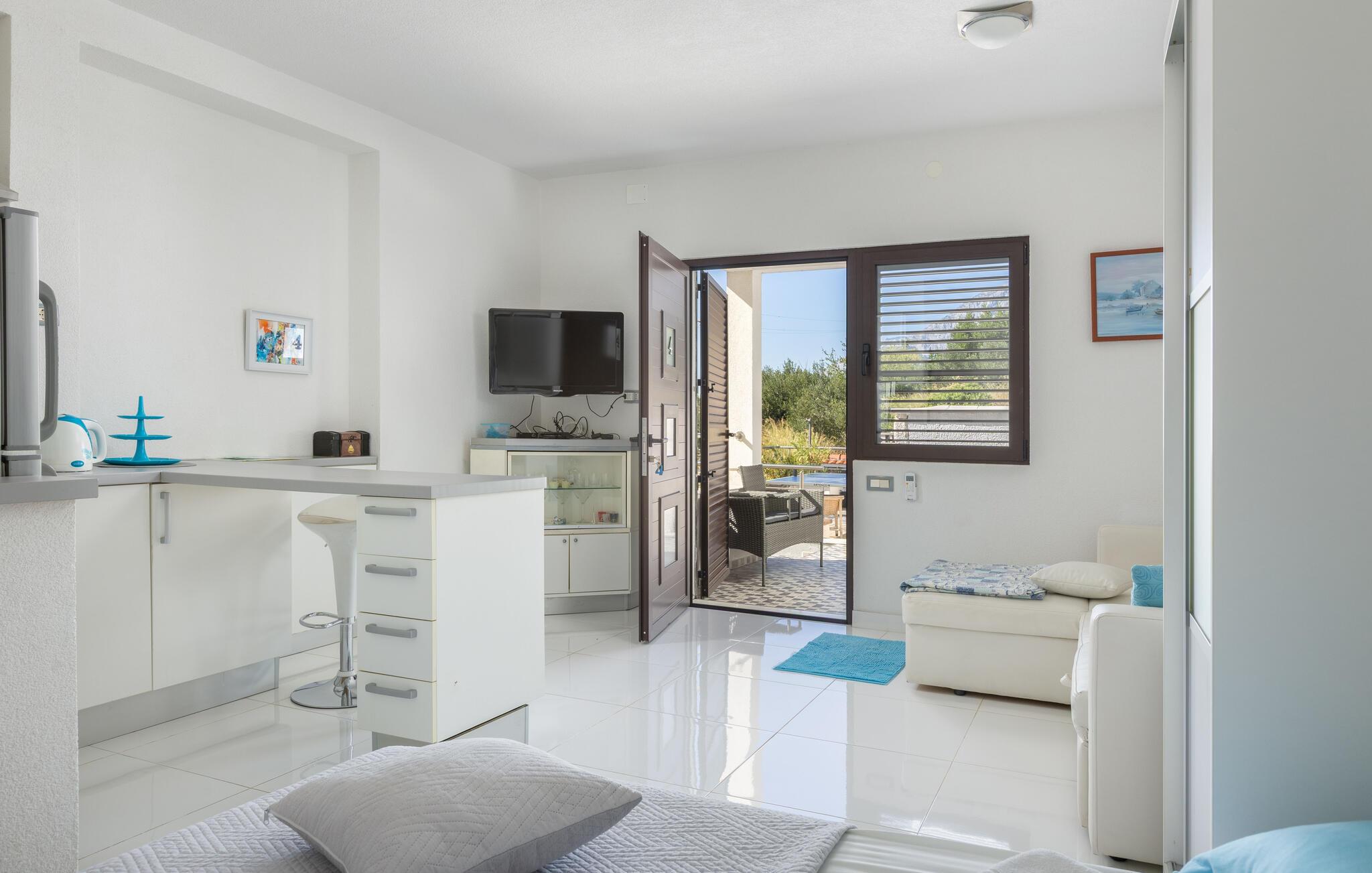 På en bakketop i byen Podgora, neden for nationalparken Biokovo, ligger dette hus med pool, som er godt indrettet. Huset fordeler sig på stueplan, første og anden sal, alle forbundet med udendørs trapper. I stueplan og på første sal er der køkken i åben forbindelse med stuen, to soveværelser og to badeværelser, mens der er tre yderligere soveværelser og et badeværelse på anden sal. Flere enheder har indgang udefra. Forfrisk jer i poolen, og slap af i whirlpoolen på terrassen på første sal. Her er også et aktivitetsrum og et udendørs køkken. Om aftenen kan I slentre gennem byen eller spise aftensmad på en af de gode restauranter. Podagras centrum, 2 km væk, har lange kiselstrande og meget at se og opleve.