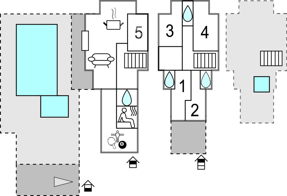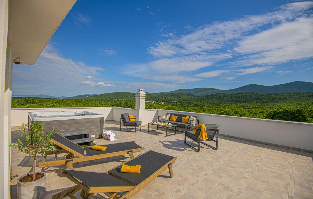 Huset har aircondition og består af en stueetage med køkken, et soveværelse, badeværelse og fritidsrum med billard, bordfodbold, bordtennis, dart, Playstation og en sauna ved siden af. En intern trappe fører til 1. sal med yderligere fire soveværelser og tre badeværelser. På 2. sal er der en rummelig terrasse med en mini-bar, et spa til afslapning og sidst men ikke mindst en uforglemmelig udsigt over byen Imotski og søerne i området.