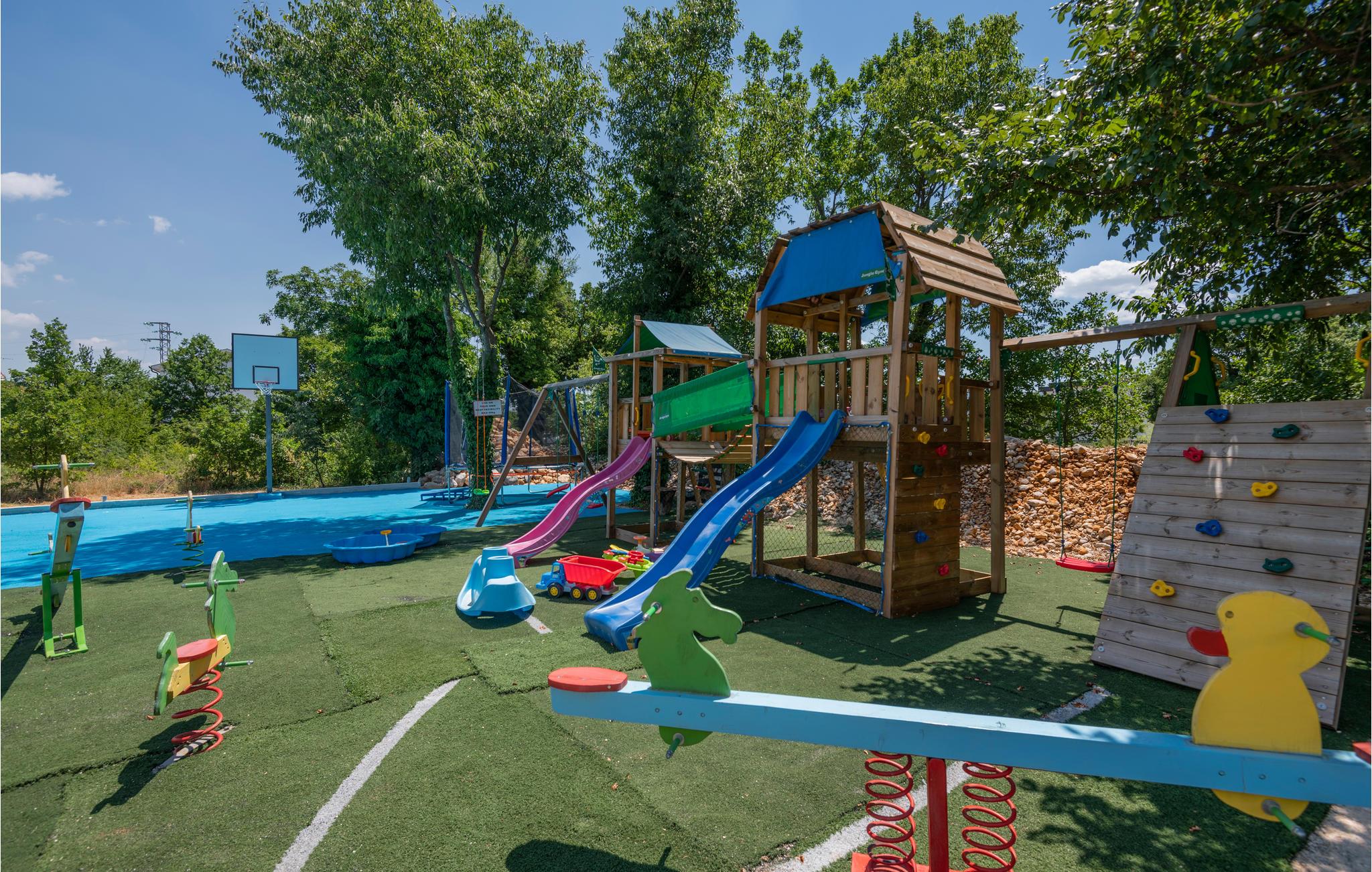 Huset byder på en overdækket terrasse med grill og swimmingpool, omgivet af den velplejede have. Der er også lagt op til en masse sjov på multifunktionsbanen til tennis, fodbold og basketball.