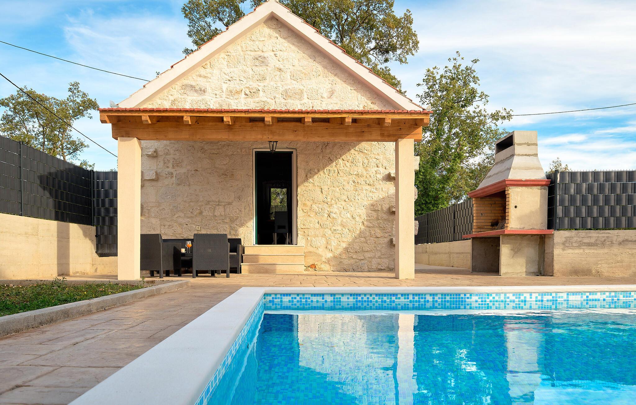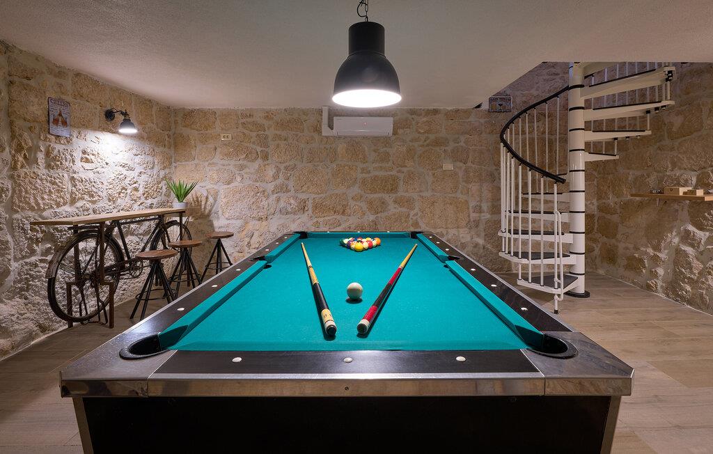 Huset er stort og smagfuldt og ligger ganske vidunderligt i baglandet til kysten. Indretningen er gennemtænkt på husets to etager, hvor de rustikke stenvække mødes med moderne faciliteter og skaber en virkelig rar atmosfære, der understøttes af den kærlige udsmykning. Den står på mange sjove timer i aktivitetsrummet med billard og dart, og i haven lokker poolen til mange friske dyp i løbet af dagen. Om aftenen kan I tilberede familiens livretter på murstensgrillen og lade en varm sommeraften gå på hæld med en drink under stjernehimlen.