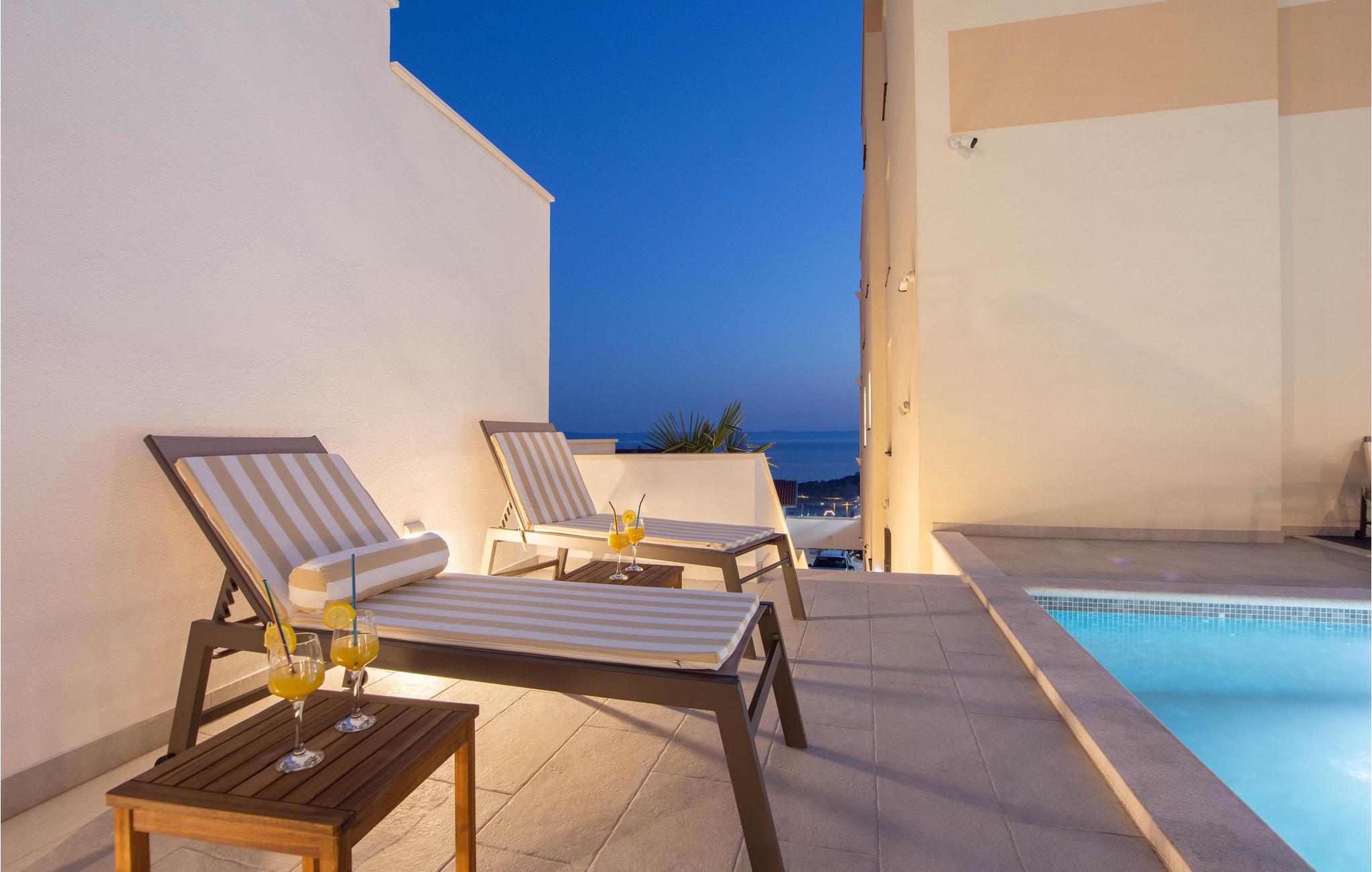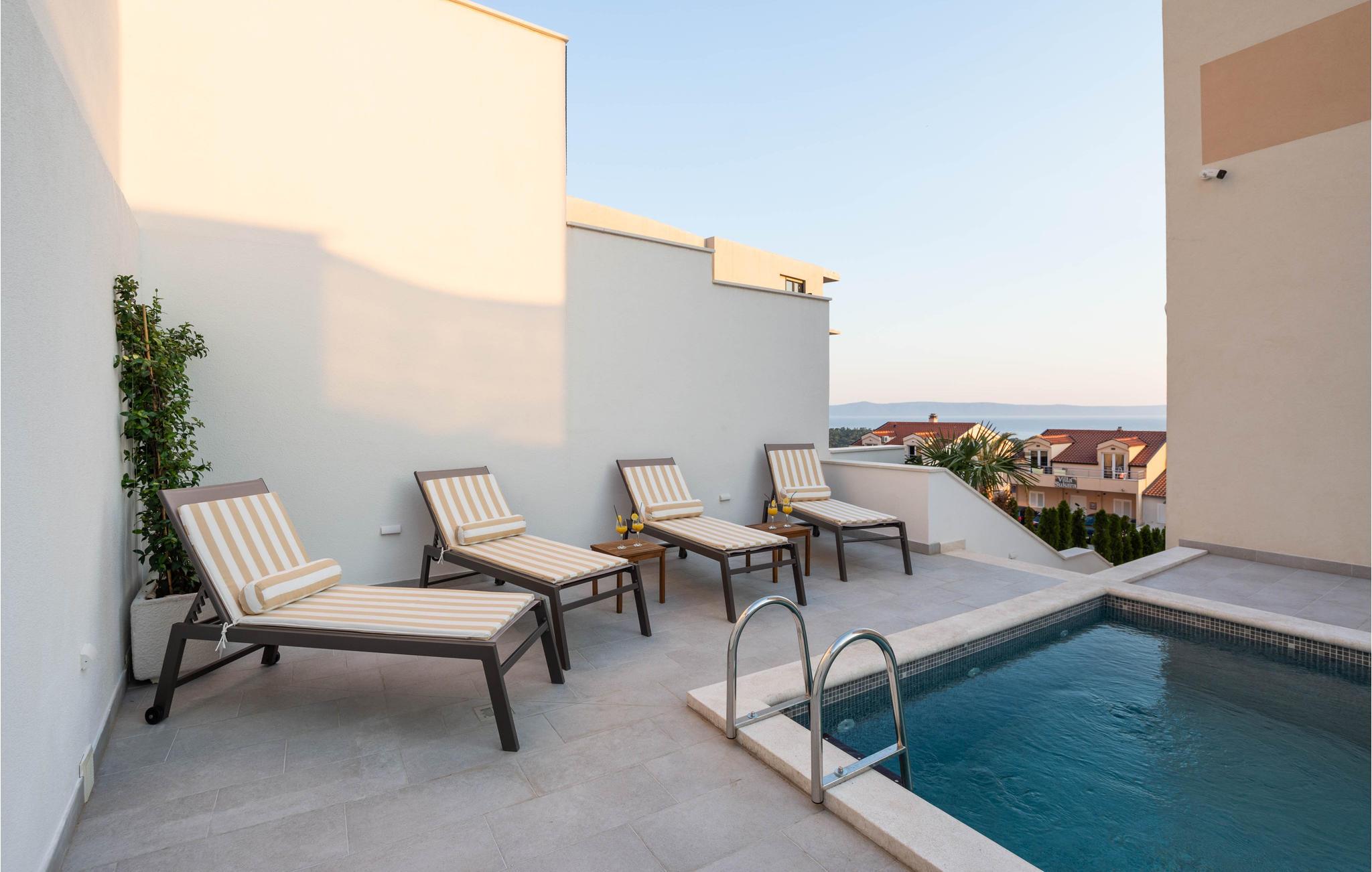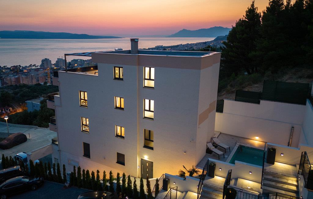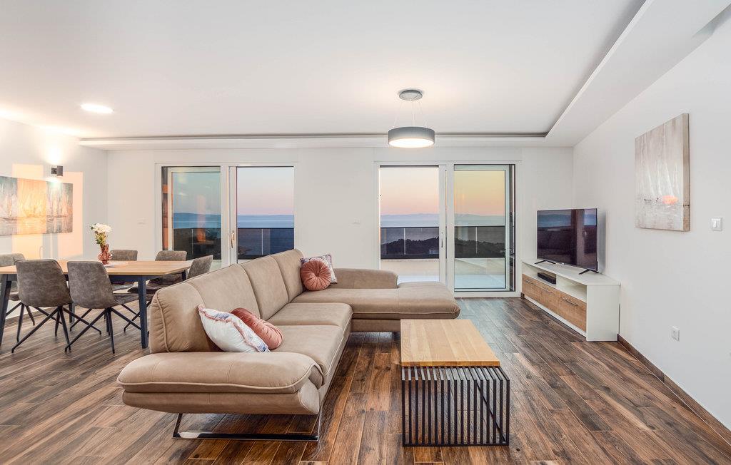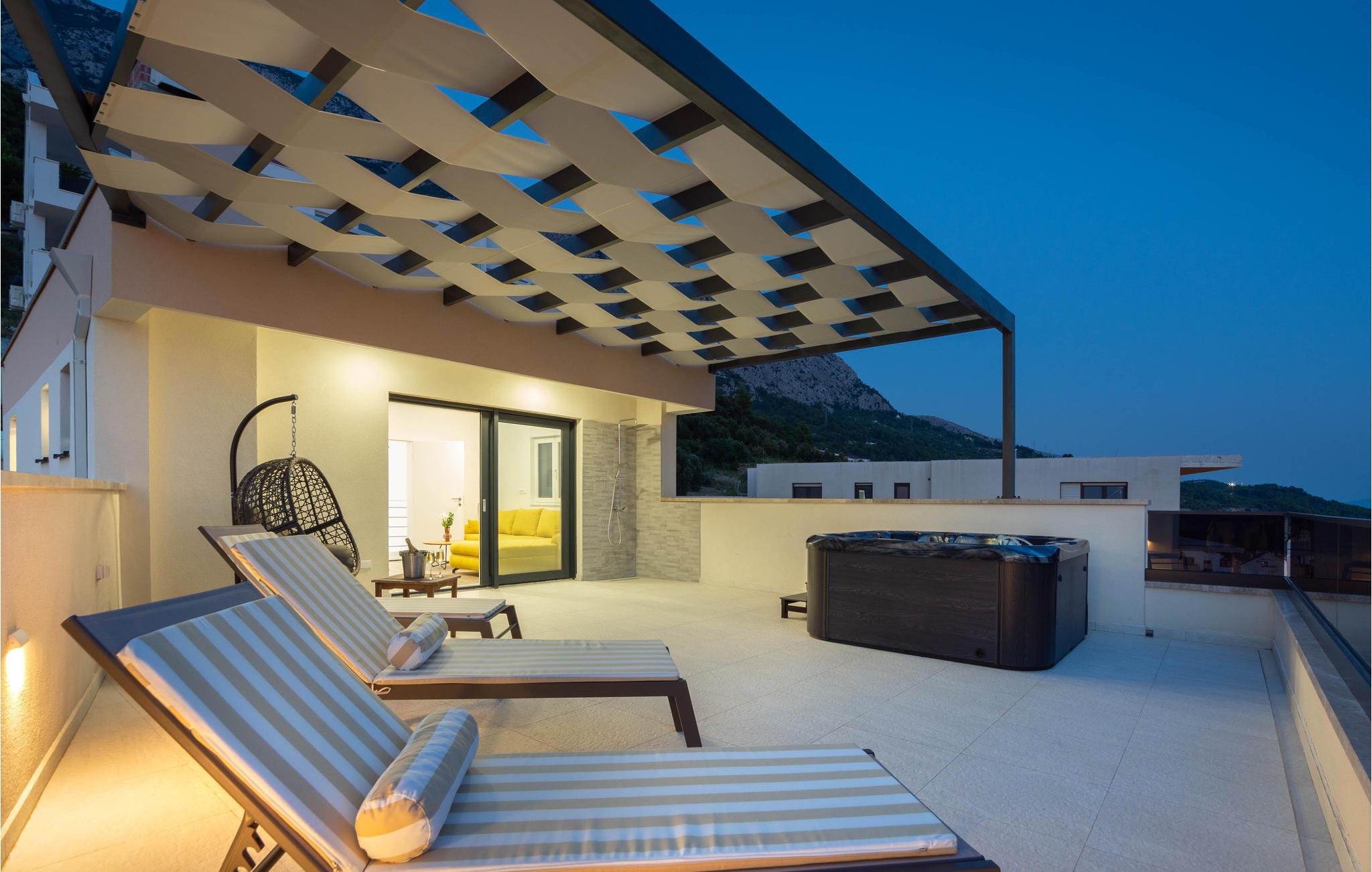 Planlægger I en ferie med familien? Så har I fundet jeres drømmebolig her. Denne stilfulde lejlighed i et moderne hus troner over centrum af Makarska. I kan næsten se det som jeres private hotel. Antallet af soveværelser, badeværelser og toiletter sørger for afslapning og privatliv. Den smarte indretning emmer af hygge, og den smagfuldt indrettede stue giver jer også mulighed for at lave noget i huset sammen med familien. Faciliteterne i huset fuldendes af et fitnessrum og et fritidsrum.
