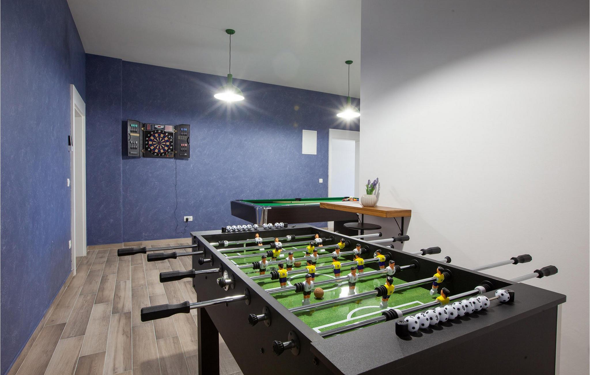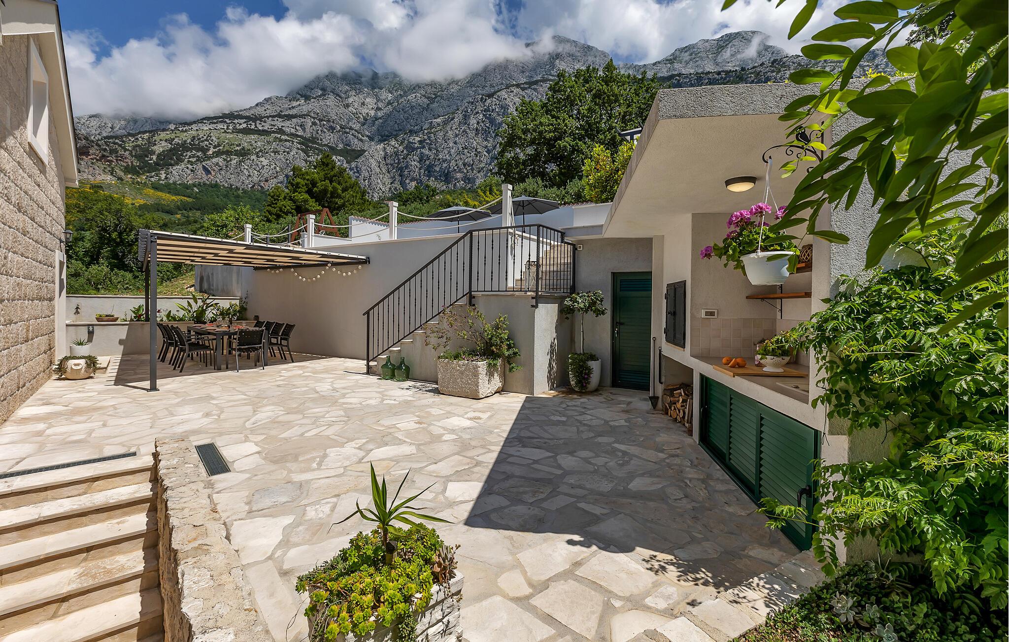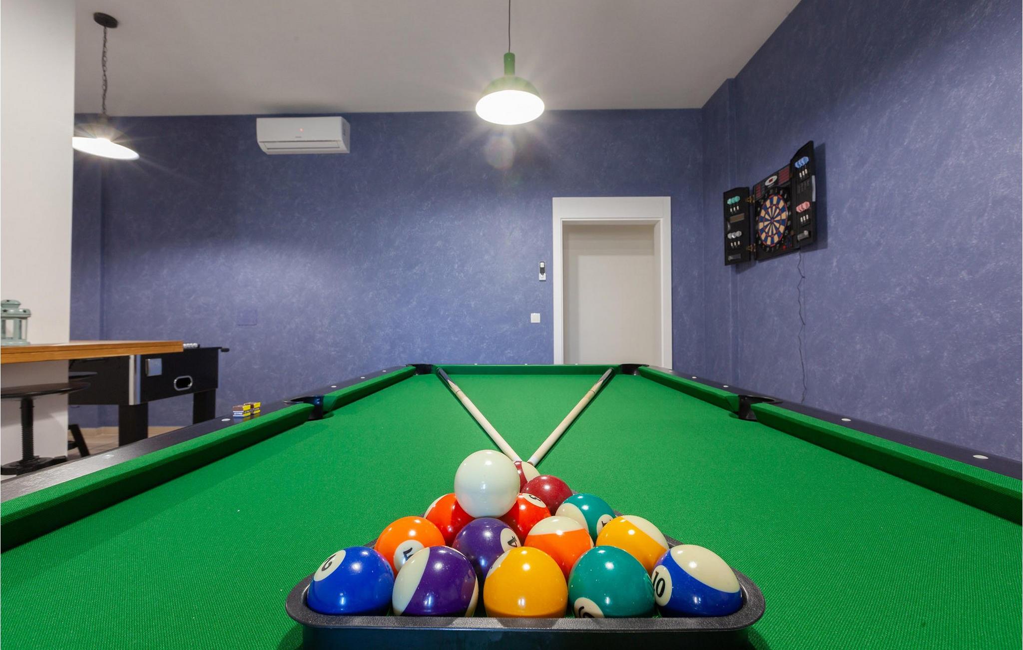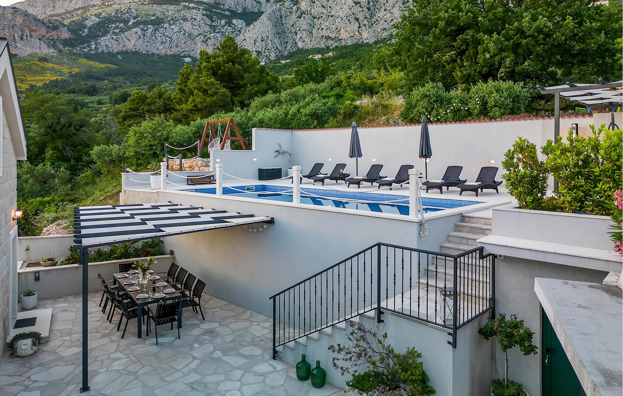Tilbring en uforglemmelig ferie i dette rummelige feriehus med pool og havudsigt. Den smukke, luksuriøse Villa Nina i Tucepi byder jer velkommen til en privilegeret, let hævet beliggenhed mellem bjergene og havet. Den betagende med sin vellykkede blanding af rustik komfort og moderne møbler af høj kvalitet, der tilbyder dejlige højdepunkter for alle aldre. Glæd jer til lækre måltider ved det lange træbord, dyst i bordfodbold, dart eller billard, hold jer i form på træningsudstyret, og saml jer til sjove spilleaftener i den indbydende stue eller stream en spændende serie. Talrige diskret skyggefulde terrasser gør også spisning udendørs til en behagelig oplevelse. Lad batterierne op på en liggestol, mens børnene morer sig med de udendørs legefaciliteter. Nyd fantastiske solnedgange med et glas vin, glæd jer til forfriskende dukkerter i poolen, som med sin atmosfæriske belysning også lægger op til at svømme om natten, og fejr jeres tid sammen med hyggelige grillfester. Tag en bådtur, solbad på Tucepis stenstrande og nyd det krystalklare vand, mens I snorkler eller dykker. Bestig Biokovo-bjerget på en vandretur, hvor I vil blive belønnet med en betagende panoramaudsigt, og besøg charmerende kystbyer som Brela eller Baška Voda. Gå en tur gennem farverige markeder og prøv frisk fisk og skaldyr i traditionelle taverner. Bemærk venligst: Ejendommen accepterer ikke ungdomsgrupper under 30 år eller polterabender. Sådanne bookinger kan blive afvist eller annulleret uden refusion, selv ved ankomst eller under opholdet.