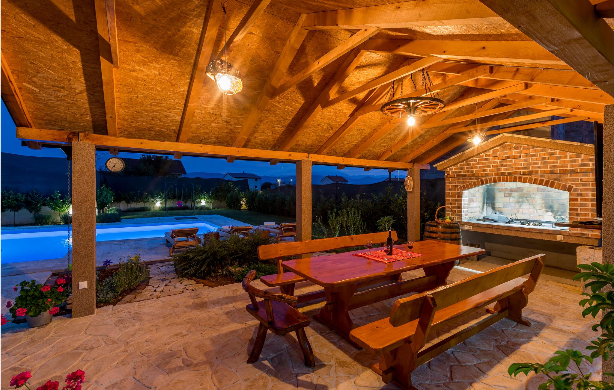 Huset er indrettet med et hyggeligt, rustikt interiør, fine faciliteter, og alle etager er forbundet med indvendige trapper. Der er ligeledes masser af muligheder på den indhegnede grund, for det store udendørsområde har både pool, boblebad, legestativer og en overdækket spiseplads med grill.