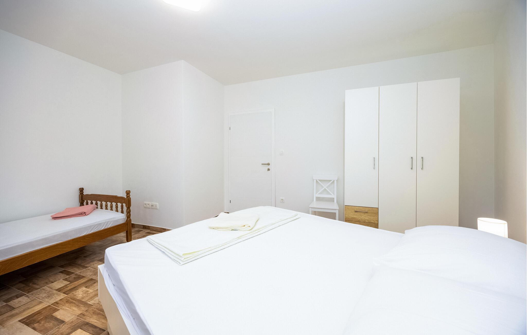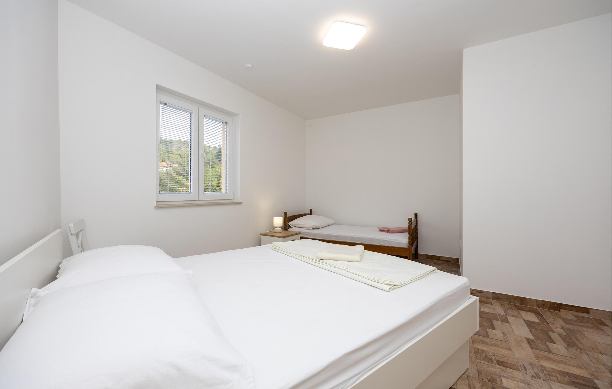 Denne ferielejlighed giver jer en særlig pause på en idyllisk grund omgivet af smuk natur. Den lyse og praktiske indretning samt det lysfyldte miljø skaber et behageligt fristed, hvor I kan nyde roen og slappe helt af. Balkonen med indgangsområde indbyder til afslappende stunder med et glas vin – prøv de lækre vine og lokale produkter direkte fra Rebic-vingården og oplev regionens autentiske charme.