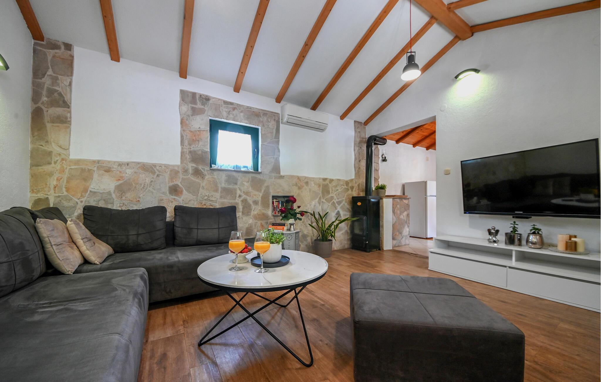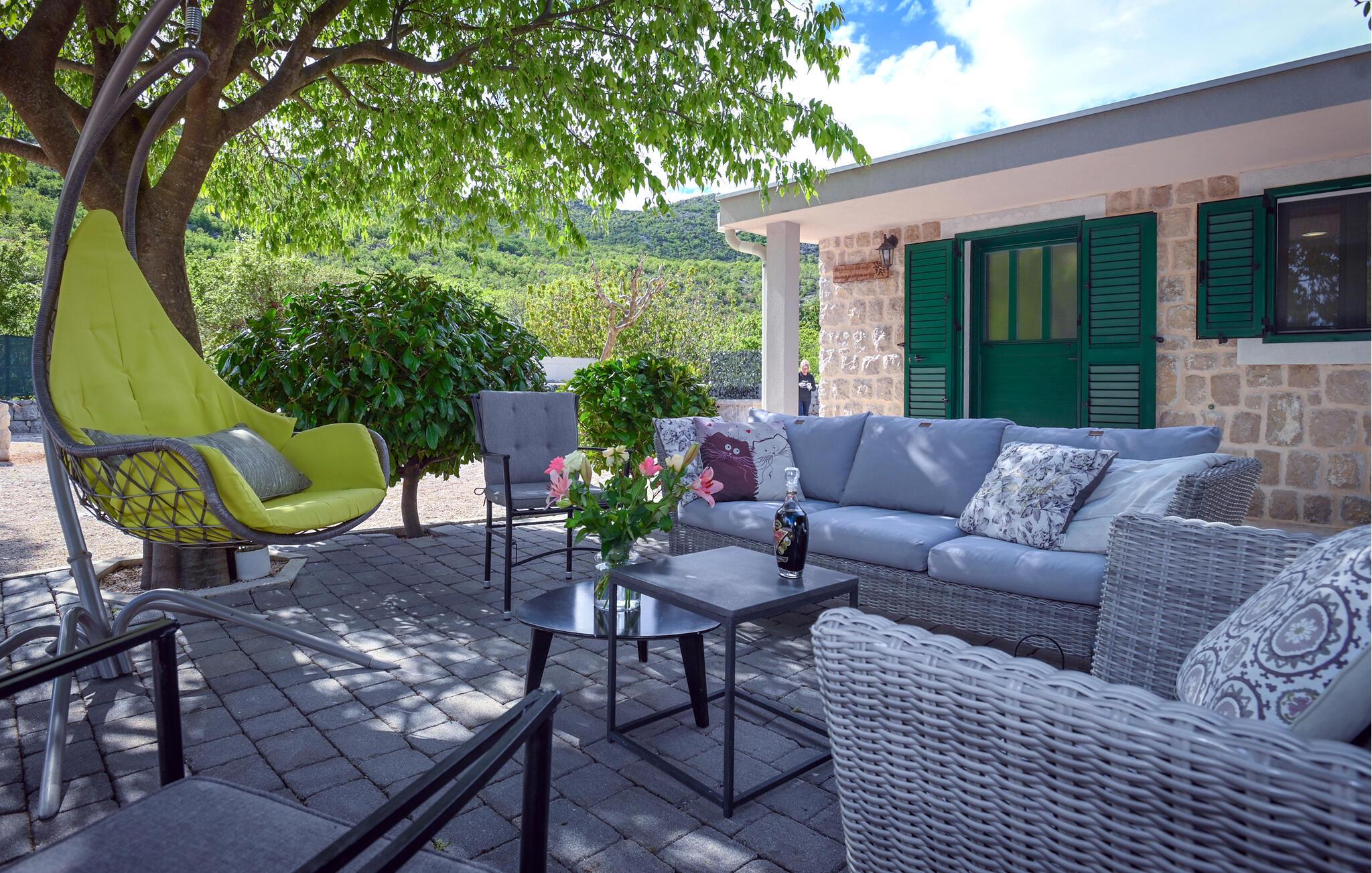 Sie sind an der richtigen Stelle, wenn Sie eine malerische Villa abseits der Massen suchen, umgeben von Natur und mit fantastischen Annehmlichkeiten für die Kinder und sich selbst. Die Villa Silentio Dalmatia ist eine ideale Ferienvilla für bis zu 5 Personen mit privatem Pool. Neben dem beheizbaren Pool, der zweifelsohne das Highlight der Villa ist, können Sie sich auf den bequemen Sonnenliegen entspannen während die Kinder auf dem Trampolin oder Tischtennis spielen. Am Morgen können Sie Ihre erste Tasse Kaffee genießen und sich im natürlichen Schatten auf den Gartenmöbeln in guter Gesellschaft entspannen. Auch das Innere dieses einstöckigen Ferienhauses ist sehr ansprechend. Den Gästen stehen ein Wohnzimmer mit voll ausgestatteter Küche und Esszimmer sowie zwei gemütliche und vollklimatisierte Doppelzimmer und zwei Badezimmer mit Dusche zur Verfügung. Fahren Sie mit den vier Fahrrädern der Villa durch die Gegend, bereiten Sie einige hausgemachte Mahlzeiten aus dem Gemüse und Obst zu, das im Öko-Garten der Villa Silentio Dalmatia angebaut wird, grillen Sie wunderbar und genießen Sie einfach Ihren Aufenthalt in Kroatien. Diese Villa ist eine ausgezeichnete Wahl für einen ruhigen Urlaub mit vielen aufregenden Dingen, die es zu tun und zu sehen gibt.Der Name Villa Silentio Dalmatia beschreibt die Lage der Villa perfekt. Es liegt im dalmatinischen Hinterland, genauer gesagt in dem kleinen Dorf Duge Njive, in der Nähe des touristischen Hotspots Makarska. Da die Villa von reiner Natur umgeben ist, bietet sie den Gästen Ruhe und Frieden. Makarska ist eine ausgezeichnete Wahl für einen Familienurlaub, mit vielen aufregenden Aktivitäten und Sehenswürdigkeiten. Die Strände der Riviera von Makarska sind bekannt für ihr kristallklares Wasser und familienfreundliche Strände mit einer Vielzahl an sportlichen Aktivitäten wie Parasailing, Yeti-Skiing und Tauchen. Sie haben eine Menge fantastischer Restaurants zur Auswahl und die pulsierende Stadt ist unglaublich. Wir empfehlen den Besuch des Naturparks Biokovo mit Kroatiens erstem Skywalk, der 1288 Meter über dem Meeresspiegel liegt. Dies ist nichts für schwache Nerven. Wenn Sie also nach einem Adrenalinschub suchen, ist dies der richtige Ort. Die Lage der Villa Silentio Dalmatia ist ideal, da sie nur eine kurze Autofahrt von den großen historischen Städten an der Adriaküste wie Trogir und Split entfernt ist. Perfekt für einen Tagesausflug, um Kroatiens Traditionen und alte Schönheit zu erkunden. Diese beiden Städte stehen sogar unter dem Schutz der UNESCO und sind daher einen Besuch wert. Sie können Kroatiens atemberaubende Küste erkunden, während Sie sich in Ihrer eigenen Villa mit privatem Pool entspannen und die dringend benötigte Ruhe finden.