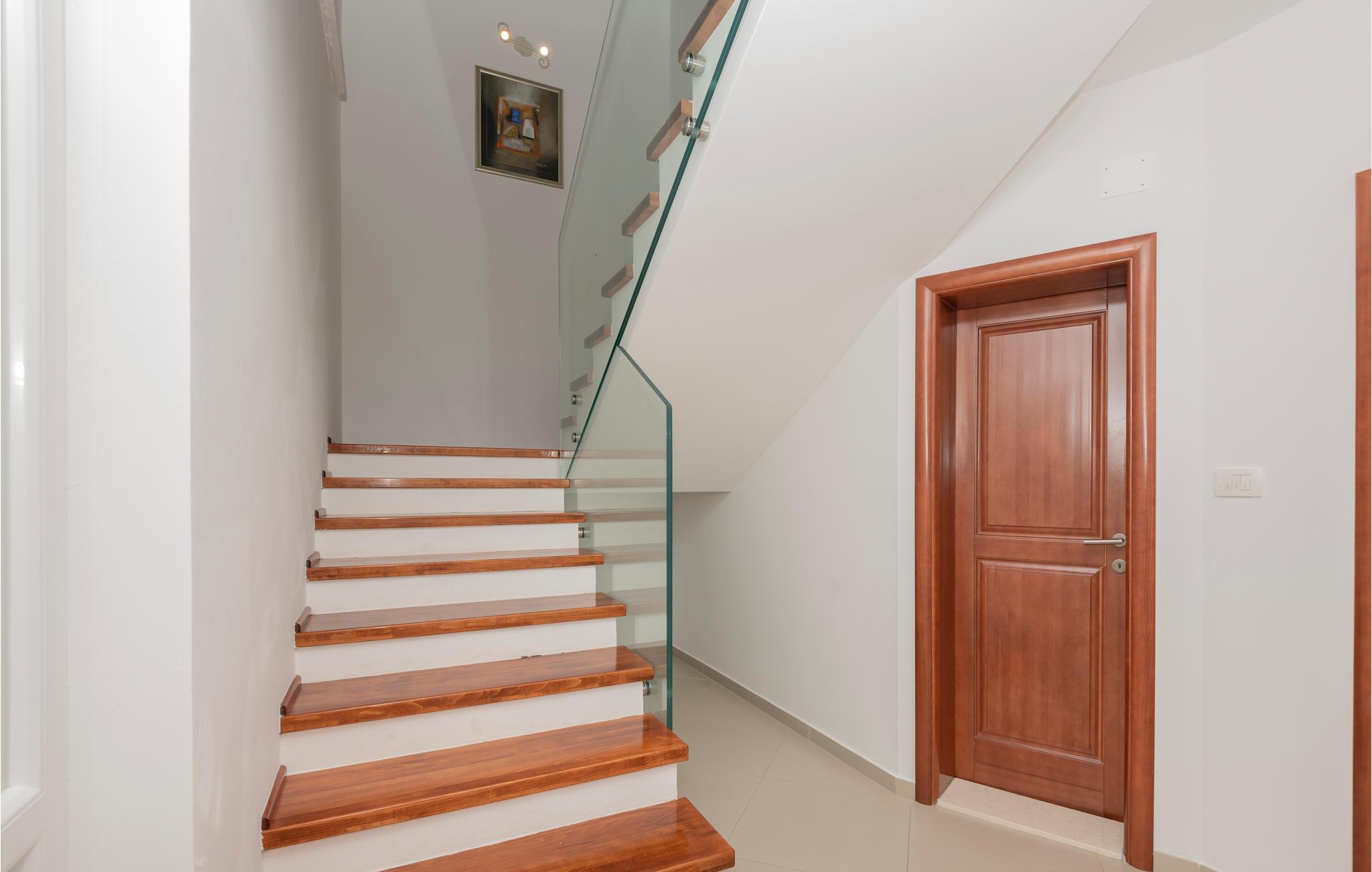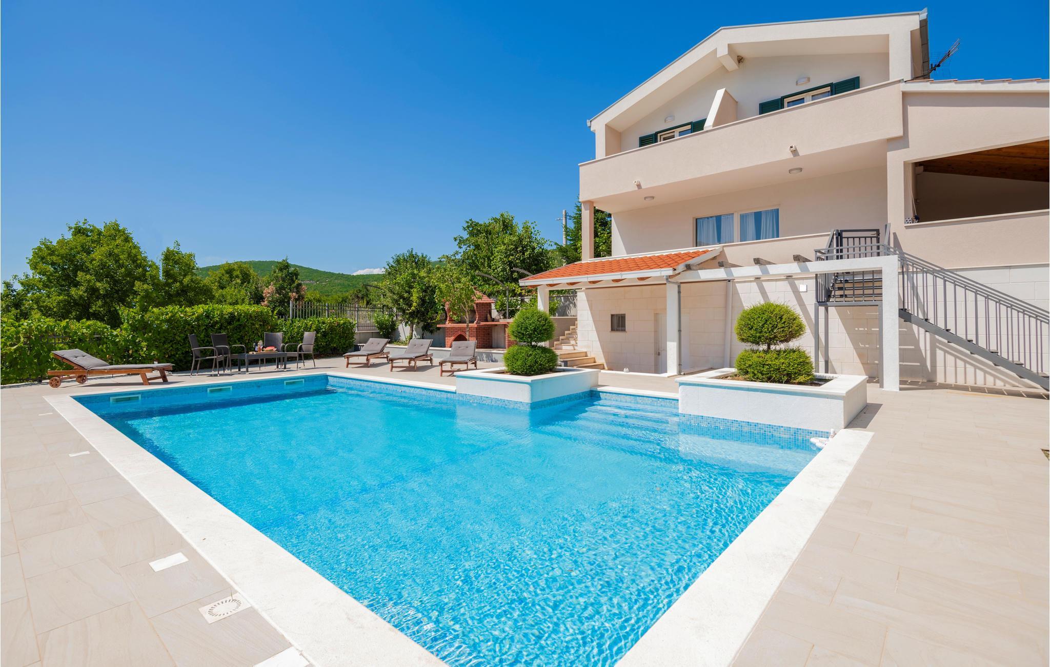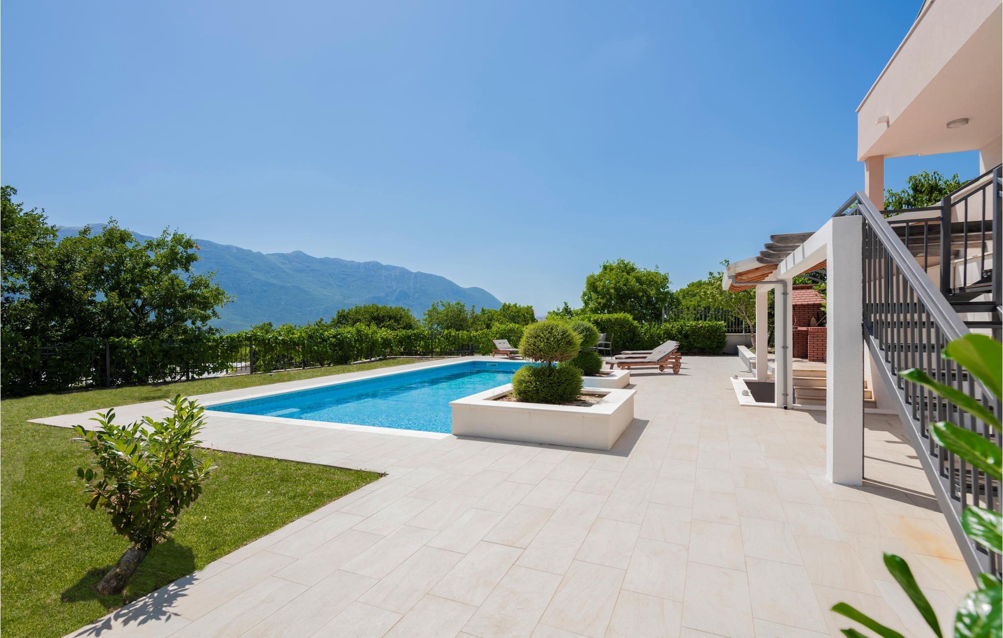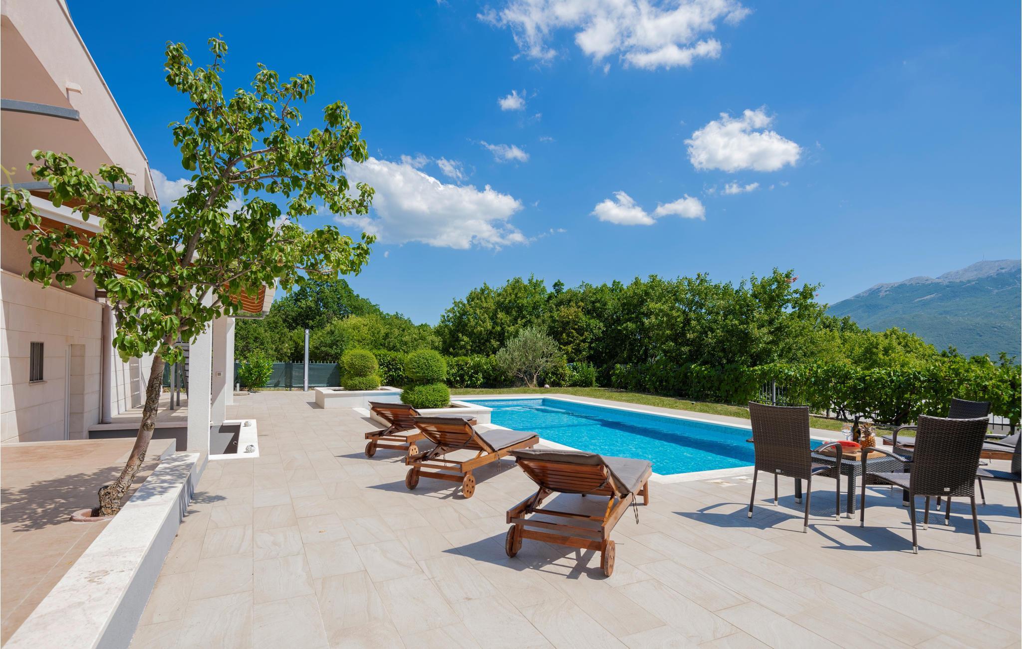 Dette skønt indrettede og godt udstyrede feriehus ligger i Mellemdalmatiens idylliske bagland. Husets indre er fordelt som følger: I stueplan er der køkken i praktisk åben forbindelse med stuen, badeværelse og et aktivitetsrum, samt en legeplads til timer af sjov. En indre trappe fører op til første sal, med tre soveværelser og et badeværelse. Foran huset ligger poolen hvorfra der er den skønneste udsigt over Naturparken Biokovo, mens der bag huset er et dejligt praktisk udekøkken med grill til nem og lækker feriemad. Der er kun femten bil-minutter at køre til de skønne strande i Baska Voda og Brela.
