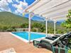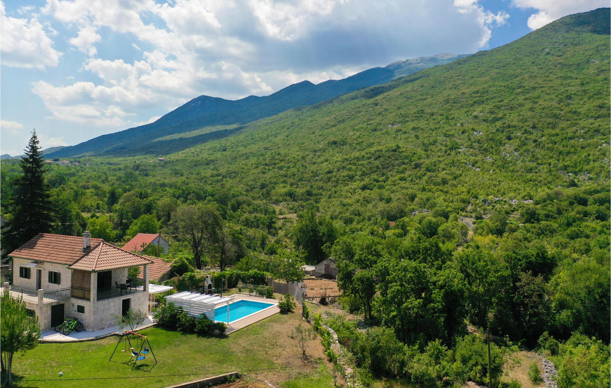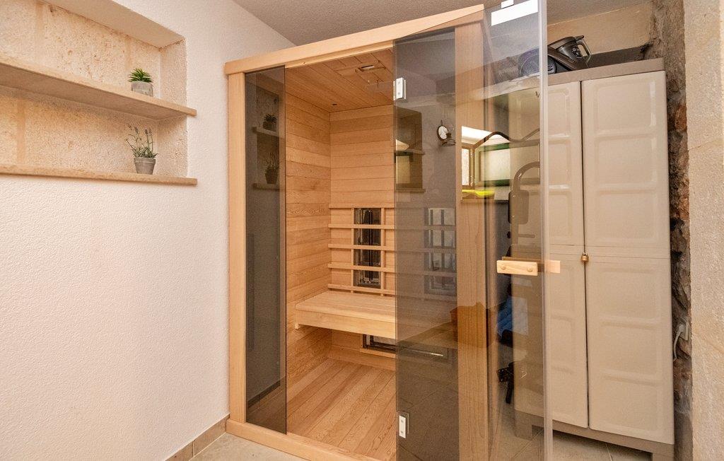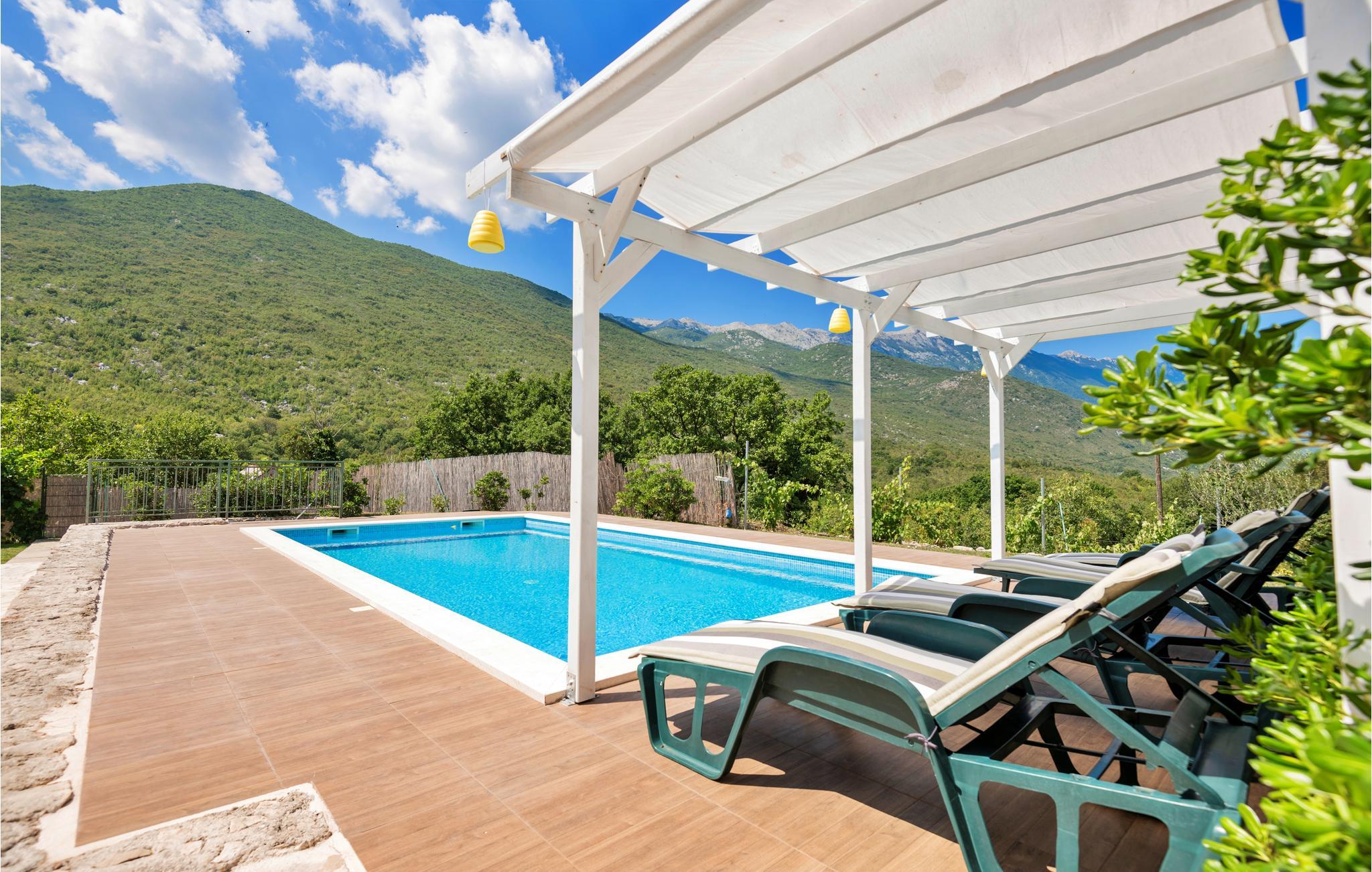 Det er smagfuldt indrettet og strækker sig over to etager, forbundet med udendørs trapper. På terrassen med pool kan I slappe af og forfriske jer på de dejligt lange varme feriedage. Foran huset ligger terrassen hvor grillen står, hvorfra I kan nyde udsigten over den nordlige del af naturparken Biokovo, her er også legeplads og legeredskaber, så I ikke behøver kede jer i ferien. En infrarød sauna findes i fitnessrummet og et udendørs spabad ved poolen.