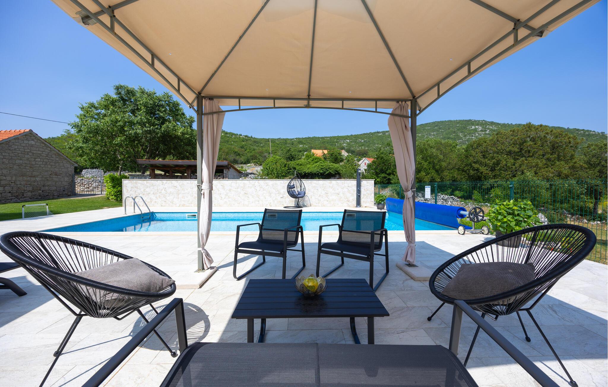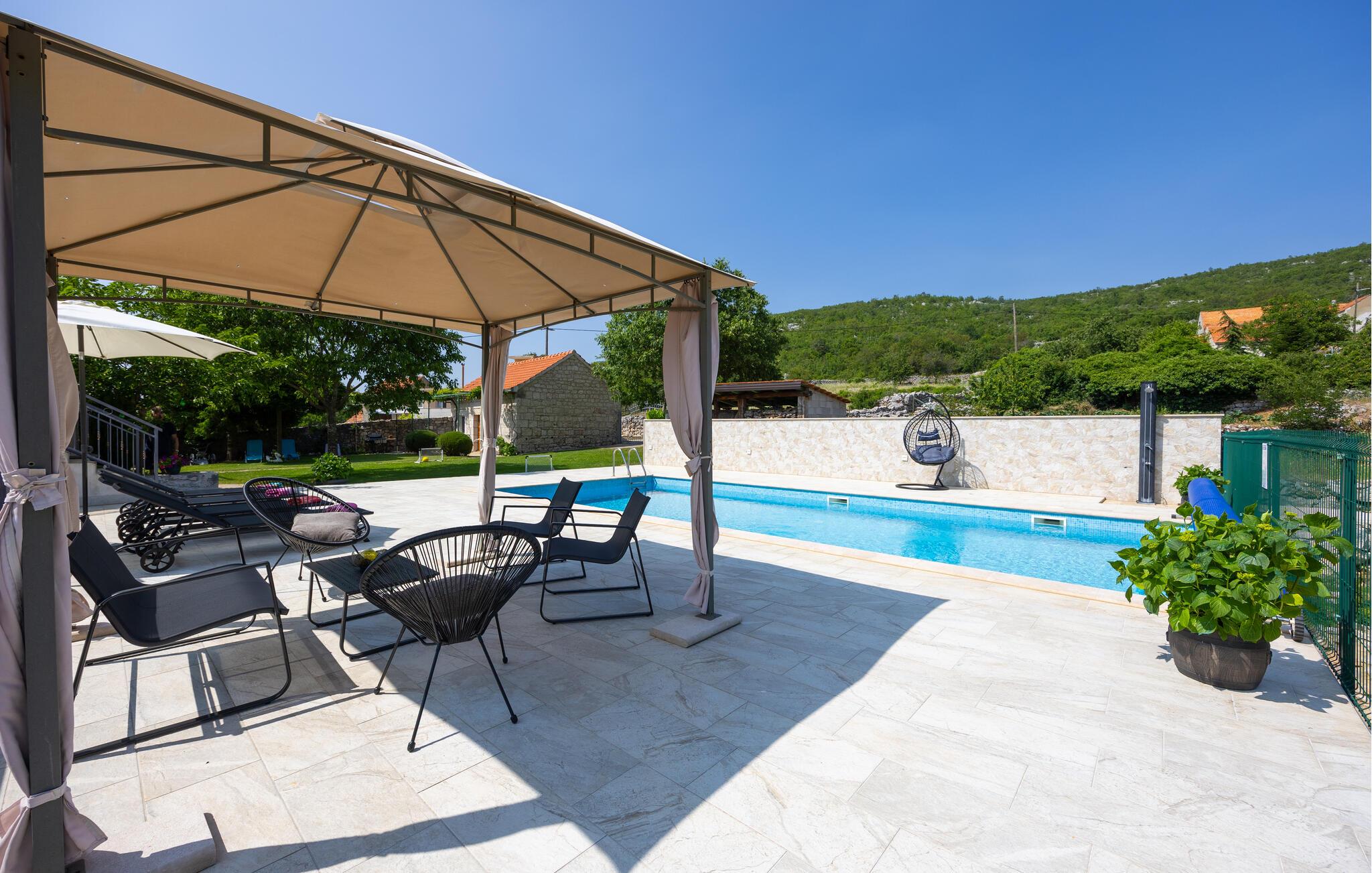 Tilbring dejlige timer på terrassen. Tag et par svømmeture i poolen og nyd varme sommeraftener med kolde drikkevarer under åben himmel.